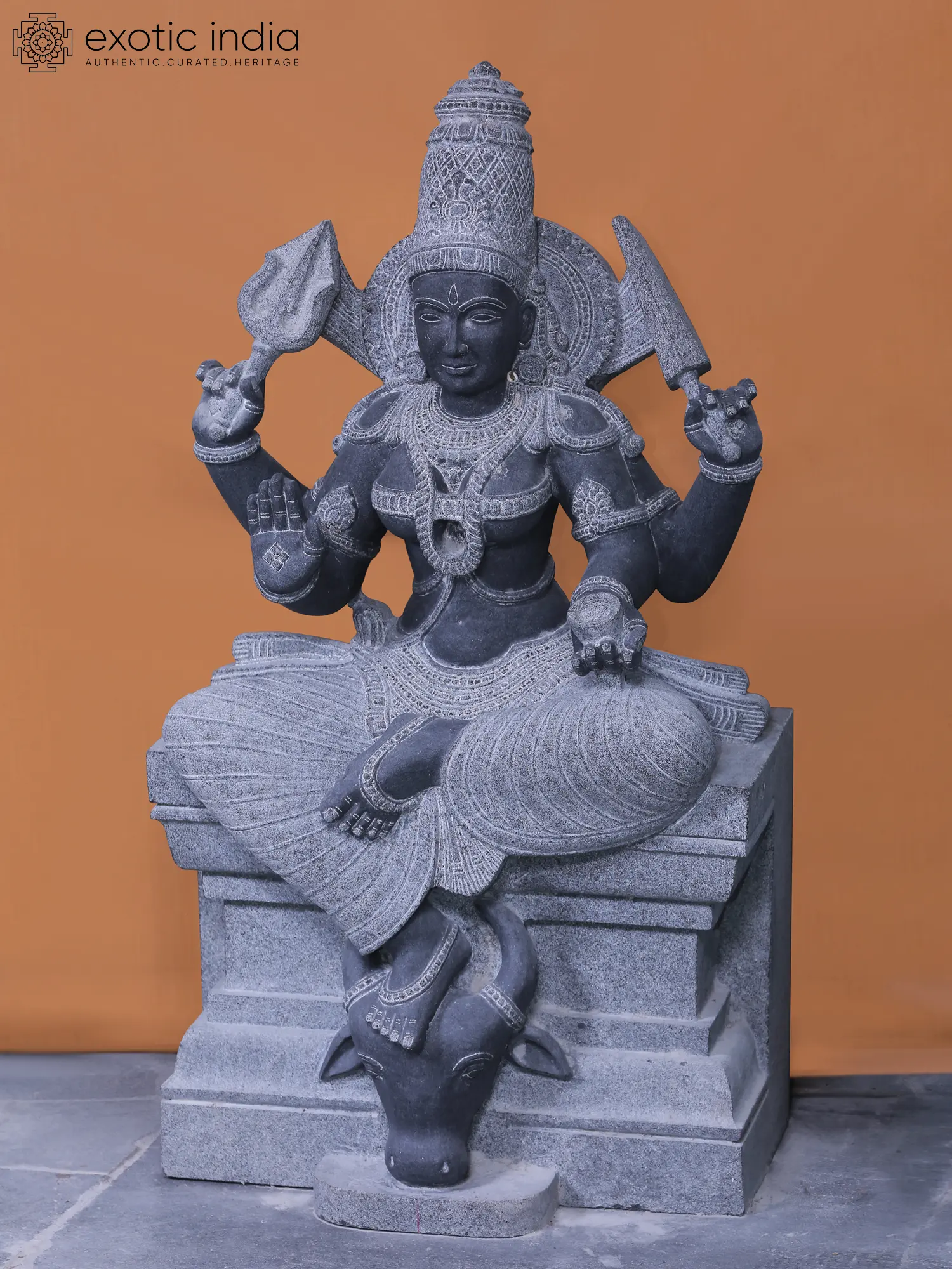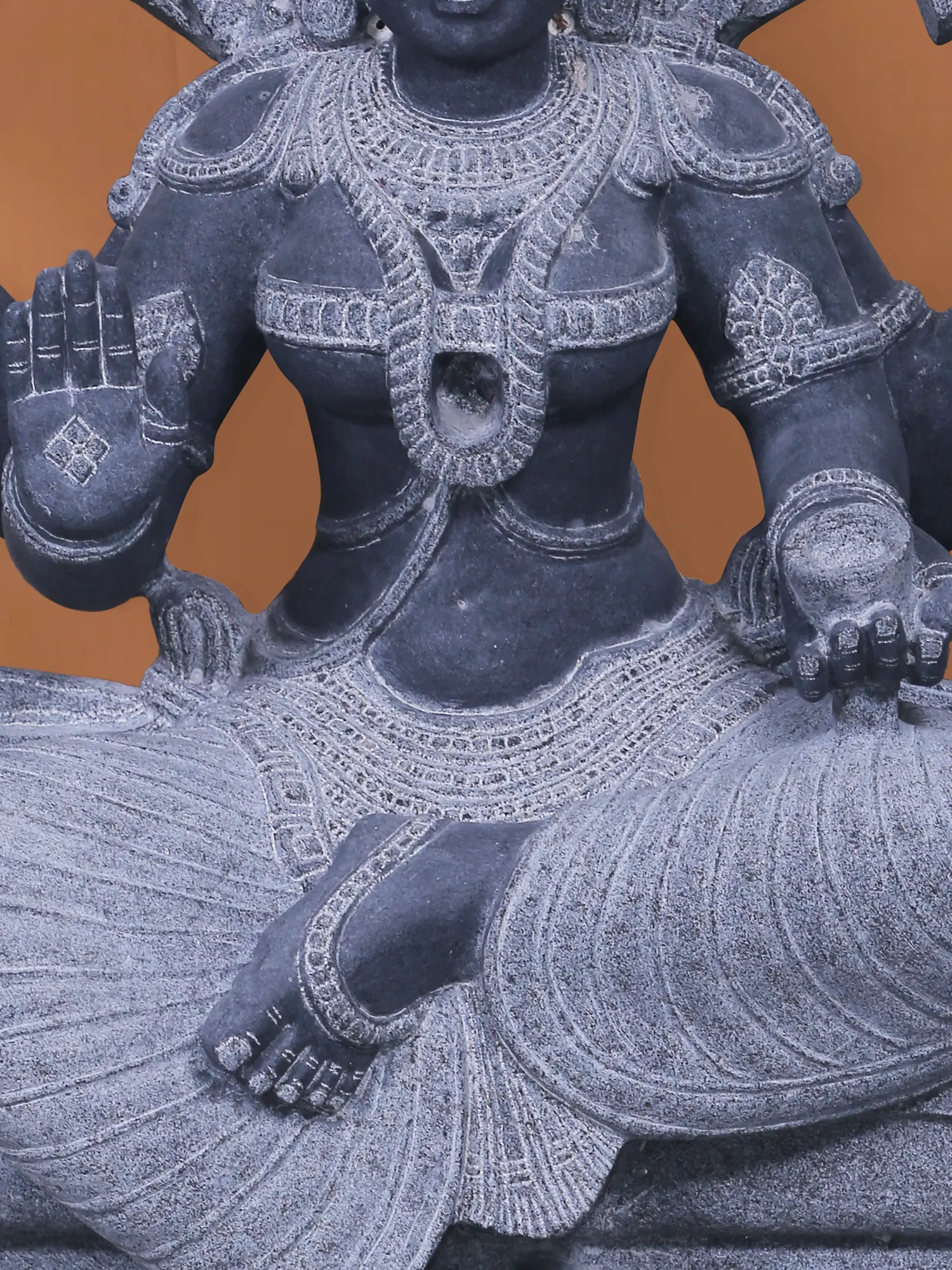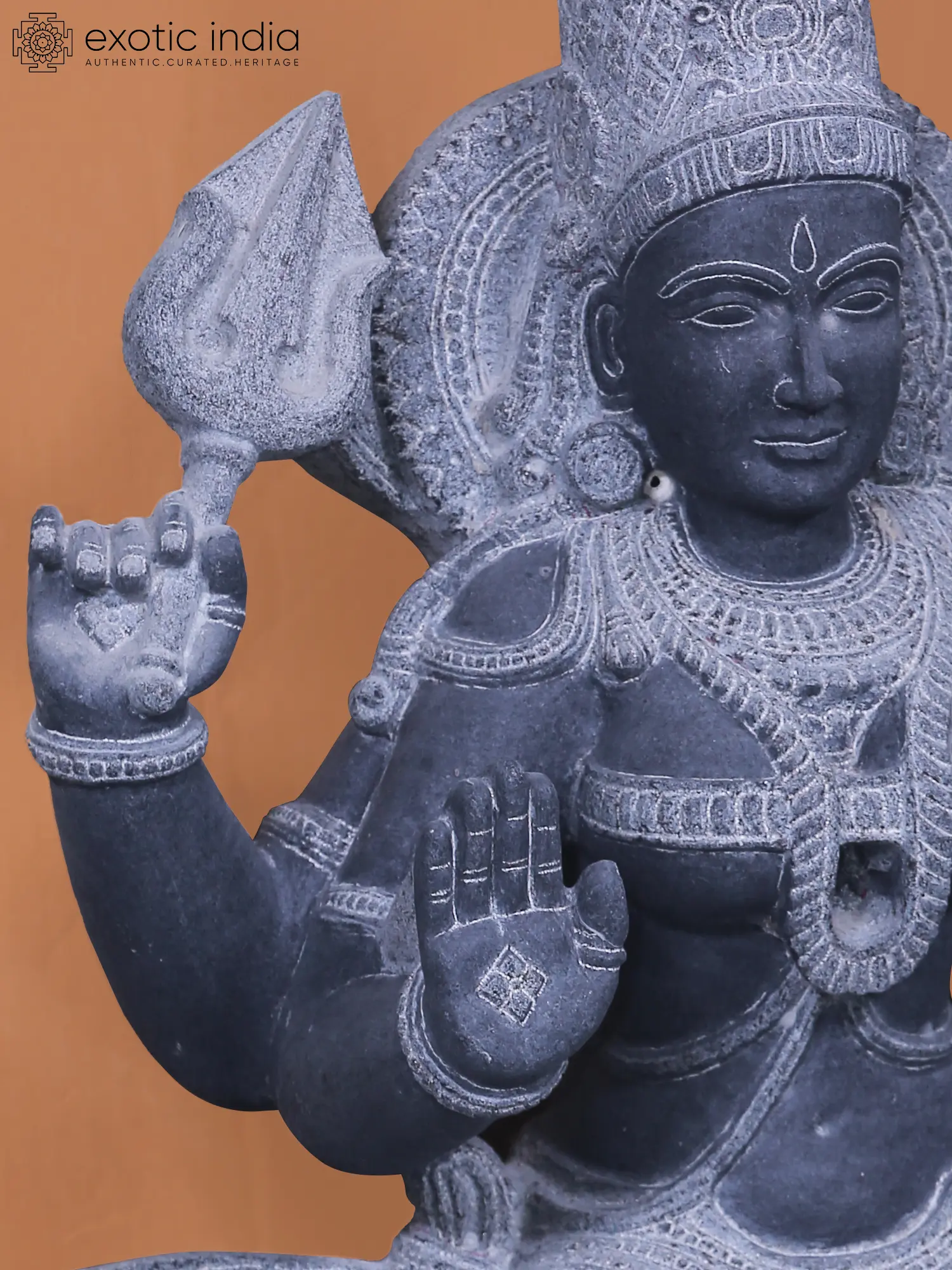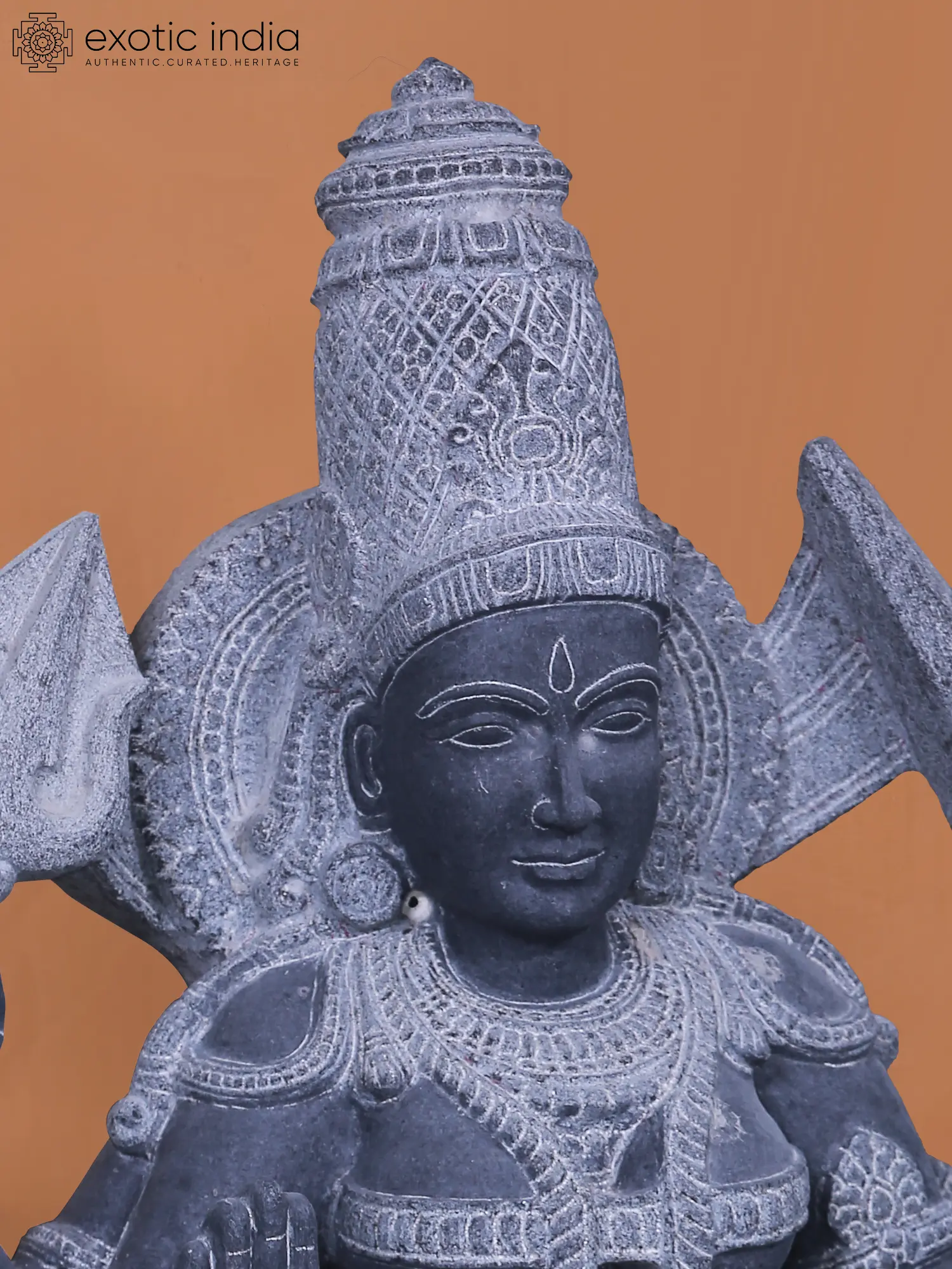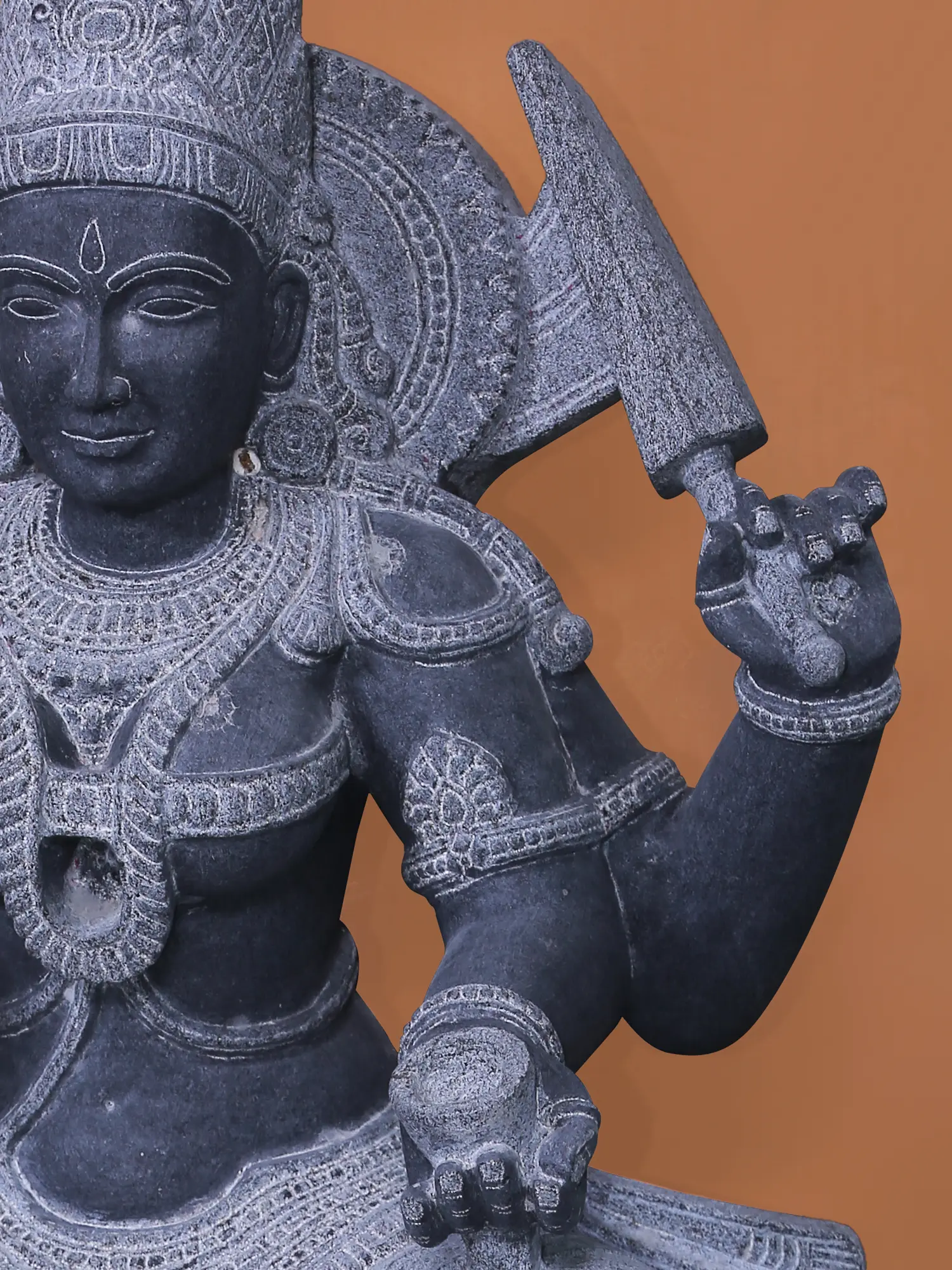 Mariamman, the Tamil goddess revered as a form of the supreme goddess or Adi Shakti, is presented in this beautiful granite statue with attributes of Kali and Durga, symbolizing her supremacy as the divine protectress.