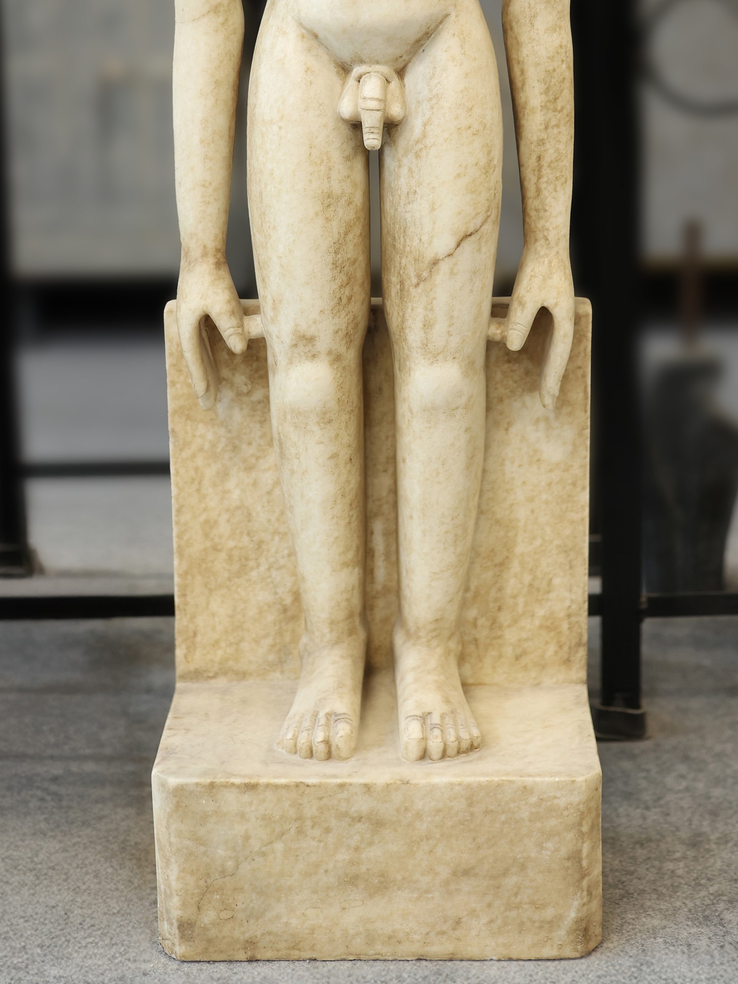Observe the graceful posture, the gentle gaze, and the delicate rendering of the hands. The subtle articulation of the body suggests a divine stillness, while the intricate details, such as the floral emblem on the chest, speak to a profound symbolic language. The cool, smooth surface of the marble invites a tactile appreciation, a connection to the natural world rendered by human artistry. Its substantial form, standing at 39 inches tall, ensures it commands attention with understated elegance.