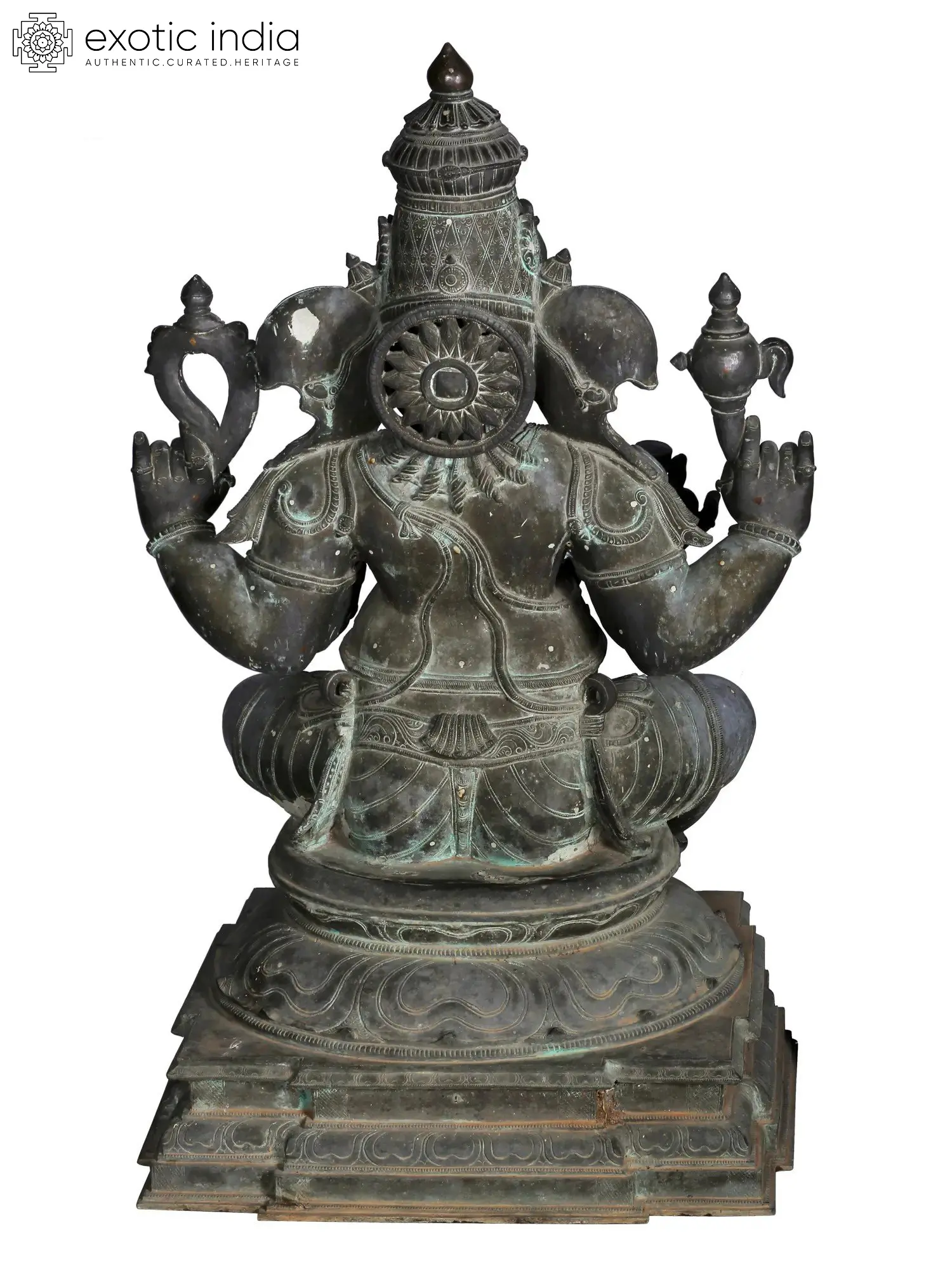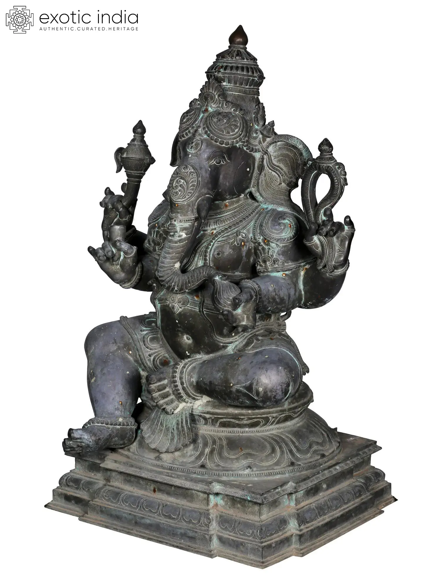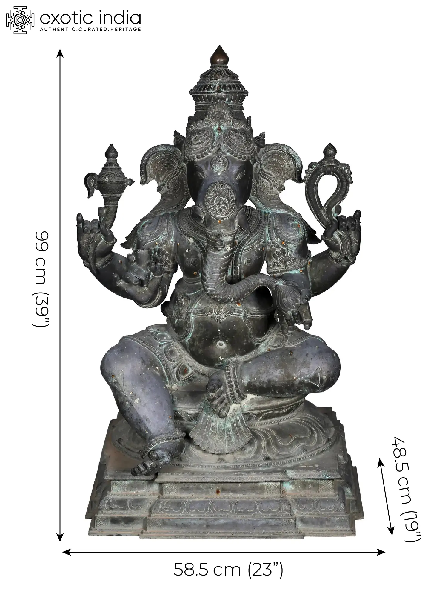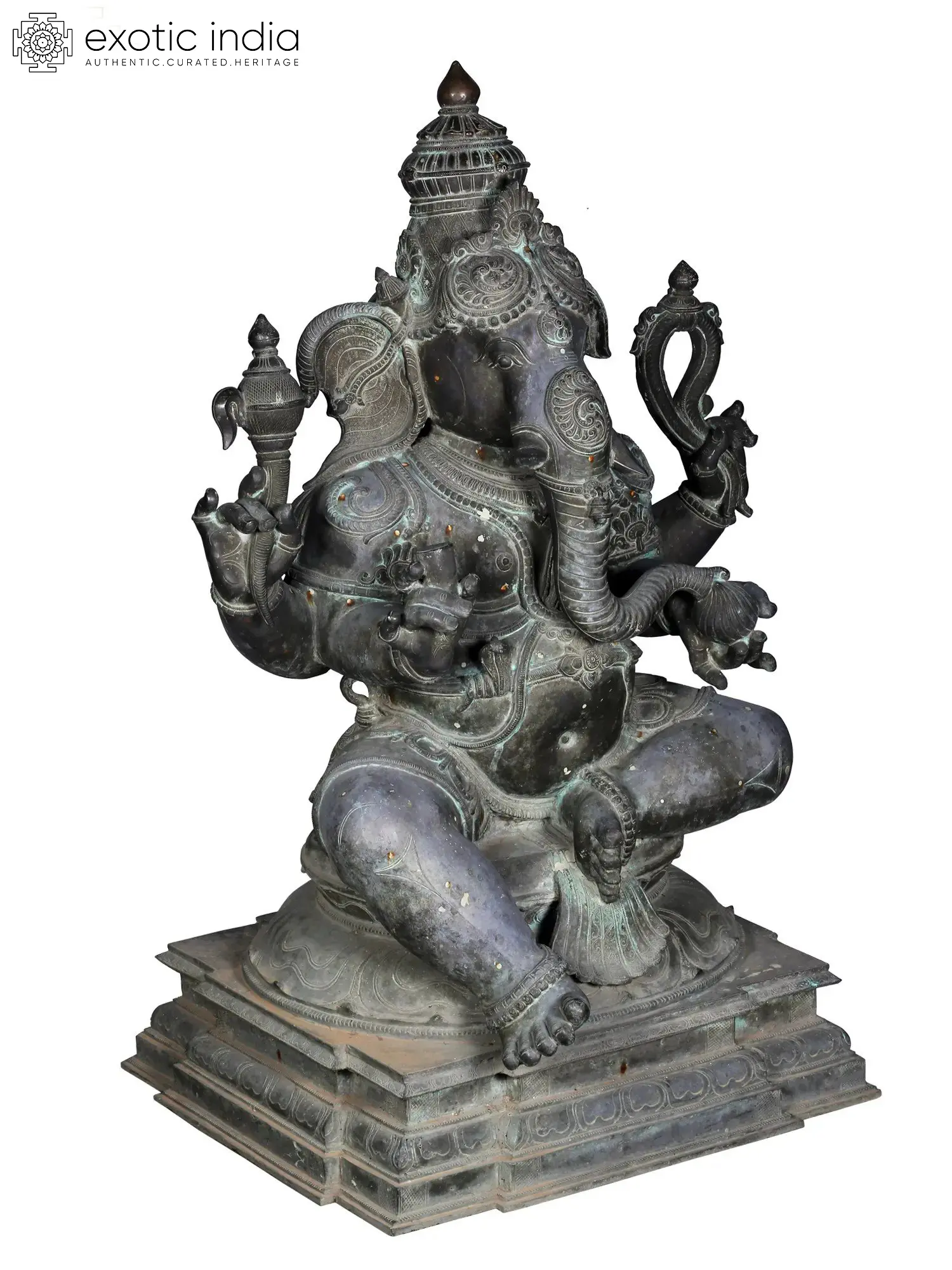 Carved in Panchaloha bronze, this idol of Lord Ganesha stands out for its fine details. Seated comfortably, he holds a Pasa in his right hand, to pull his devotees out of the shallow material reality and an Ankusha, to prevent our negative channelisations! His forehead is decorated with a Tripundra, and the snake around his belly represents the Kundalini. His presence brings harmony and peace, as told by the science of Vaastu.