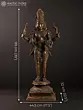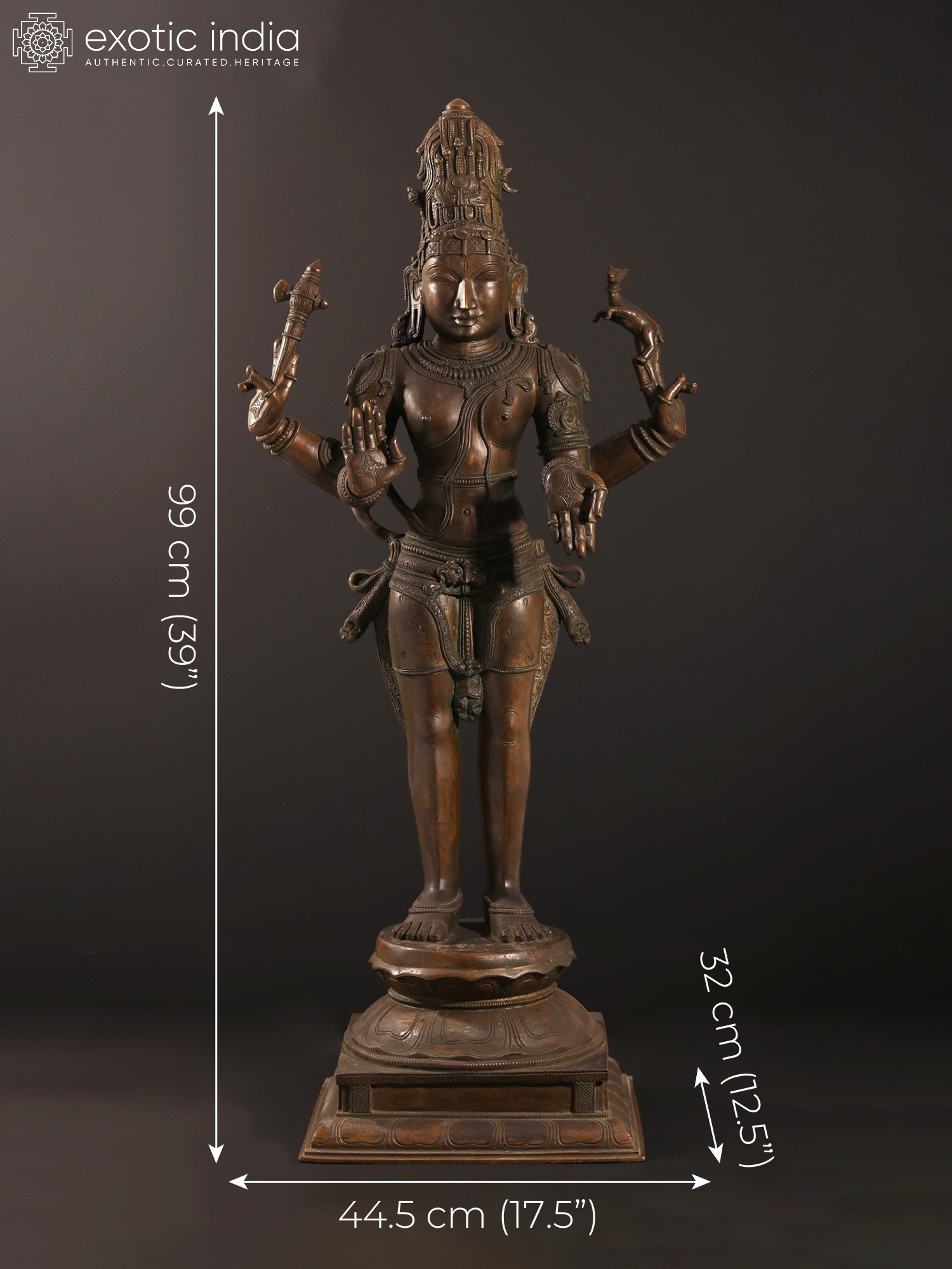 With all his splendor, Lord Pashupati has taken abode in this beautiful Panchaloha bronze statue. As a pillar of divinity, Pashupati Shiva stands on an inverted lotus pedestal in Sampadasthanaka posture, both legs placed parallelly, creating a balance in his form. His hair is tied in an elongated Jatamukuta, adorned with a crescent moon, hair ornaments with Makara mark and jeweled fineries. On his forehead is the third eye, marking the spot of his Yogic Shakti between his beautifully arched eyebrows, which are followed by a fine nose and inwardly smiling lips.