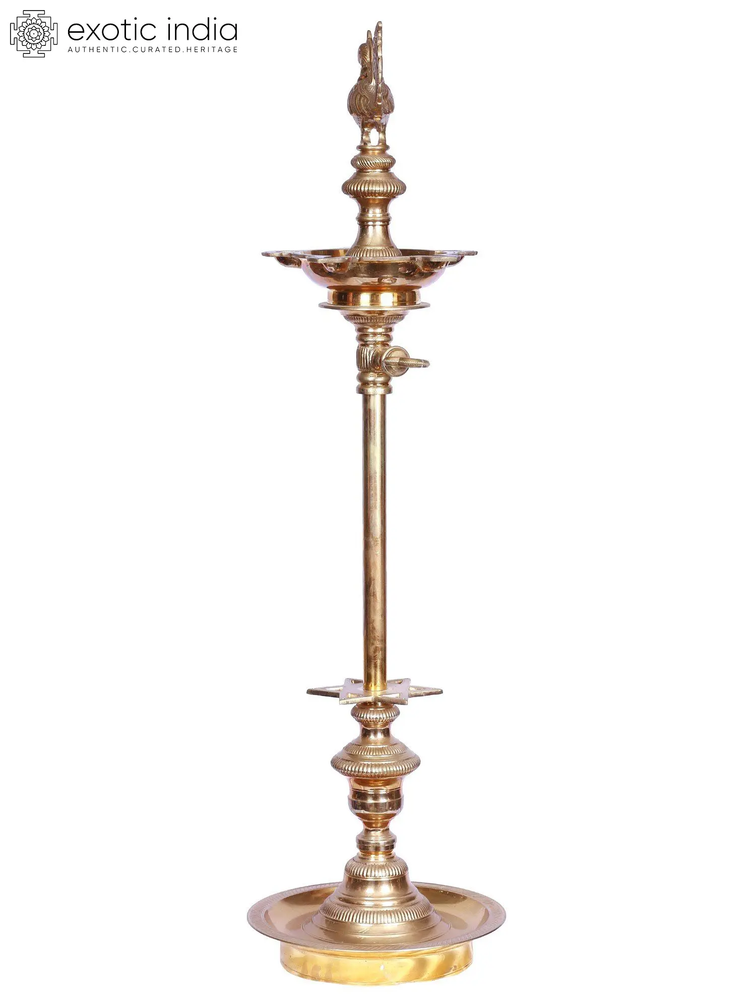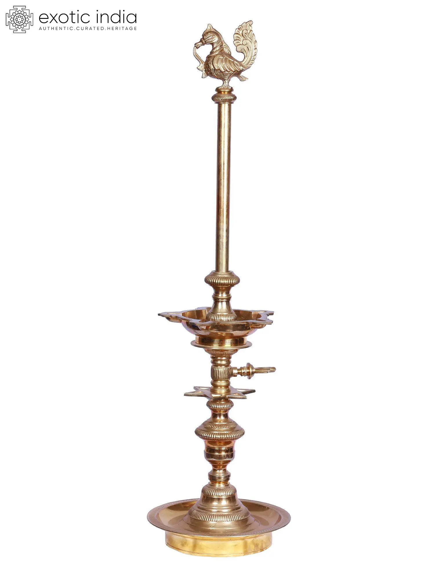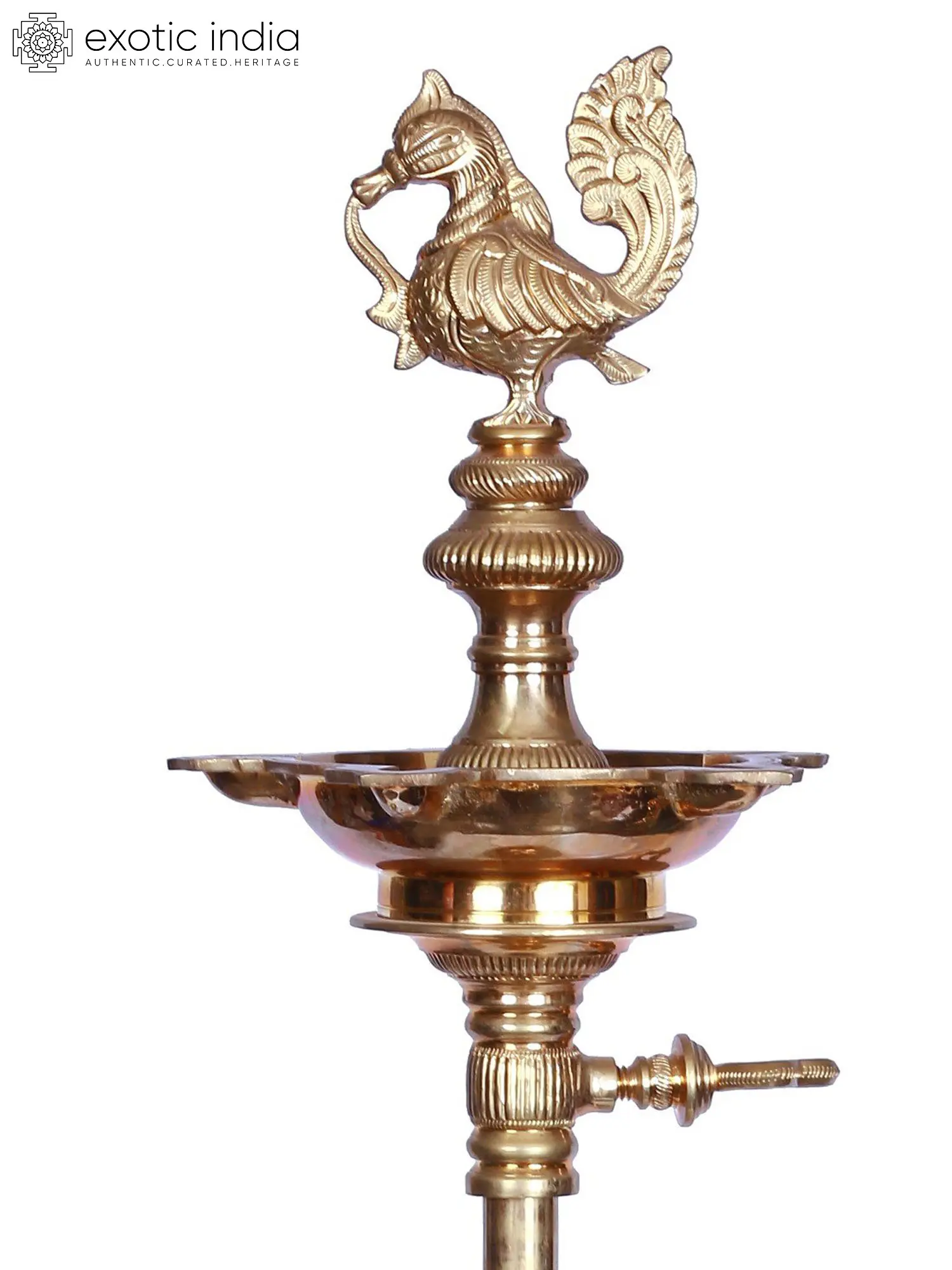 The beauty of a peacock is mentioned countless times in ancient works. A peacock, also known as Chitrapatraka, or one with painted feathers, Meghannandin, or one who rejoices in cloudy weather, and Kalpin, or one who adores dancing, is shown opulently in a variety of art genres. This five-wick adjustable brass lamp is a lavish depiction of the majestic bird. This is a one-of-a-kind lamp with an adjustment screw called a fastener and handle, that allows you to move the lamp closer or farther away from the peacock design. Its simple and exquisite design enchants the viewer, and the image remains engraved even after a quick glimpse.