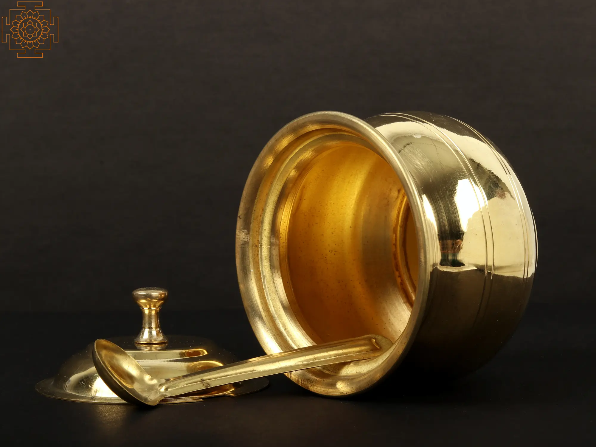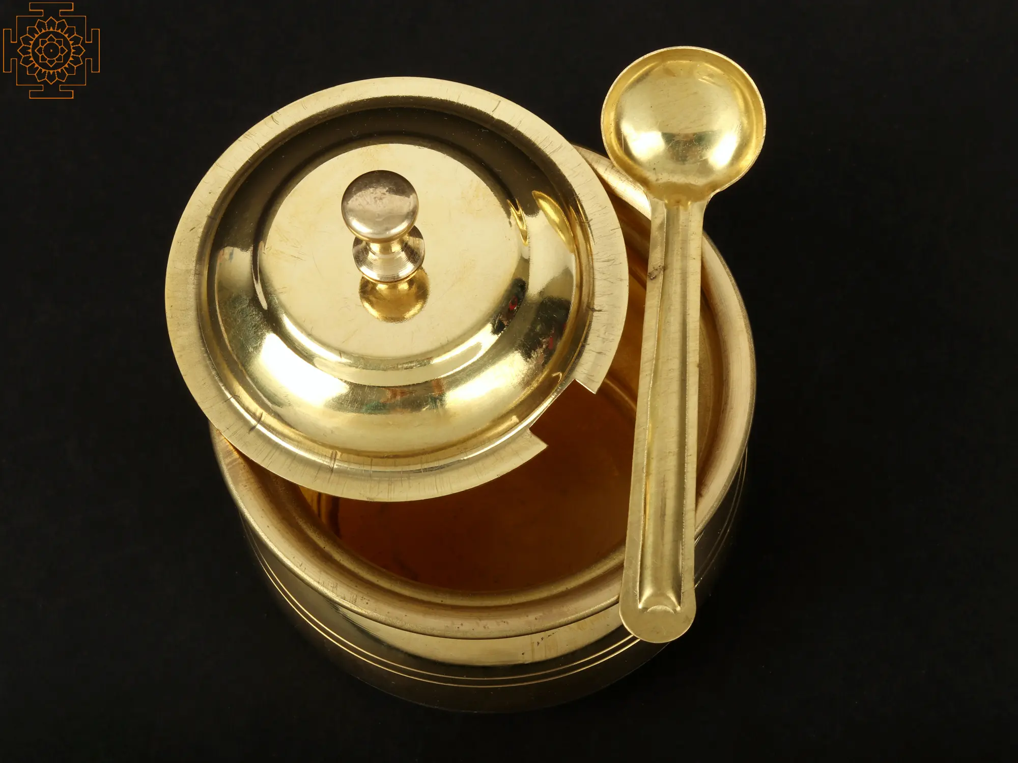 In India, the use of brass metal is very common in making ritual objects. Brass is considered sacred and has anti-bacterial properties. It is believed that anything kept in a brass container gets charged with good energy. This Brass Oil Jadi, also known as a Ghee pot, is a splendid vessel renowned for its radiant brass shine and solidifies the role of brass in Hindu traditional objects. This simply constructed container comes complete with a snug-fitting lid and a delicate spoon, enhancing its functionality and aesthetics. Beyond its ornate appearance, the Ghee pot holds significant ritualistic value in various cultures.