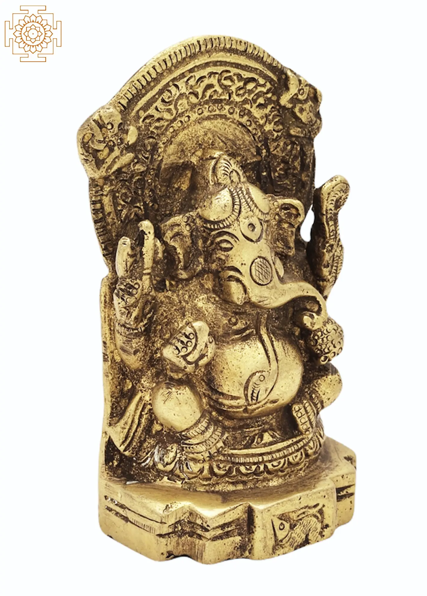 This brass Kalyan Ganapati exudes an aura of celebration and joy, embodying the spirit of festivity and the blessings that Ganesha bestows upon new beginnings. His four arms, each holding symbolic attributes—a broken tusk, a modaka, a noose, and an axe —form a symphony of auspicious energies that permeate the space in which it resides.