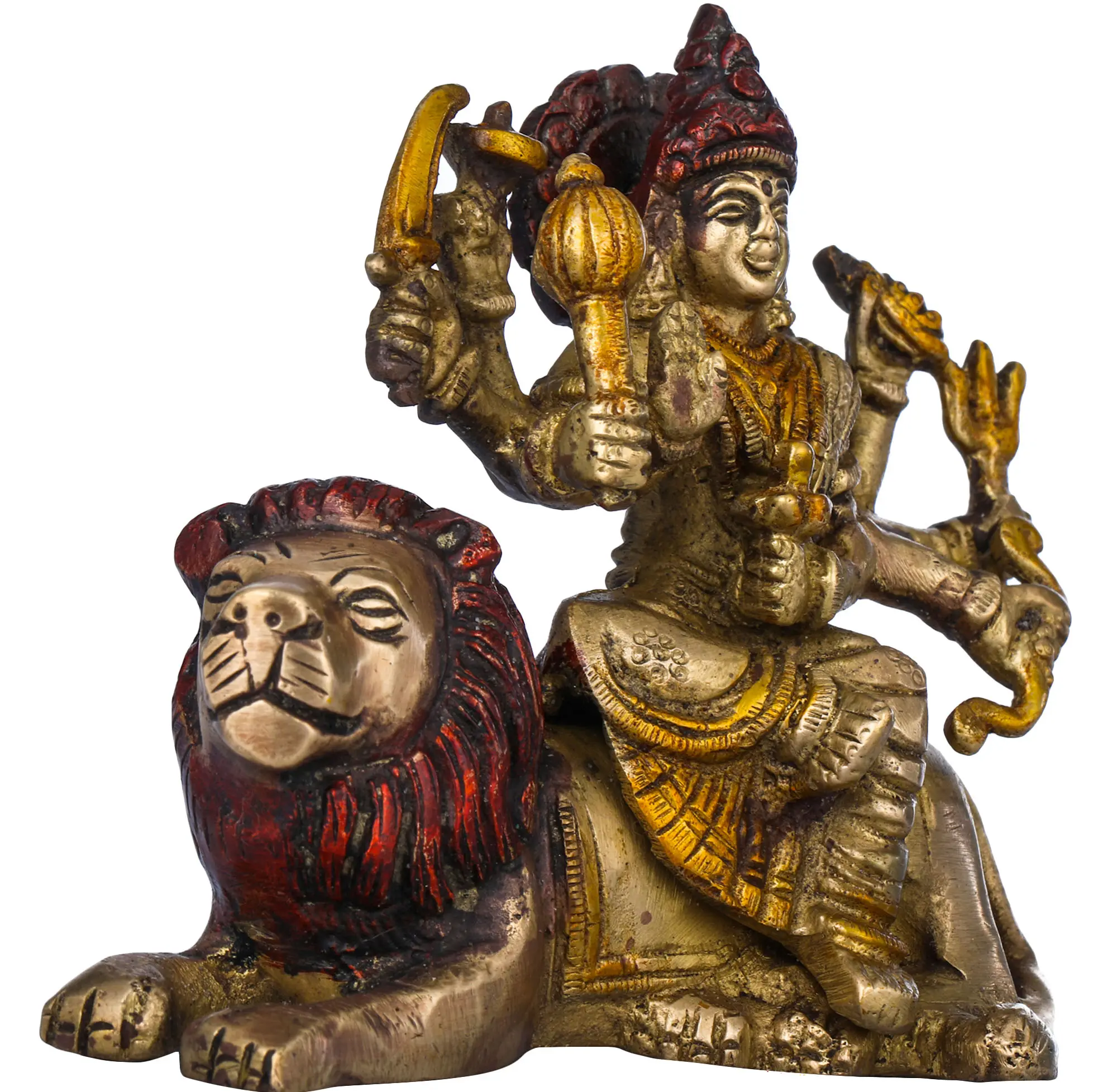 Goddess Durga is mounted on her lion, who is sitting down comfortably. Devi is present in this brass idol as Ashtabhuja- eight-armed, carrying powerful weapons. Ma Durga holds a lotus bud, a fortuitous symbol associated with mother goddesses. Her right hand raised in the gesture of fearlessness assures the troubled mind, reminding it of the transcendent presence of the Ashtabhujadhari Durga.