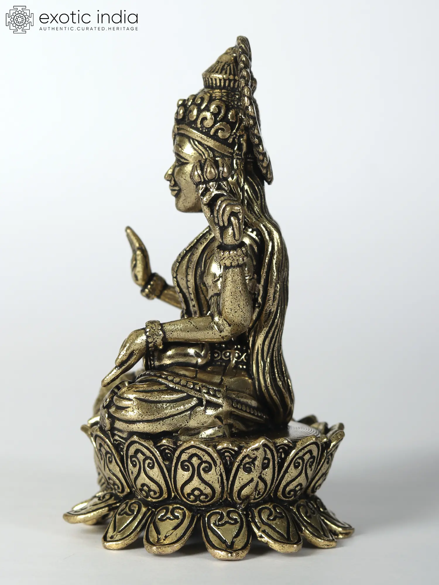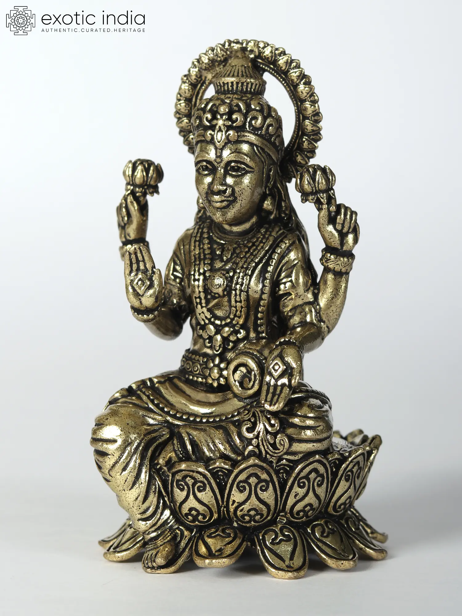 In this brass rendition, Goddess Lakshmi, the ethereal embodiment of wealth and beauty, gracefully adorns the cosmic stage in Lalitasana, seated on a blossoming lotus. Her form radiates opulence, draped in golden ornaments that whisper tales of prosperity. A ruby-studded crown (Kireedam Mukut) graces her divine countenance, as She cradles a lotus in her upper hands, symbolising purity and good fortune. Her lower right hand extends in Abhaya Mudra, bestowing fearlessness and courage. Her left hand, in Varada Mudra, grants boons to the devoted, while clasping a pot of gold, the symbol of prosperity. Worshipping this celestial form invites abundance, material and spiritual, bestowing fortune and eternal beauty upon devotees.