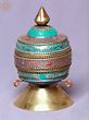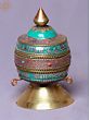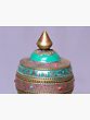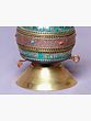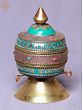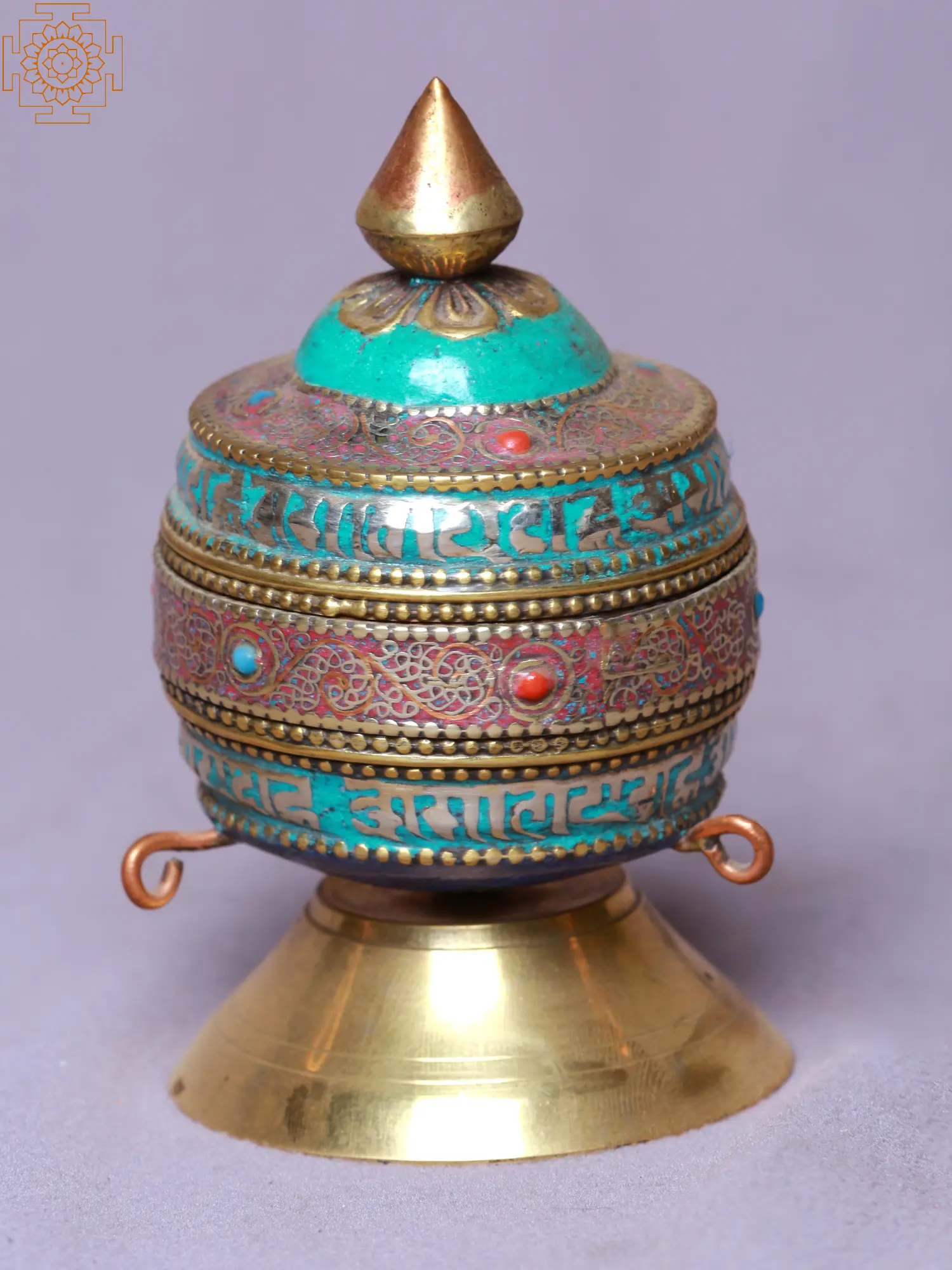 Made with Copper and adorned with intricate stonework, this prayer wheel radiates beauty and spiritual vibes. The gorgeous stones adorning the ball-shaped design give it a mesmerising aesthetic appeal. By rotating the wheel, devotees believe that the sacred mantras and prayers contained within are released, generating positive energy and blessings. A spiritual journey of inner transformation and enlightenment is encouraged by this fascinating work of art, which serves as a symbol of devotion and connection with the divine. Its superb craftsmanship and spiritual importance make it a treasured item in temples, monasteries homes and any sacred place.