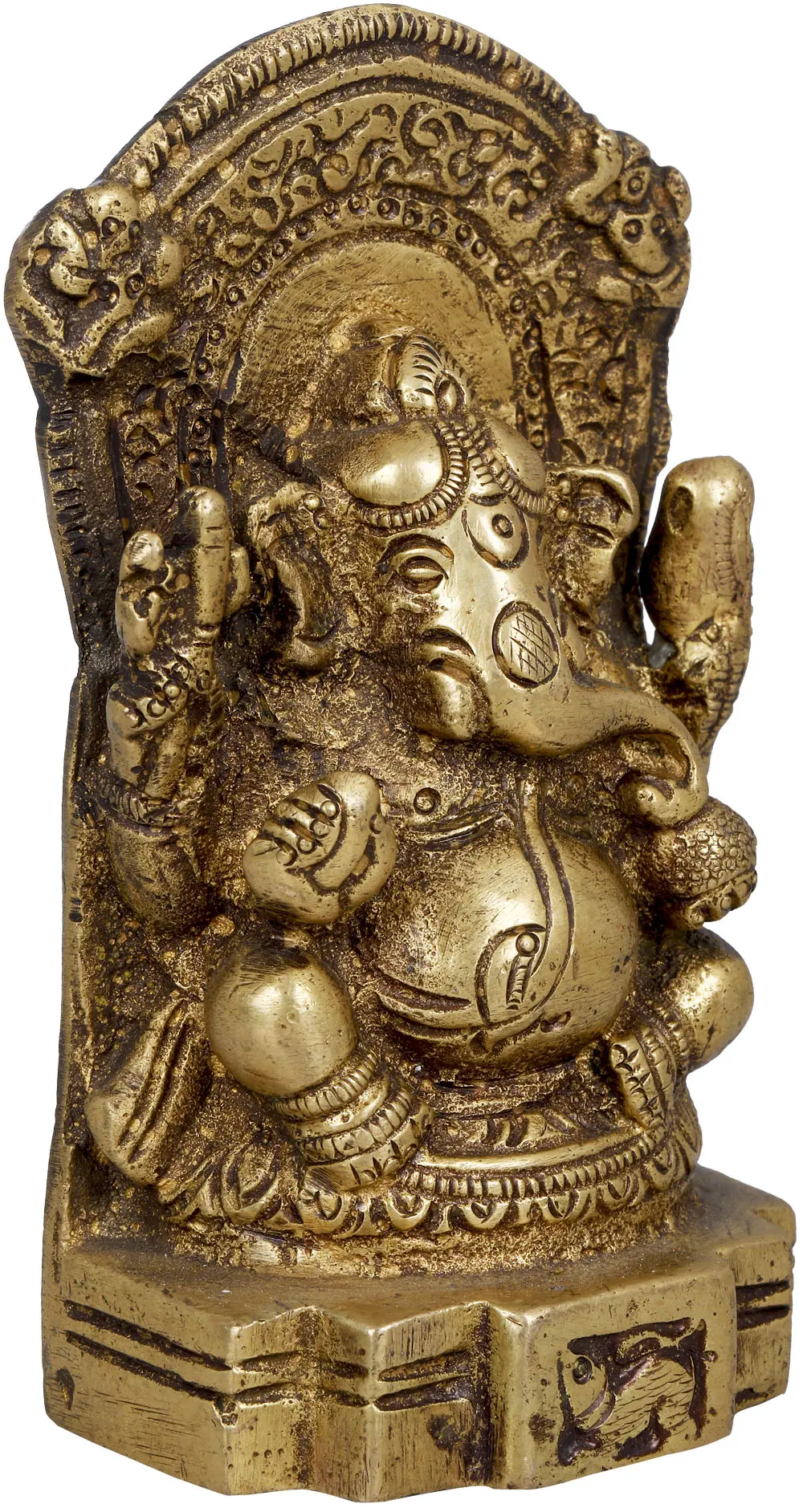 In Hindu tradition, Ganesha is invoked at the commencement of any new endeavor, ensuring smooth progress and success. He is often depicted with a potbelly, symbolizing abundance and prosperity, and a mouse as his vahana (vehicle), representing control over desires. This brass representation, with its finely etched features and serene expression, embodies these powerful symbols. The intricate carvings on the arch behind him are reminiscent of ancient temple architecture, adding to the piece's authenticity and spiritual depth. Each curve and contour speaks of the countless blessings that Ganesha bestows upon his devotees, from wisdom and knowledge to good fortune and protection.
