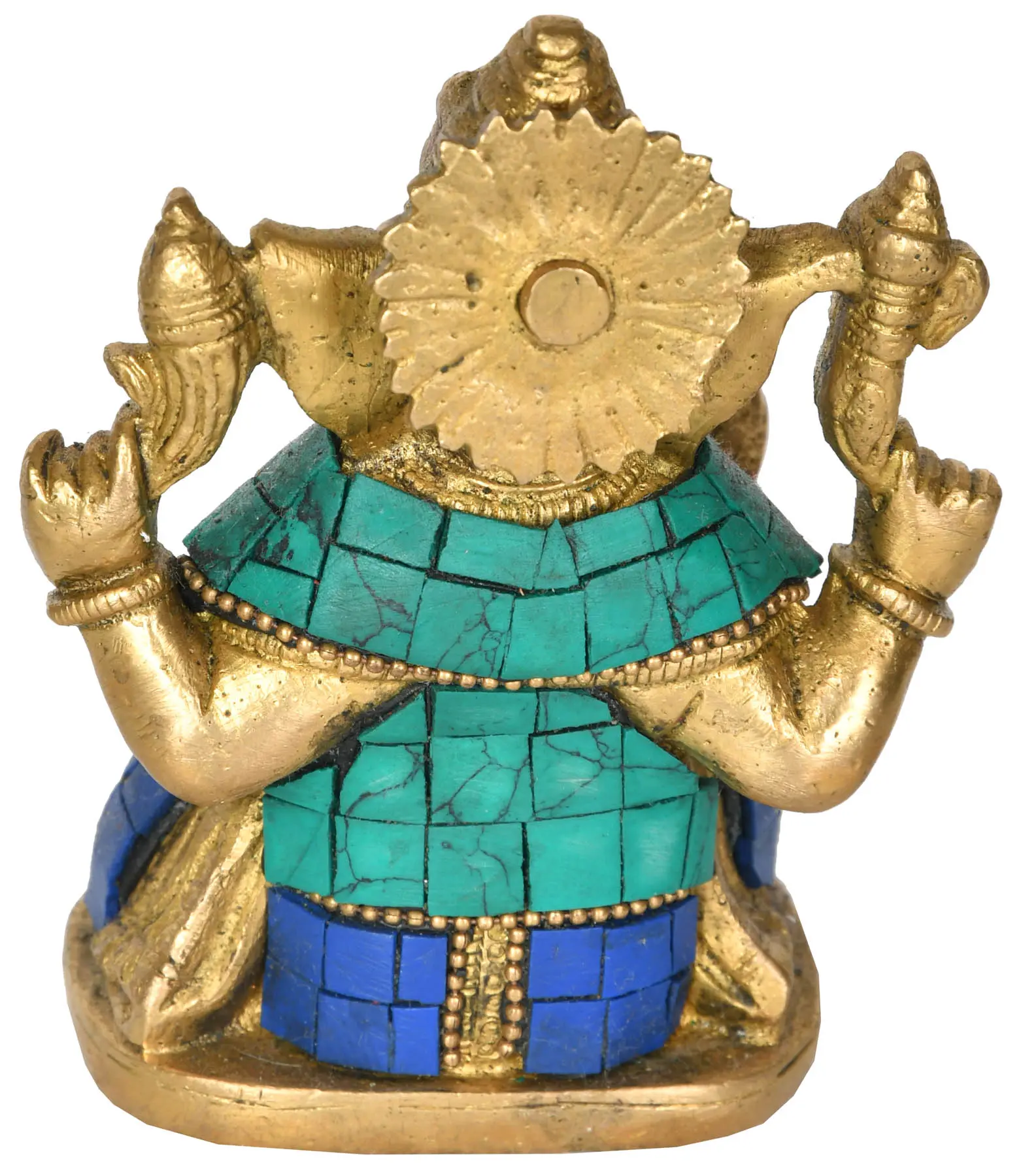 In this brass statue, Lord Ganesha graces us in the “Utkutakasana posture”, a divine embodiment of benevolence. With a countenance that radiates wisdom and warmth, He wields a “Goad” and “Noose” in his upper hands, symbolising his power to guide and bind life’s chaos. His right hand, extended in the “Ashirwad Mudra”, bestows blessings upon all who seek his divine favour. In his left hand, “a Modak”, the sweet delicacy, represents the sweetness of life He offers to his devotees. Adorned in regal attire, He personifies opulence and prosperity. This artwork signifies Ganesha’s role as a benevolent guide, bestowing blessings and helping seekers transcend obstacles, while his dignified presence in brass with inlay evokes awe and devotion.