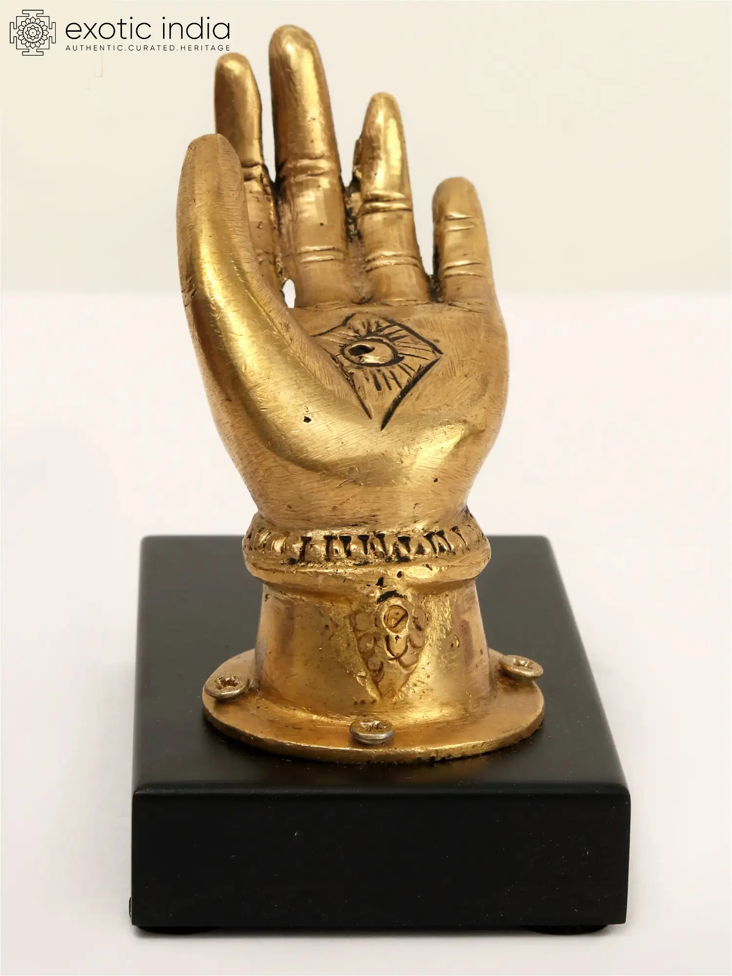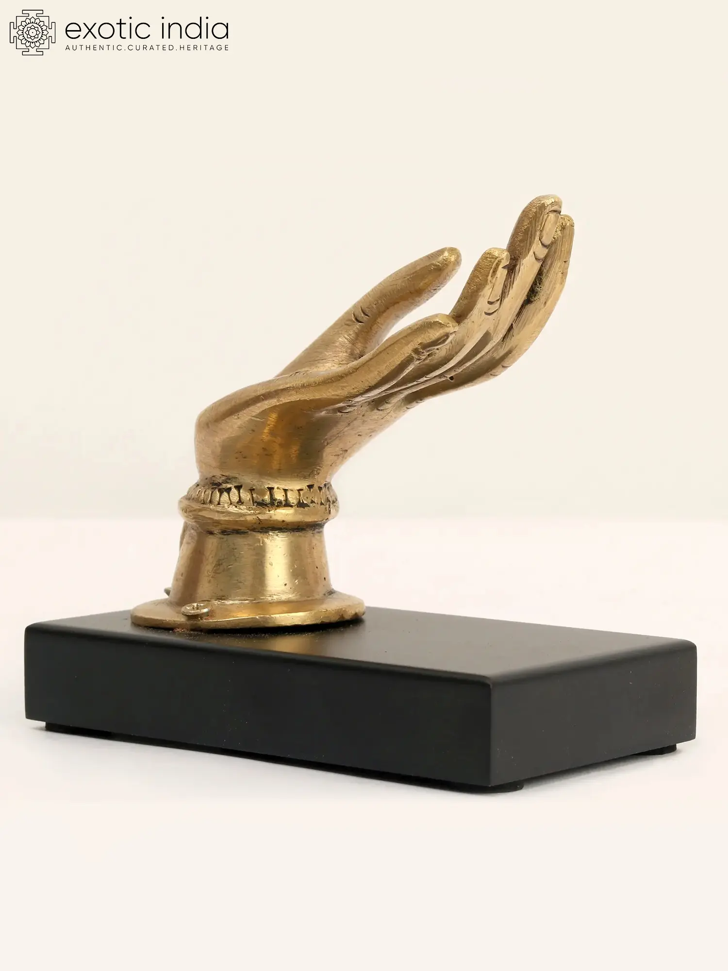 Choose any name, Mother, Devi, or Goddess, but the kindness associated with these titles stays the same. The blessings offered by Varada and Abhaya's hand movements are considered spiritual and effective in removing negativity. This bronze hand statue of Devi on a wooden stand is a method for bringing the goddess's blessings and filling one's life with benefits. It is a one-of-a-kind table decoration that has a beautiful depiction of the holy mother's golden hand on a black oak stand, spreading her blessings.