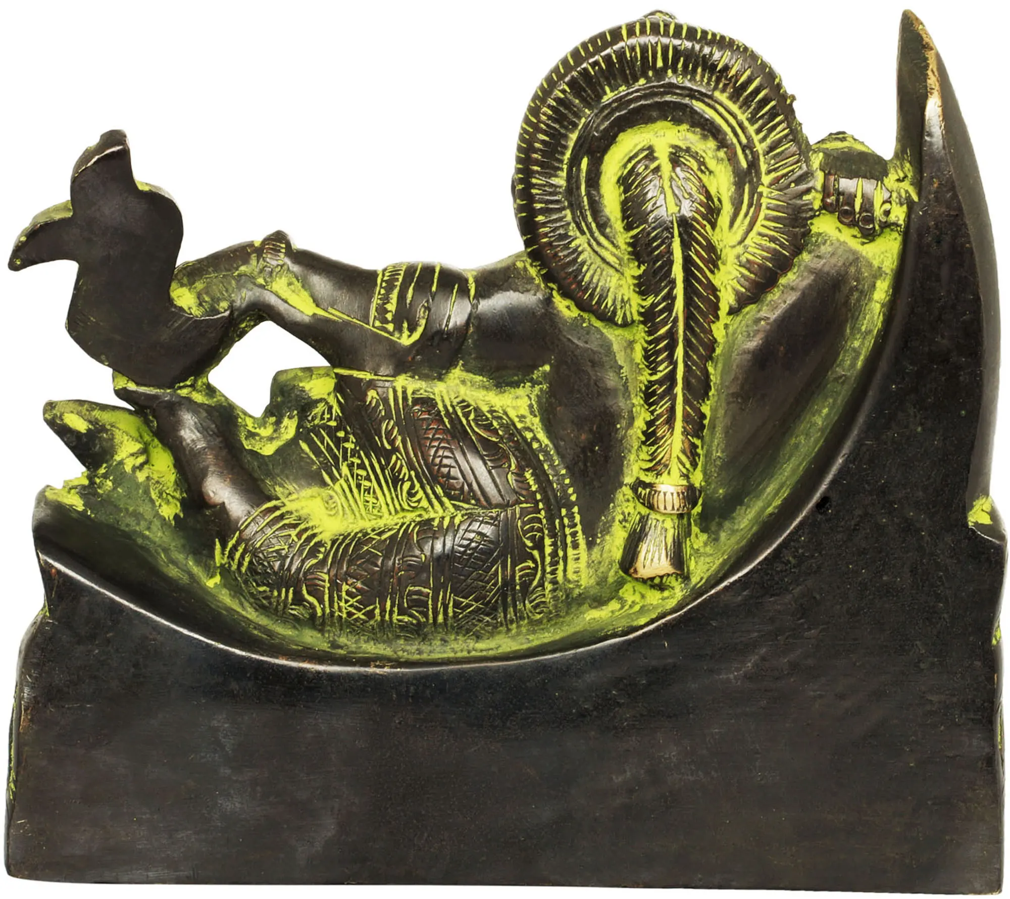 In this unique rendition, Ganesha lies gracefully on his right side, cradling his head with his right hand, resting upon the crescent moon, a symbol of purity and enlightenment. Lord Ganesha exudes a sense of serenity and calmness. This brass creation captures the essence of Ganesha’s wisdom and benevolence, symbolizing his ability to bring calmness and serenity to the chaotic and challenging aspects of life. This mesmerizing artwork encourages you to seek balance and harmony amidst life’s ups and downs, invoking Ganesha’s blessings for success and prosperity.