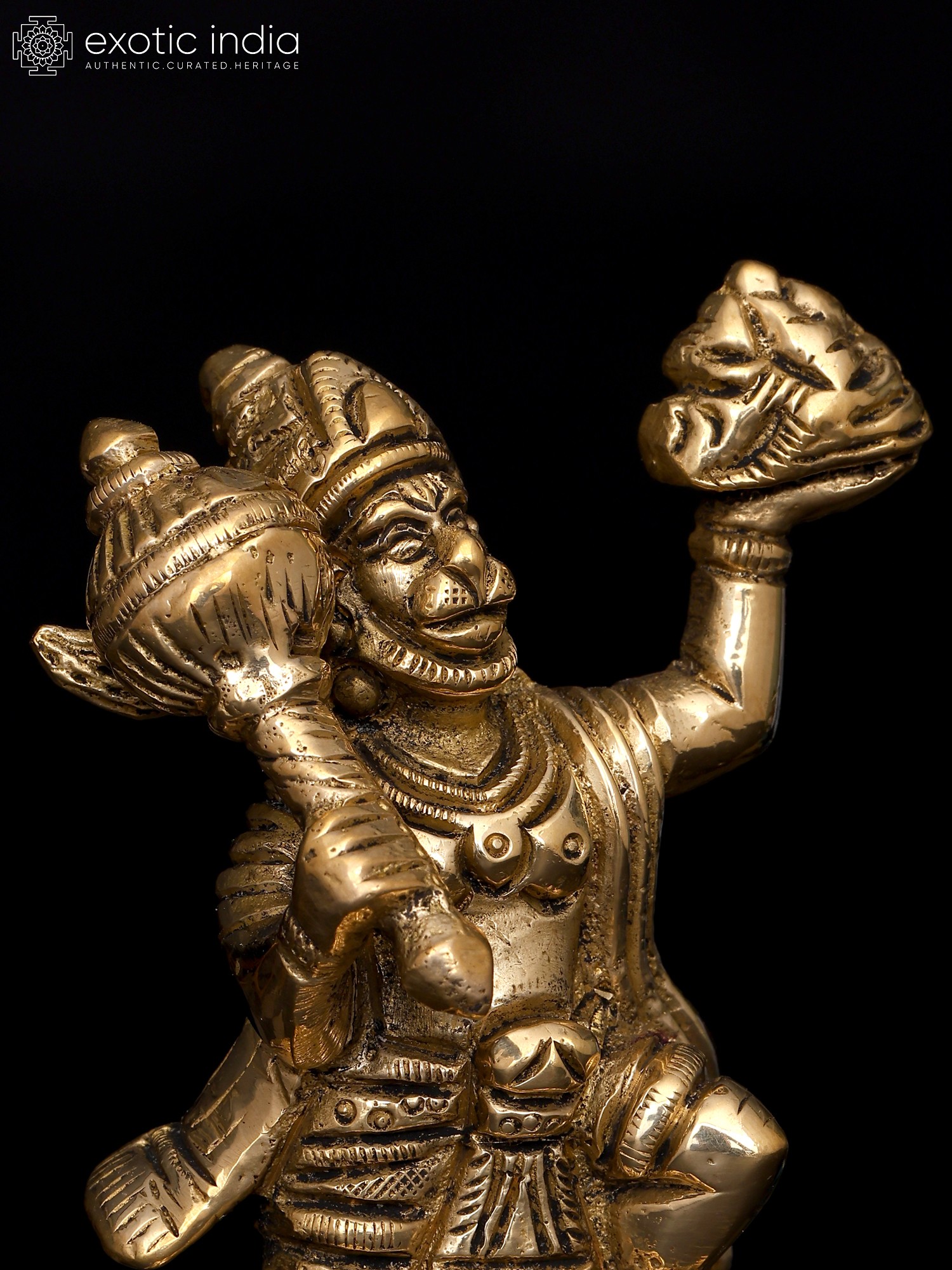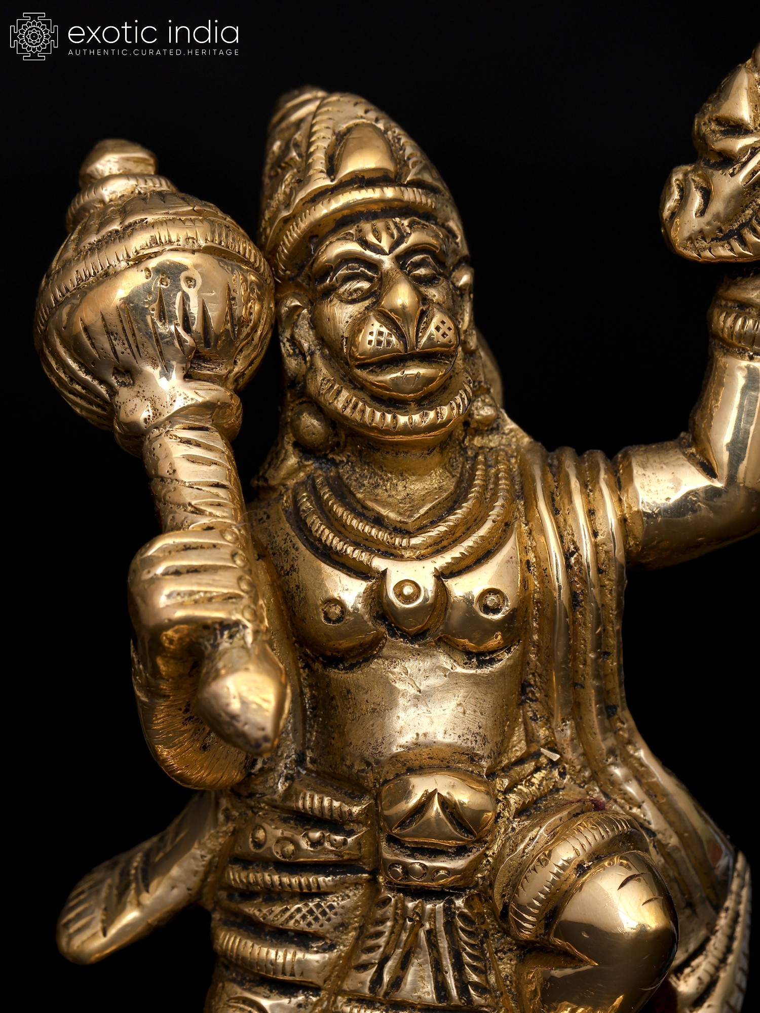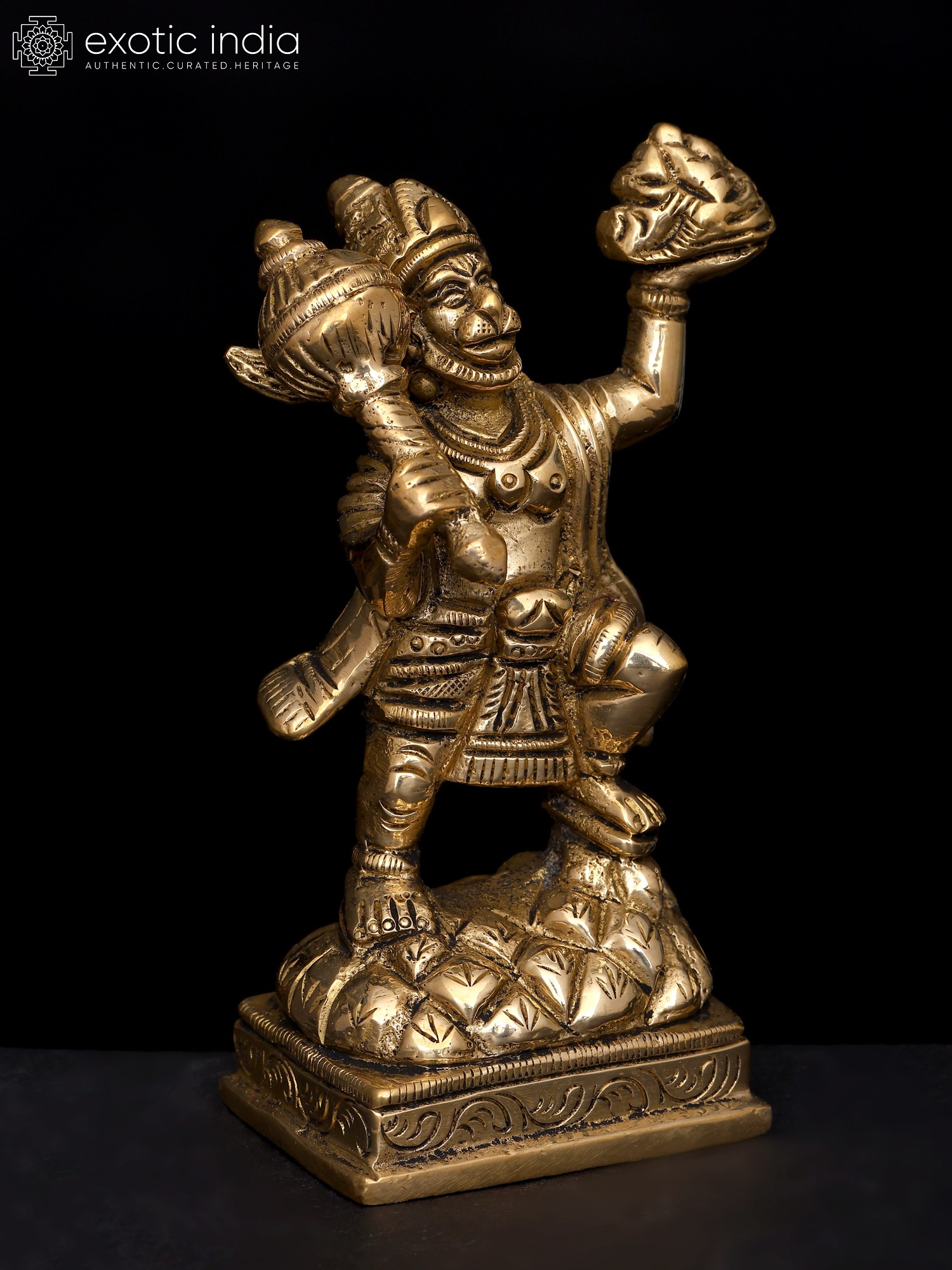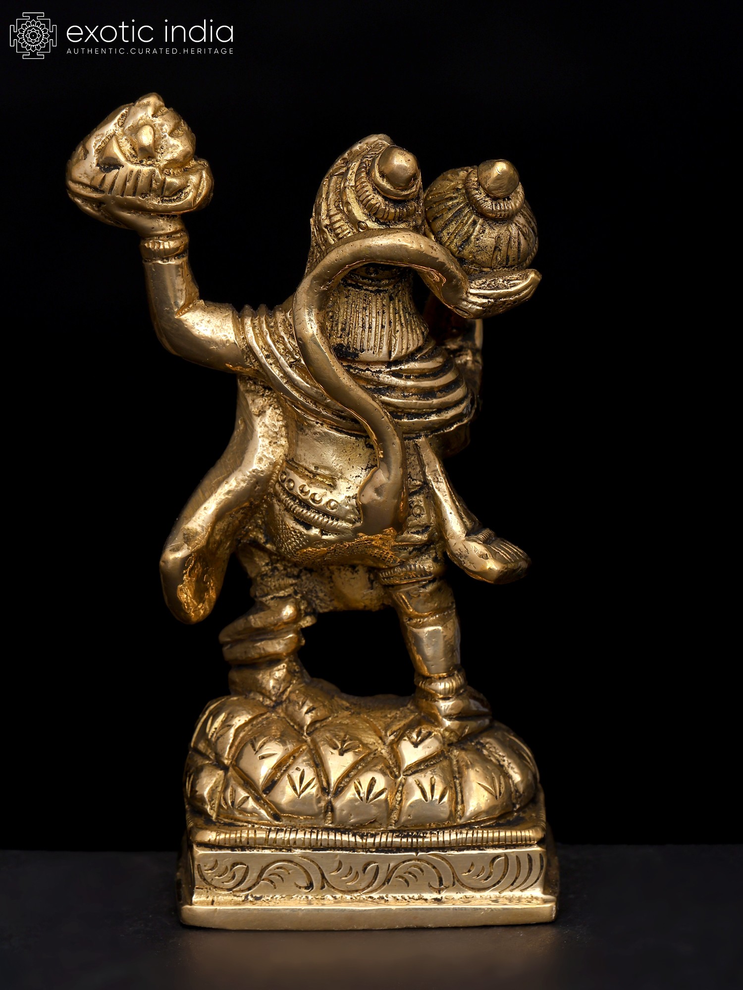 In the epic Ramayana, a tale of devotion and valour, Hanuman’s unwavering commitment shines through when Lord Rama’s brother, Lakshmana, is grievously wounded in War. To save him, Hanuman embarks on a daunting quest to procure the life-restoring “Sanjeevani Booti”, which grows on a distant mountain. Fearless and determined, Hanuman lifts the entire mountain and carries it across the skies. His selflessness and boundless strength inspire reverence, reinforcing the significance of devotion and loyalty. It is believed that worshipping this form of Lord Hanuman gives you courage, boosts your focus and fosters positivity. Crafted in brass, this artwork inspires you to find inner strength and unwavering faith in times of adversity.