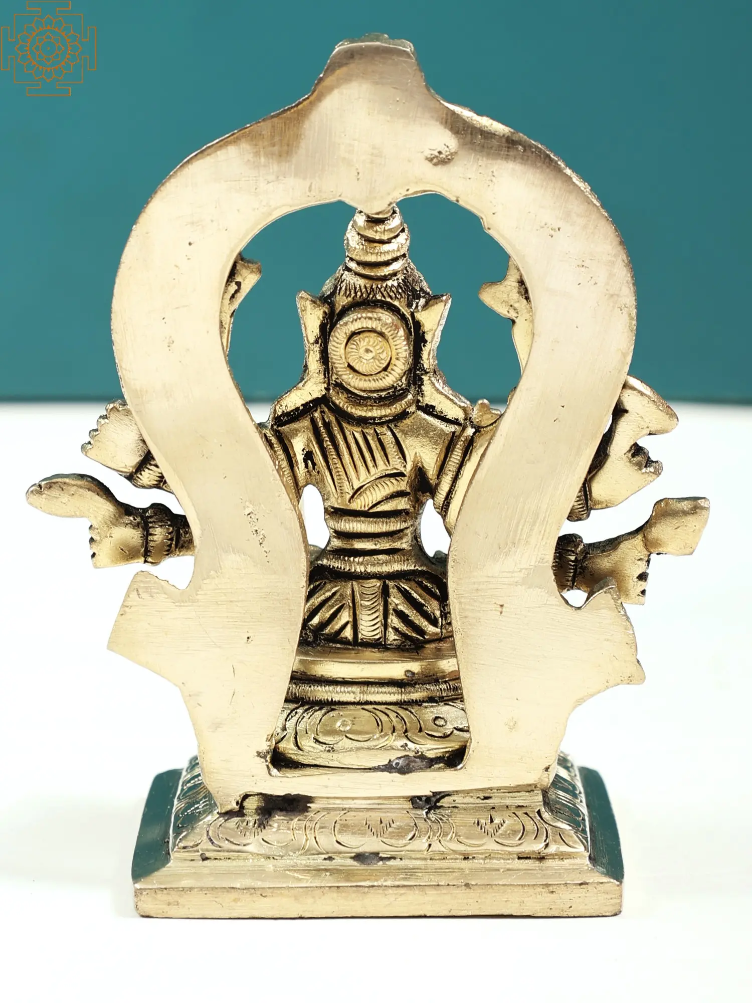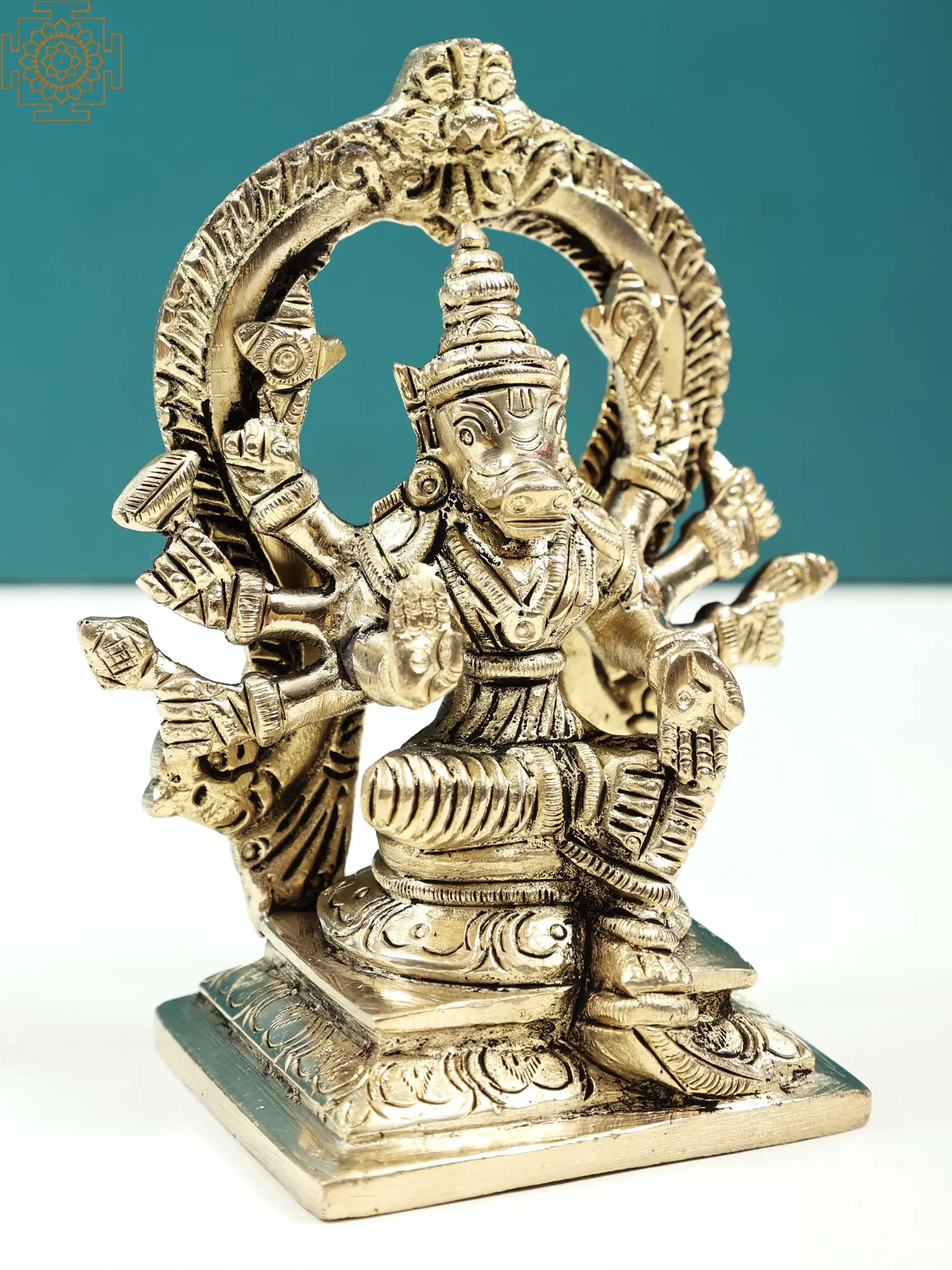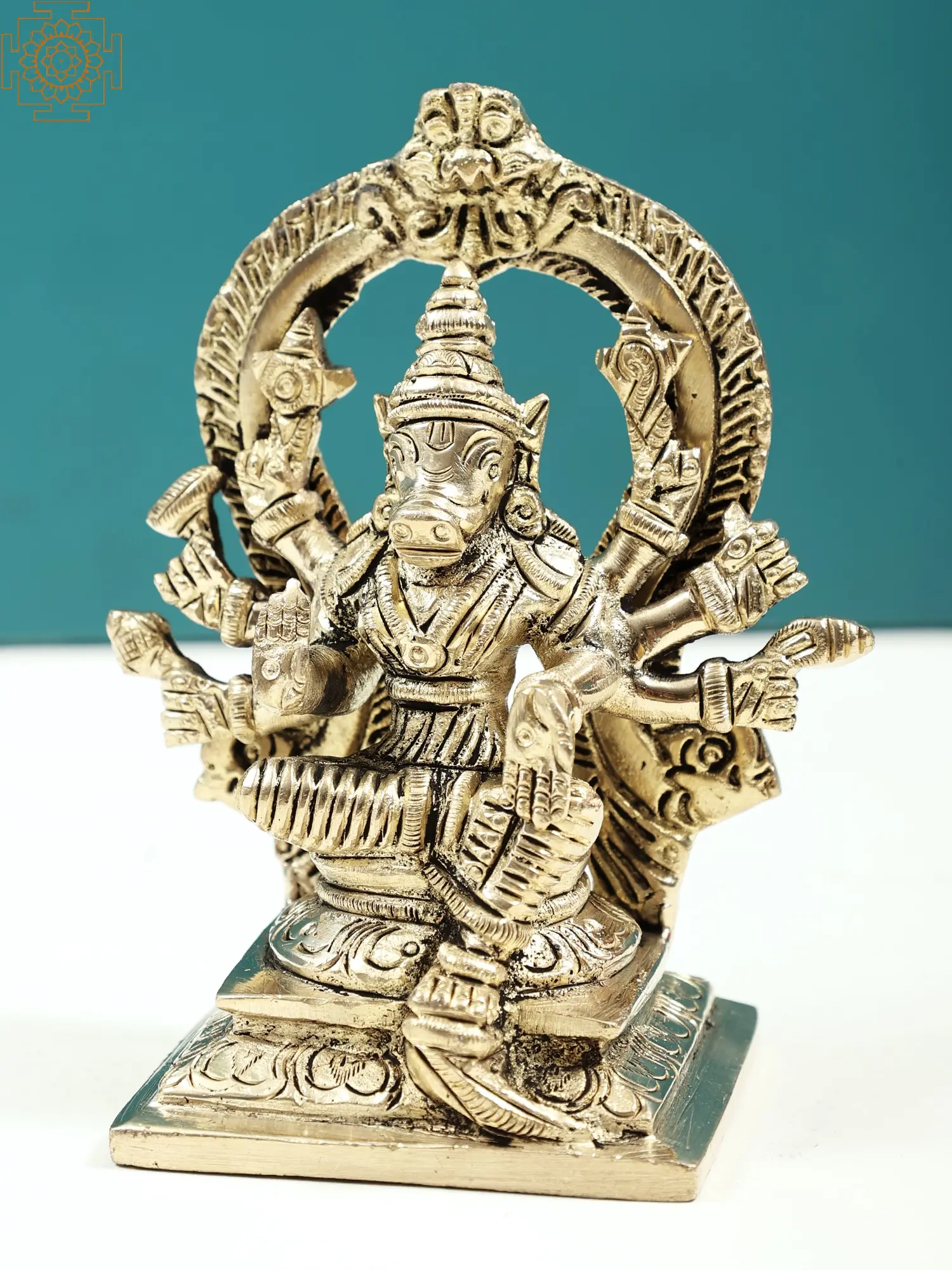 In the potent Hindu-Tantric tradition known as the Varahi Tantra, the main goddess is the Matrika Varahi, the Shakti of Vishnu and the leader of Maha-Shakti's army during celestial battles. This small brass statue of Devi Varahi shows her in a serene attitude while sitting on a lotus throne, donning a gorgeous saree, and beautifully adorned. To emphasize her celestial might, she adopts the form of Ashtabhuja, which means "eight-armed," and is encircled by an aureole to draw attention to her divine aura.