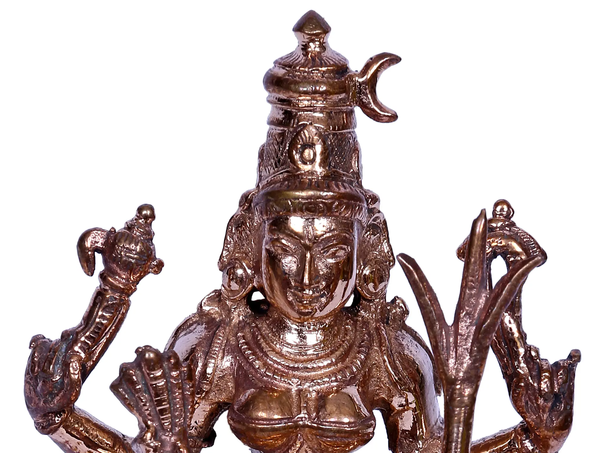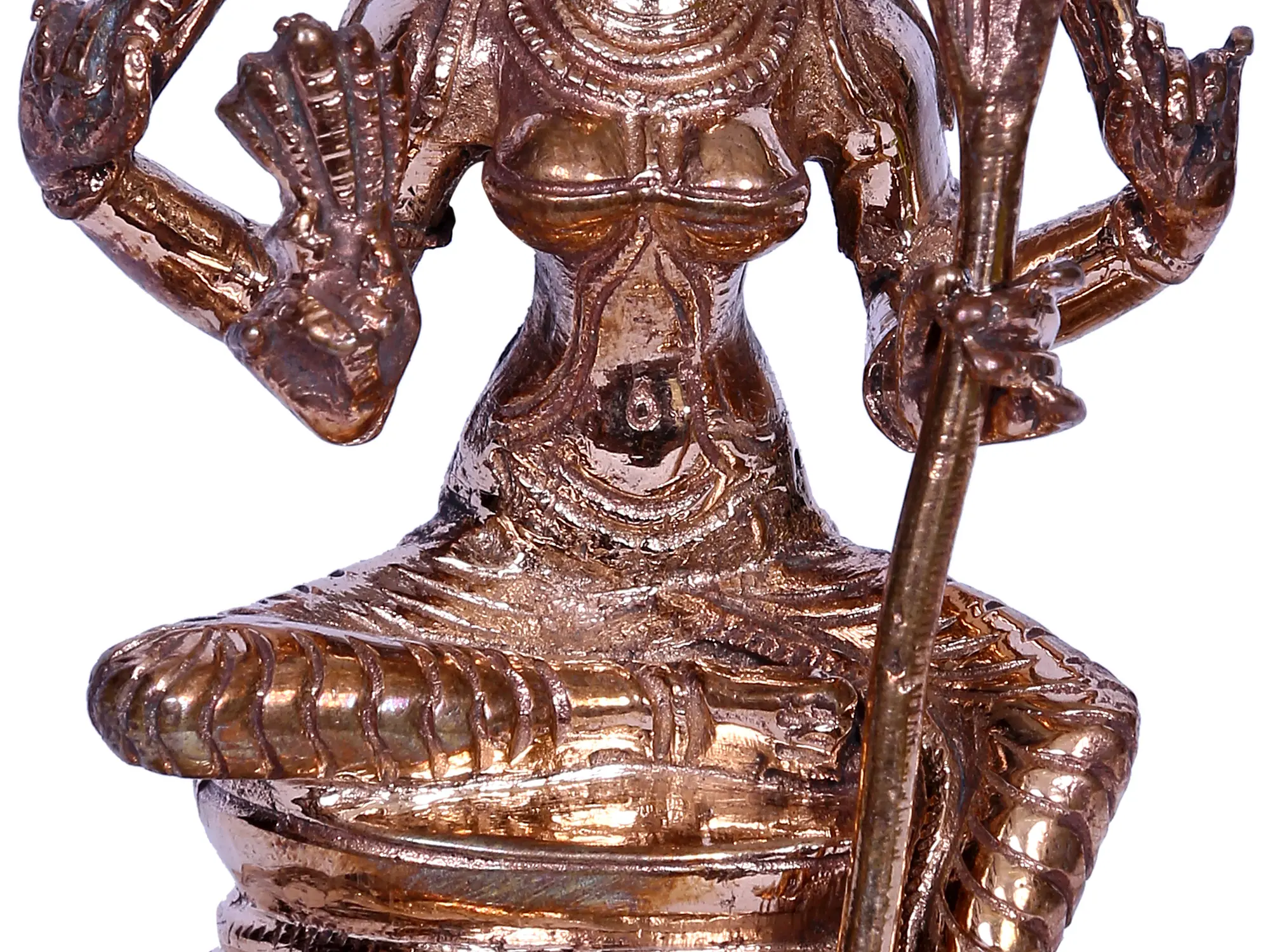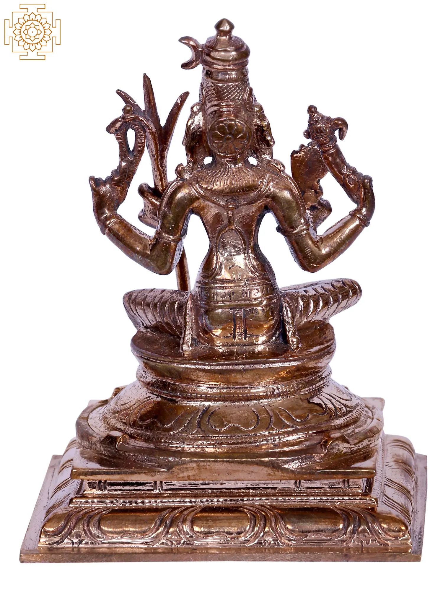 Enthroned u pon a lotus pedestal, Goddess Rajarajeshwari, “the ethereal Tripura Sundari”, captivates in Lalitasana. Grace personified, her upper hands wield a goad and a noose, symbolising divine control over desires and liberation. In her right hand, delicate flowers symbolise the beauty of creation, while in her left, a sugarcane bow signifies the mind’s restraint. Adorned regally, Rajarajeshwari, “the foremost of the Mahavidyas”, exudes enchanting elegance. Crafted in bronze from Swamimalai using the ancient “Madhuchista Vidhana (Lost-Wax) technique”, this celestial sculpture embodies the harmonious dance of power and compassion, a cosmic ballet where Rajarajeshwari reigns supreme as the enchanting orchestrator of existence, a symbol of divine balance and the eternal rhythm of creation and dissolution.