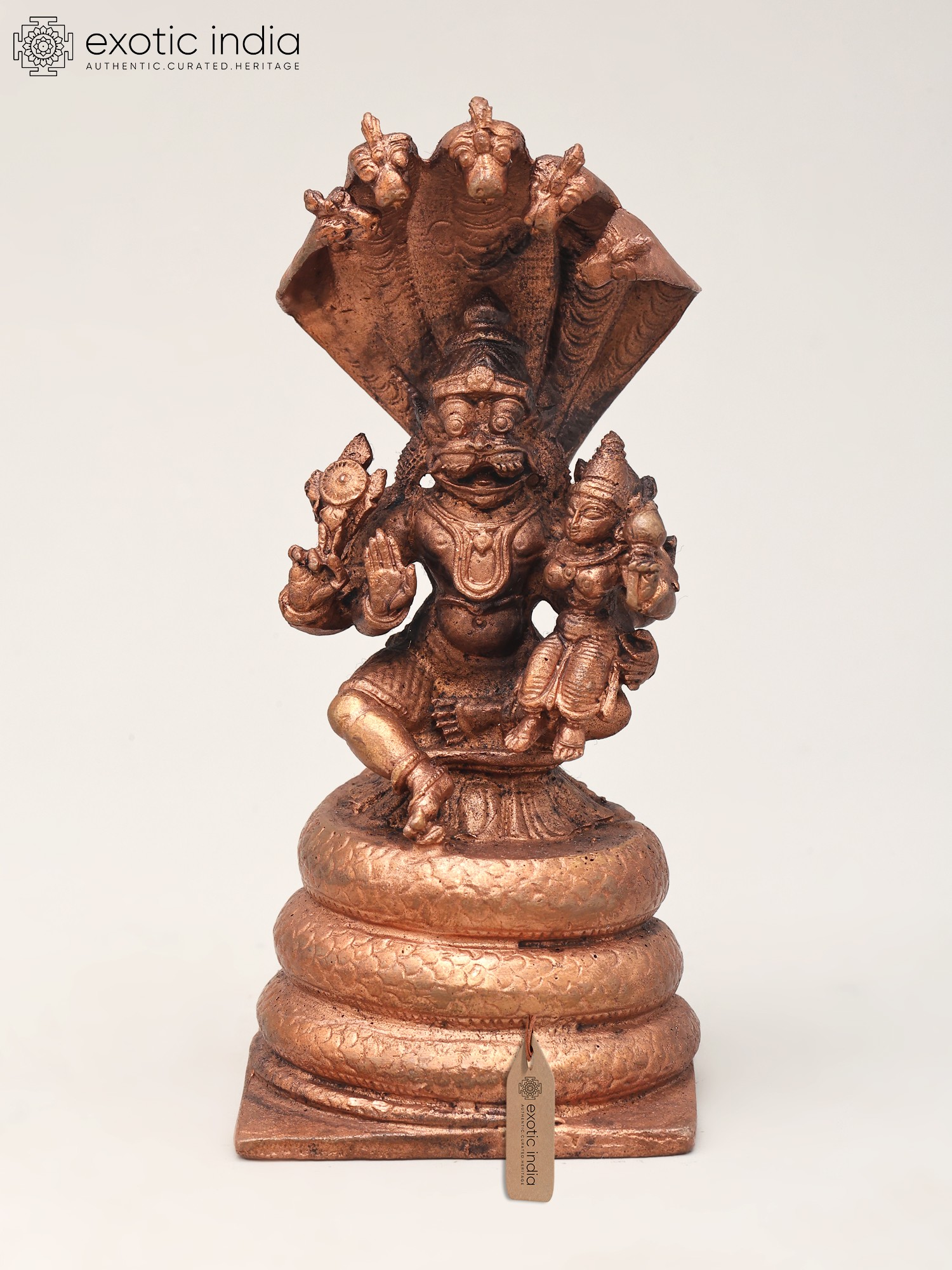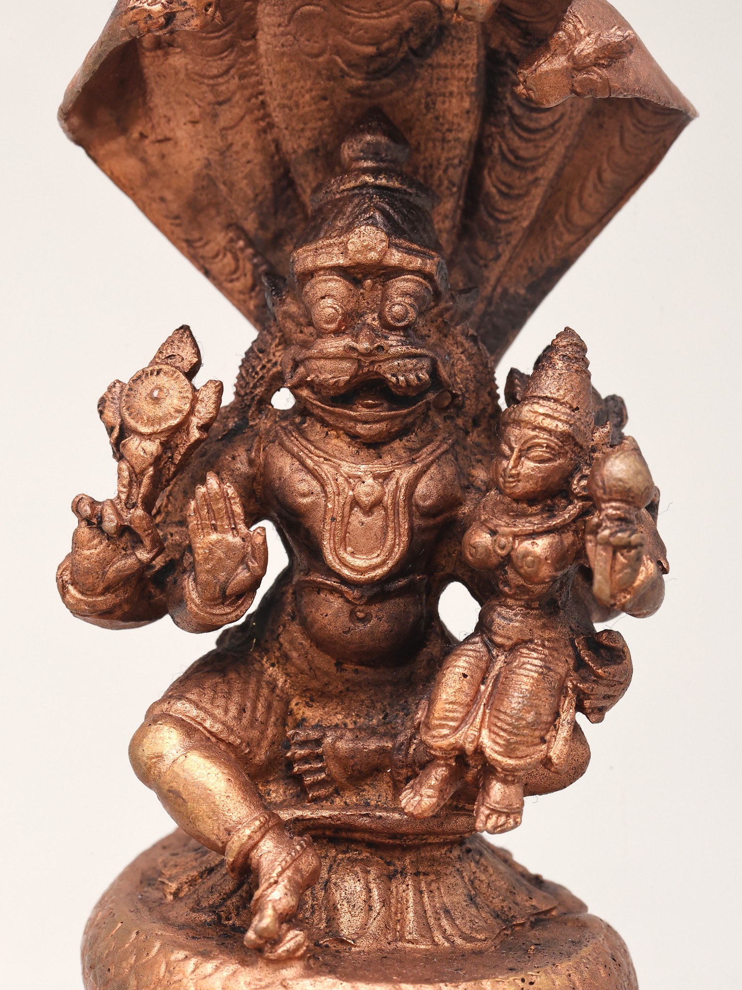 4" Small Lord Narasimha Seated on Kirtimukha Throne with Devi Lakshmi | Copper Statue