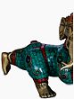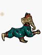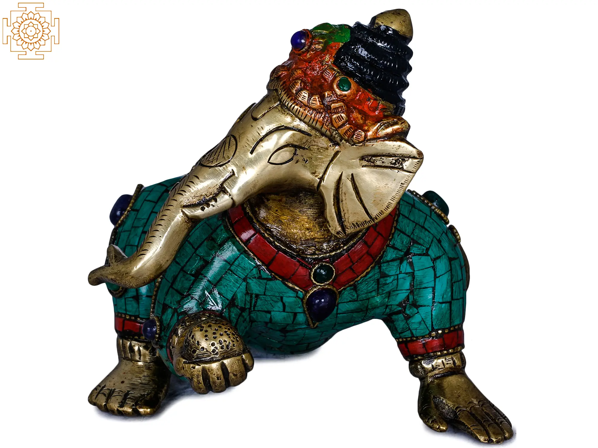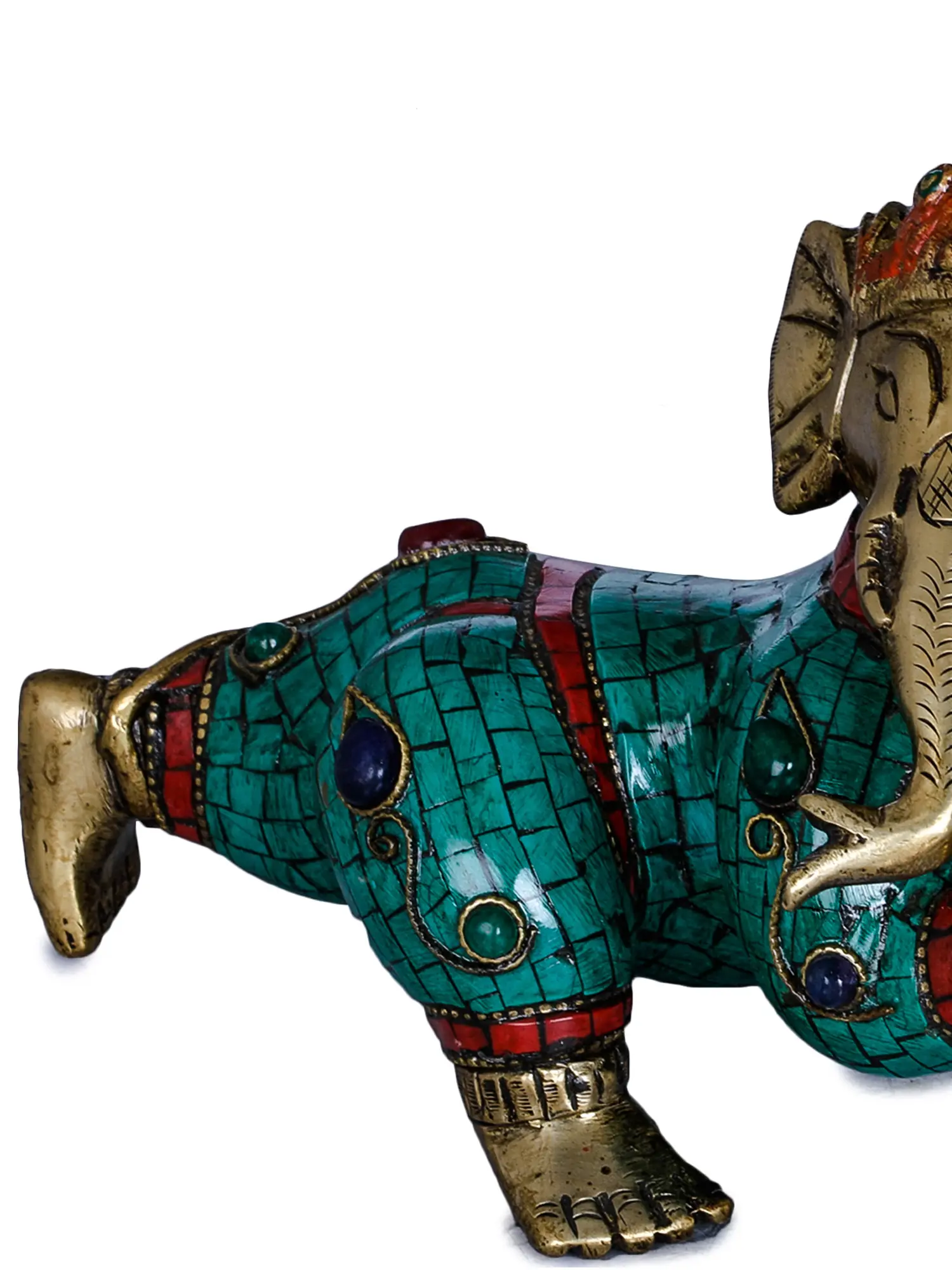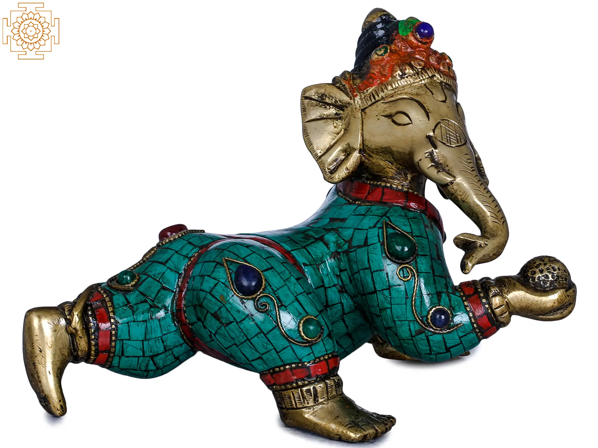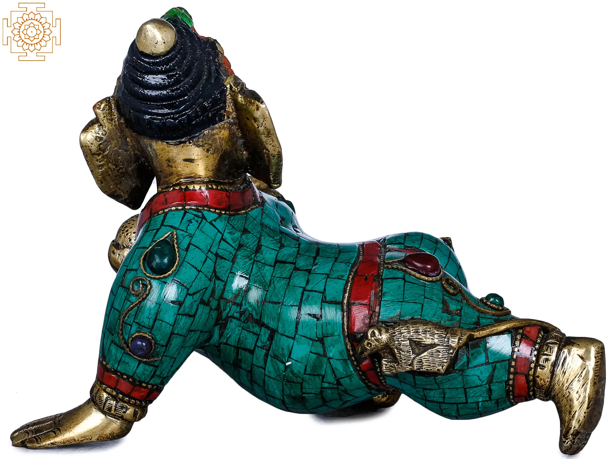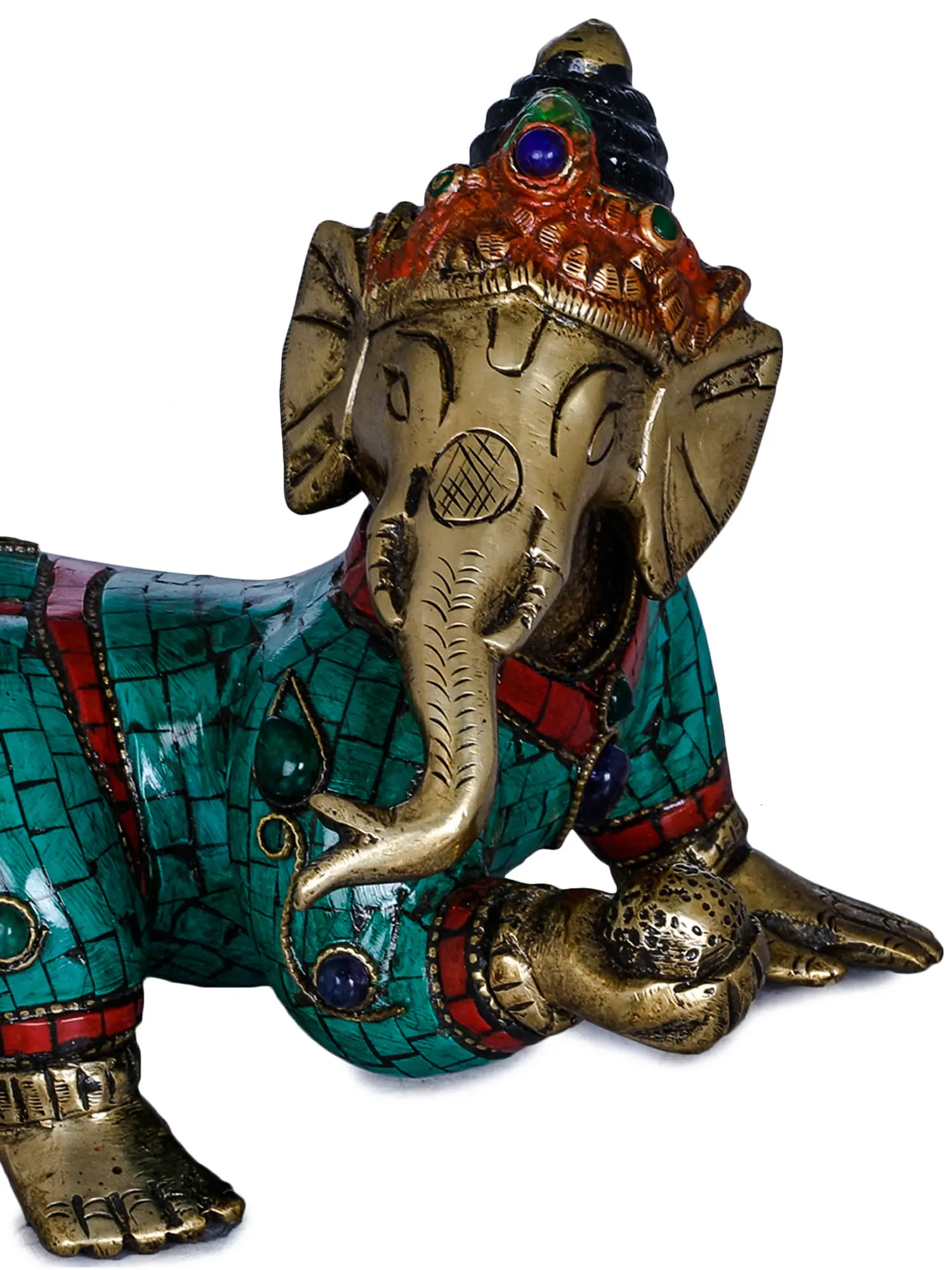 The form of Ganesha is itself steeped in fascinating mythology. It is said that Ganesha was sculpted by his mother, Goddess Parvati, from her own body's impurities and brought to life with divine grace. He was later granted his elephantine head by Lord Shiva. This crawling depiction may allude to his early days, learning to navigate the world with the boundless curiosity and determination that would come to define his divine persona. The vibrant turquoise and deep red inlay work adorning his attire adds a regal and opulent feel, suggesting that even in his infancy, Ganesha was destined for greatness. Each meticulously placed stone hints at the precious blessings he bestows.
