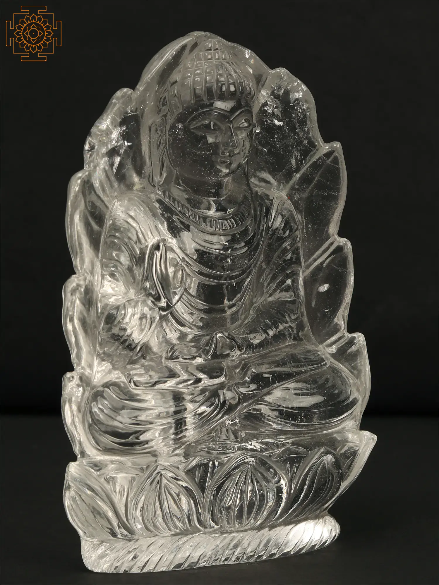 The transparent, glass-like nature of crystal adds to the ethereal quality surrounding the Buddha. The traditional, seated monk figurine. Right hand raised in the vitarka mudra (the stance of transmuting vidya). A discernible sombreness on the translucent face.