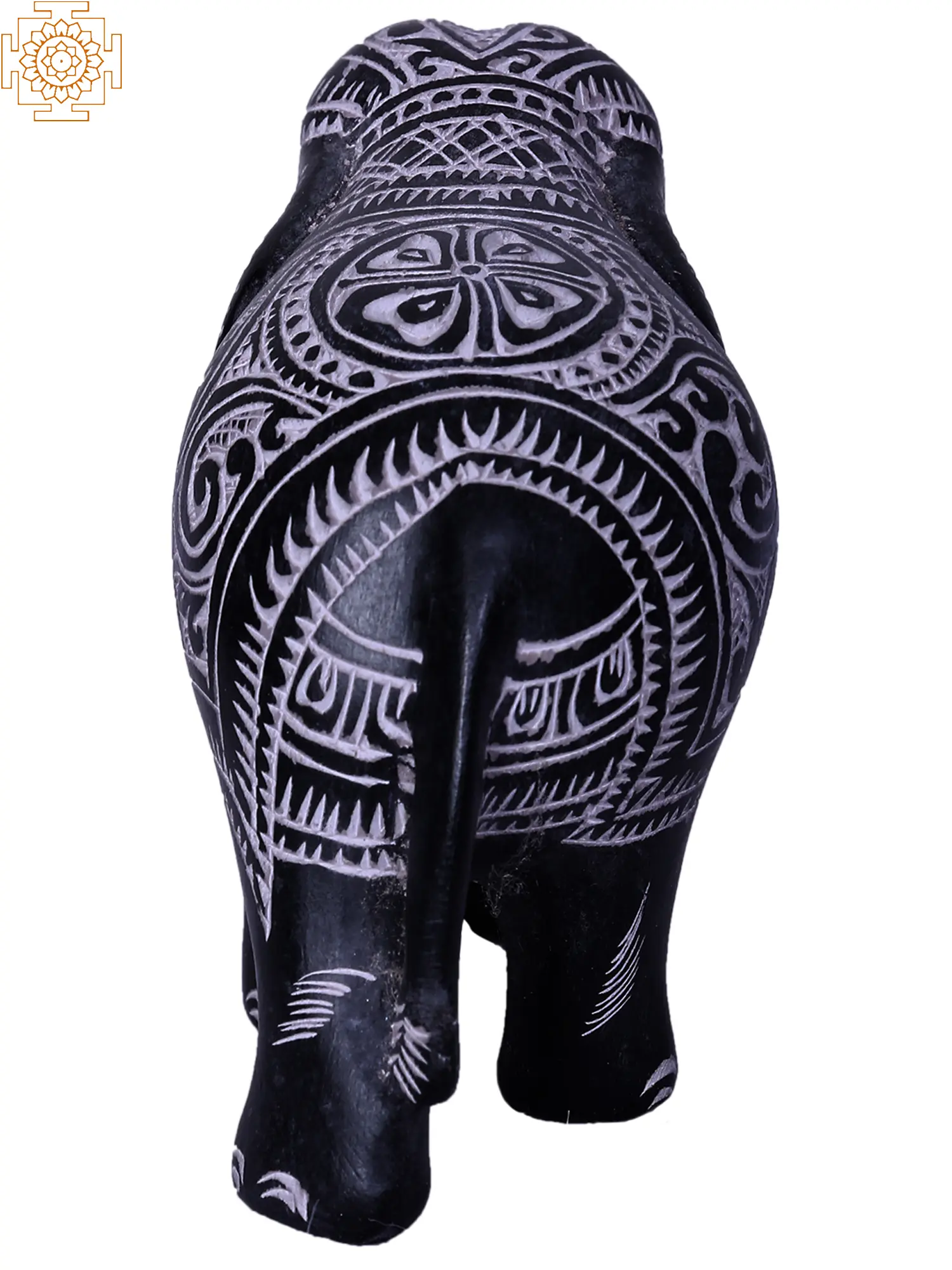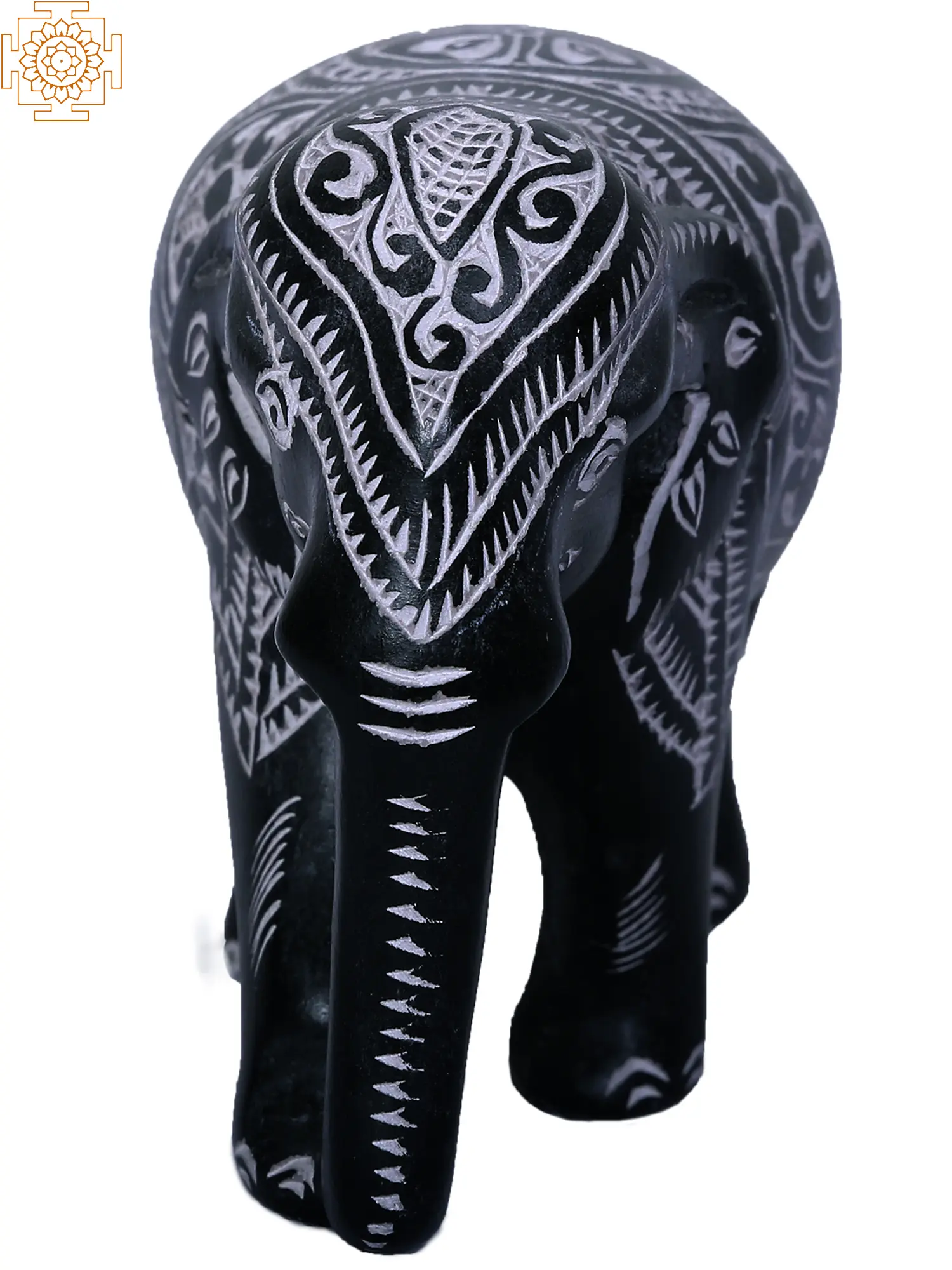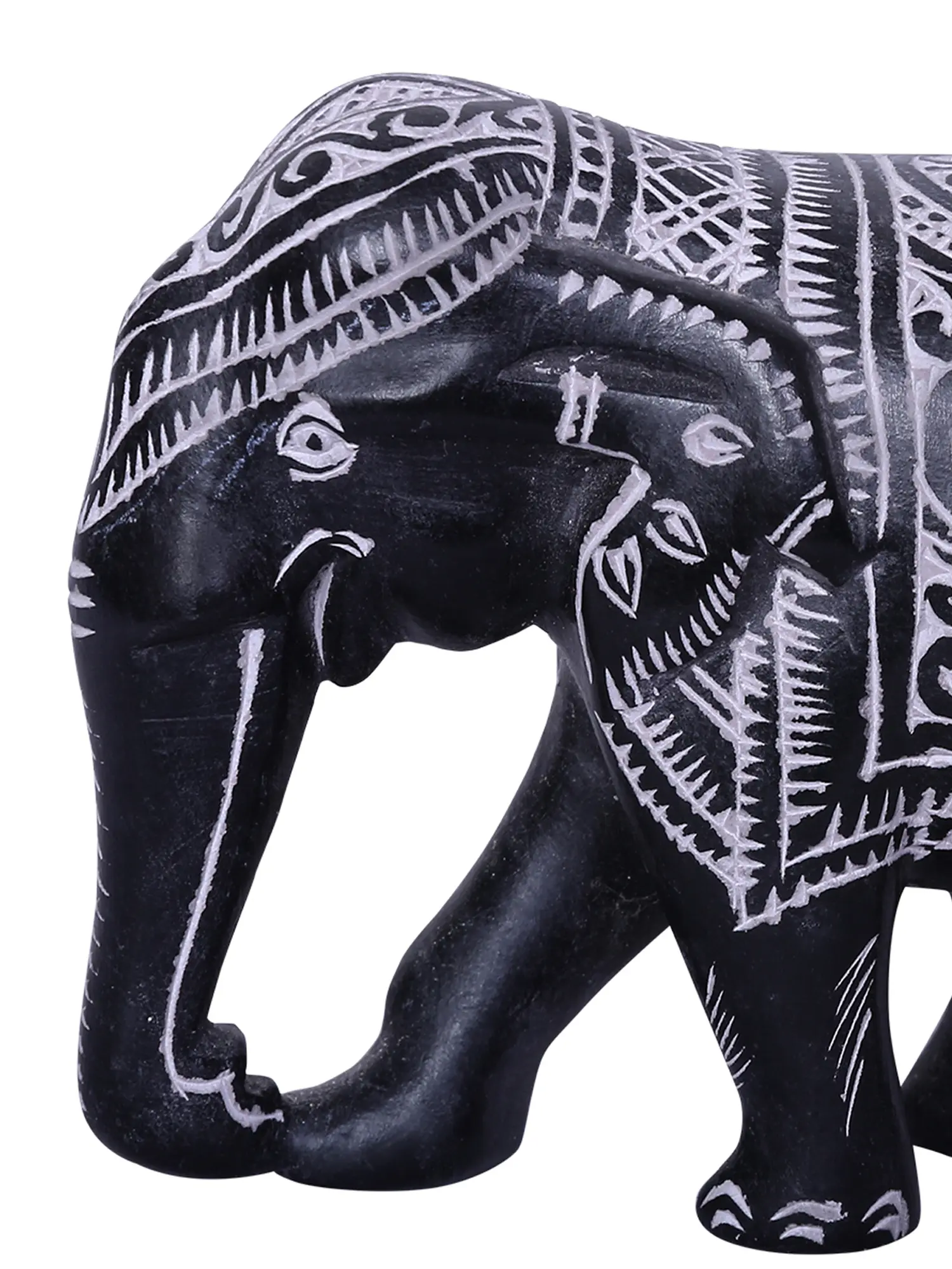This Elephant figurine, hailing from Mahabalipuram in South India, captivates with its elegance and cultural richness. Its striking black hue adorned with intricate white engravings exudes timeless beauty and craftsmanship. Placing this statue in a space instantly elevates its aesthetic appeal, infusing it with a sense of exoticism and sophistication.
