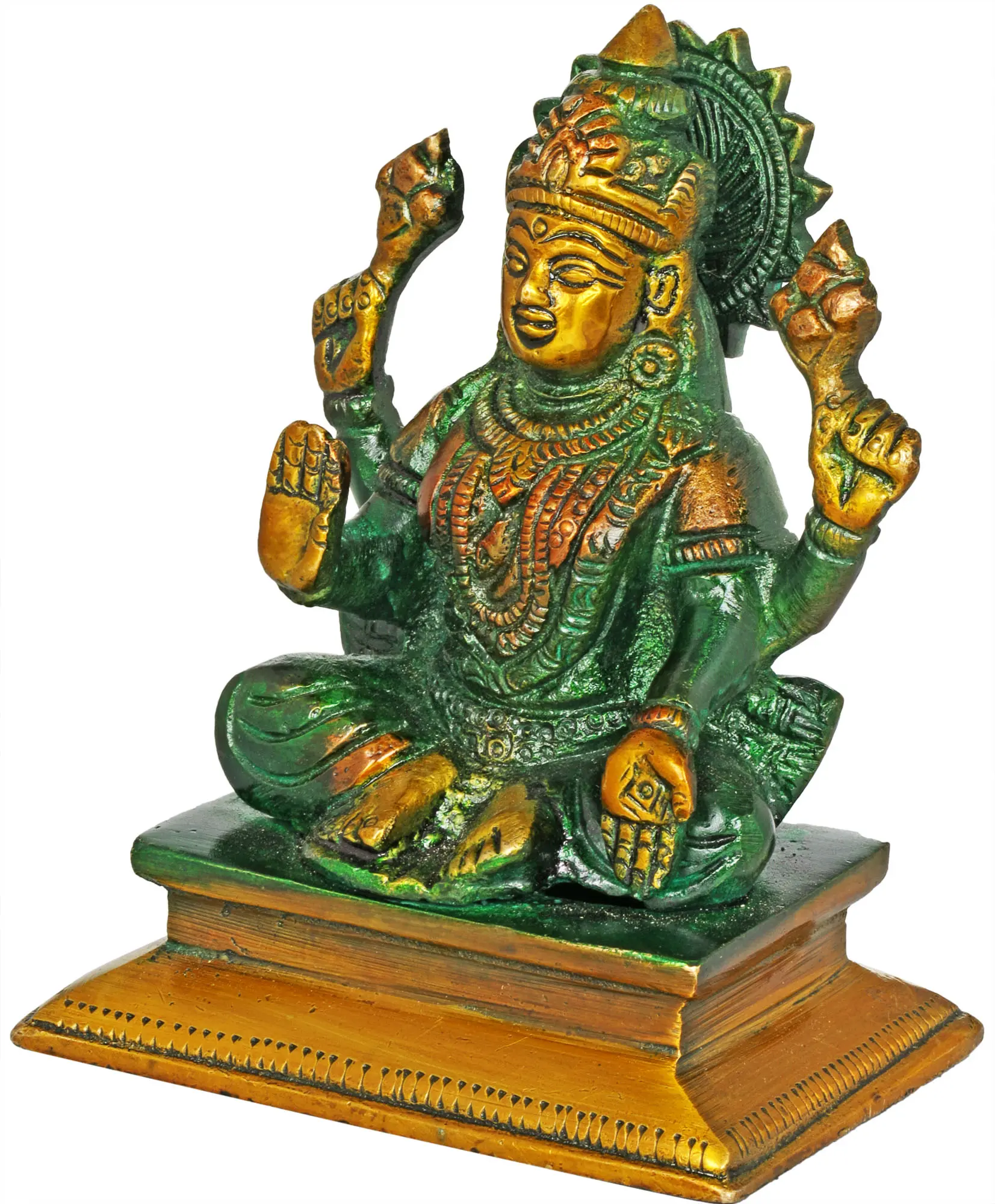 In Hindu tradition, Lakshmi, also known as “Shri”, is the goddess of power, fertility, prosperity, and associated with Maya (Illusion). Carrying a Lotus in her two hands, she symbolizes purity, beauty, and spiritual growth. Goddess Lakshmi sits in a Boon-Granting gesture (Ashirwad Mudra), embodying the epitome of divine blessings. Adorned in regal attire with resplendent jewelry, Goddess Lakshmi symbolizes fortune and wealth. Her radiant smile exudes compassion and love, inspiring hearts with hope and optimism. Painstakingly crafted in brass, this sacred art piece captures her divine essence, emanating grace and prosperity. Invoke her blessings and invite abundance into your home or sacred space with this divine symbol of wealth and wisdom.