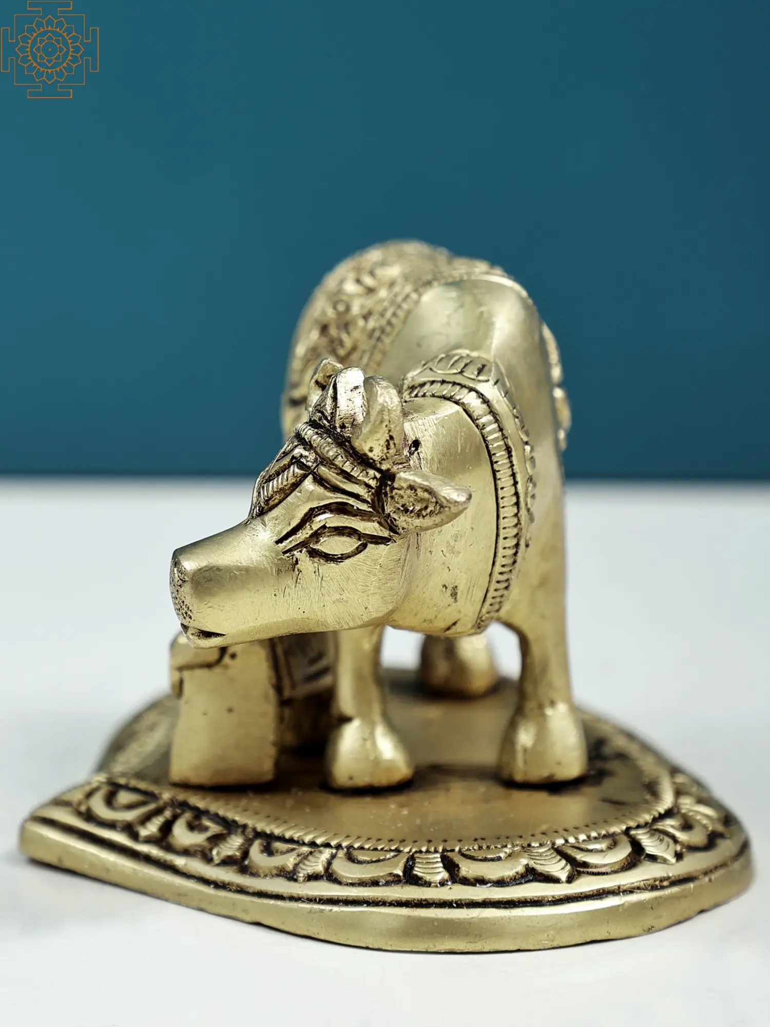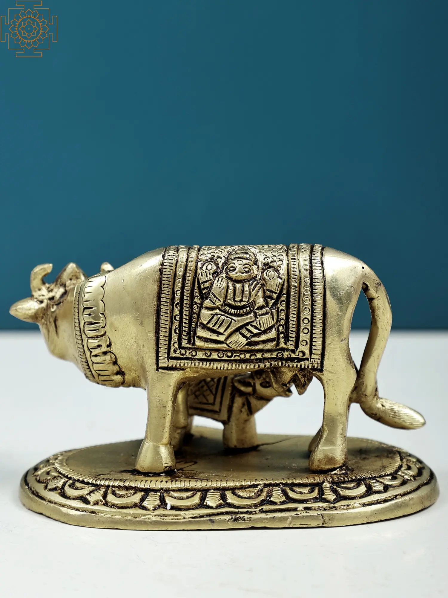 In the Hindu/Sanatan tradition, the cow is revered as a sacred mother, embodying qualities of purity, abundance, and gentleness. This brass sculpture honours the deep spiritual significance of the cow and its role as a provider of sustenance and blessings - depicting a mother cow gently nursing her calf, a timeless image that resonates with the essence of nurturing and protection; reflecting the universal truth of maternal care and the interconnectedness of all living beings.