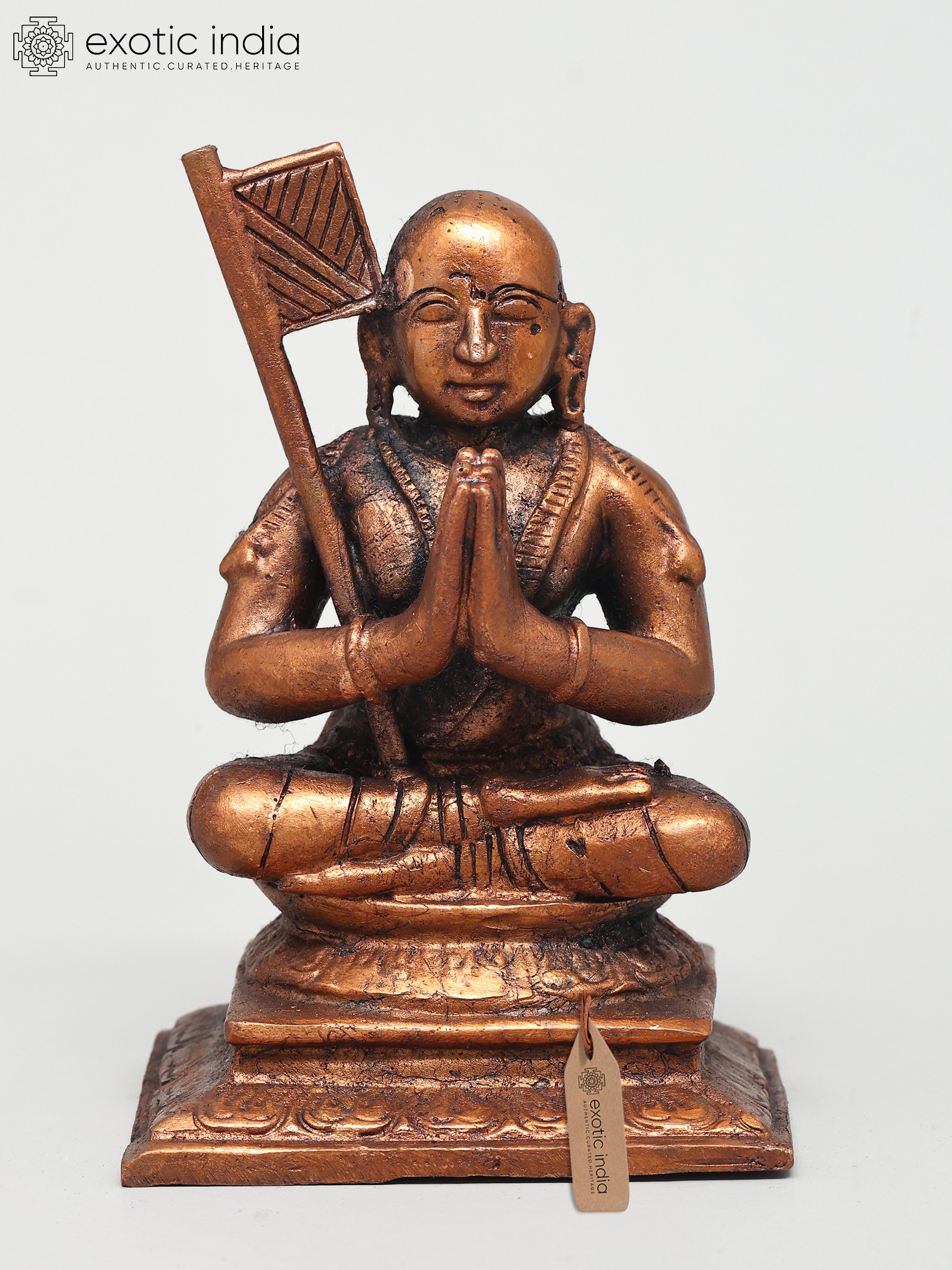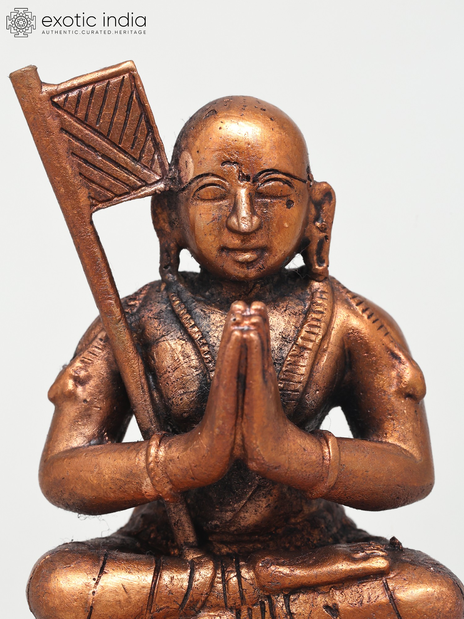 This exquisite copper statue captures the serene presence of Ramanujacharya, a pivotal figure in the history of Hindu philosophy and a revered Vaishnava saint. Seated in a meditative posture, with hands pressed together in namaste, this depiction radiates a profound sense of peace and devotion. The intricate details of the statue, from the finely rendered facial features to the symbolic flag held aloft, speak to the devotion and skill of the artisan. The copper medium itself lends a timeless quality, suggesting the enduring legacy of Ramanujacharya's teachings.
