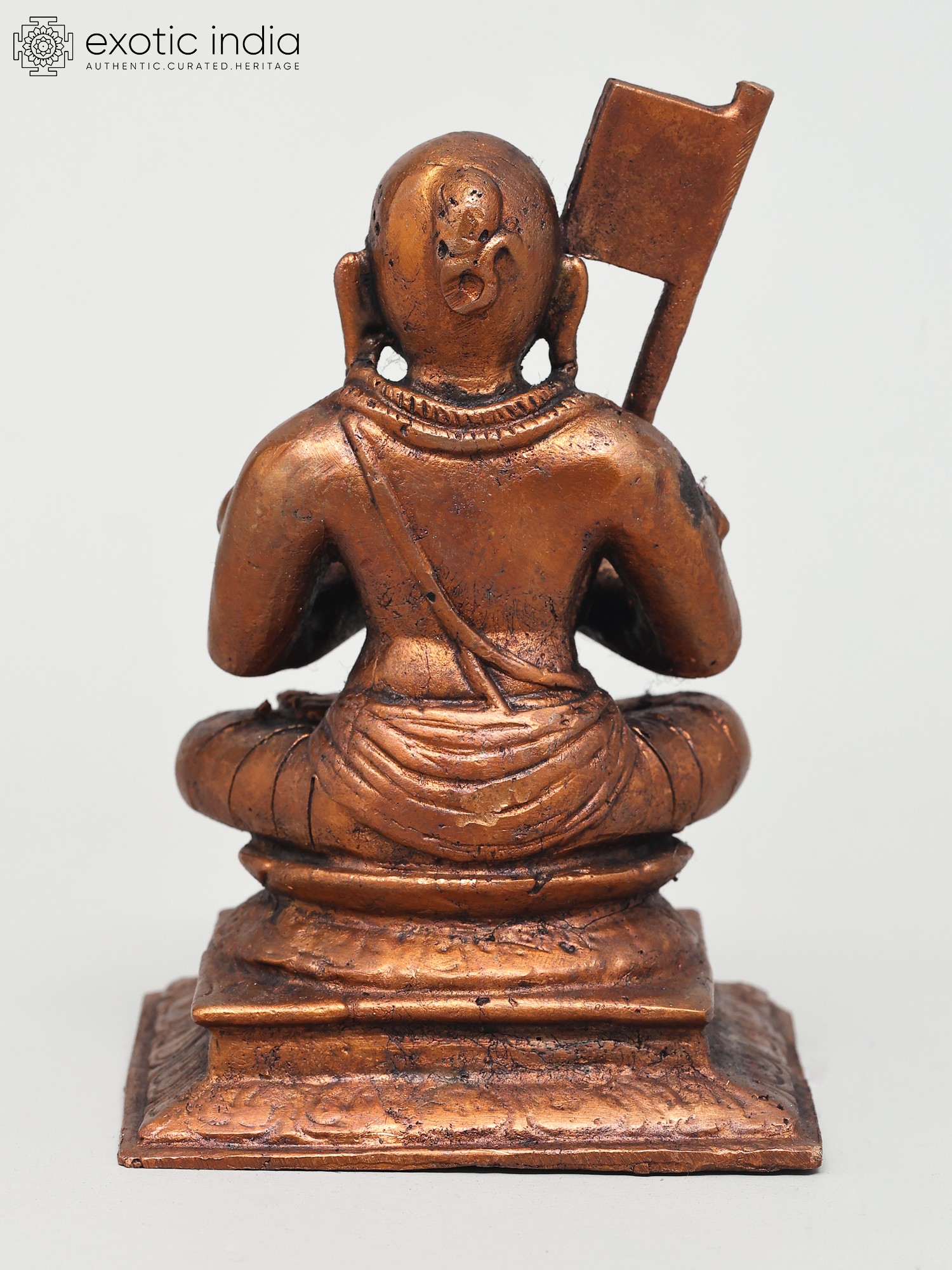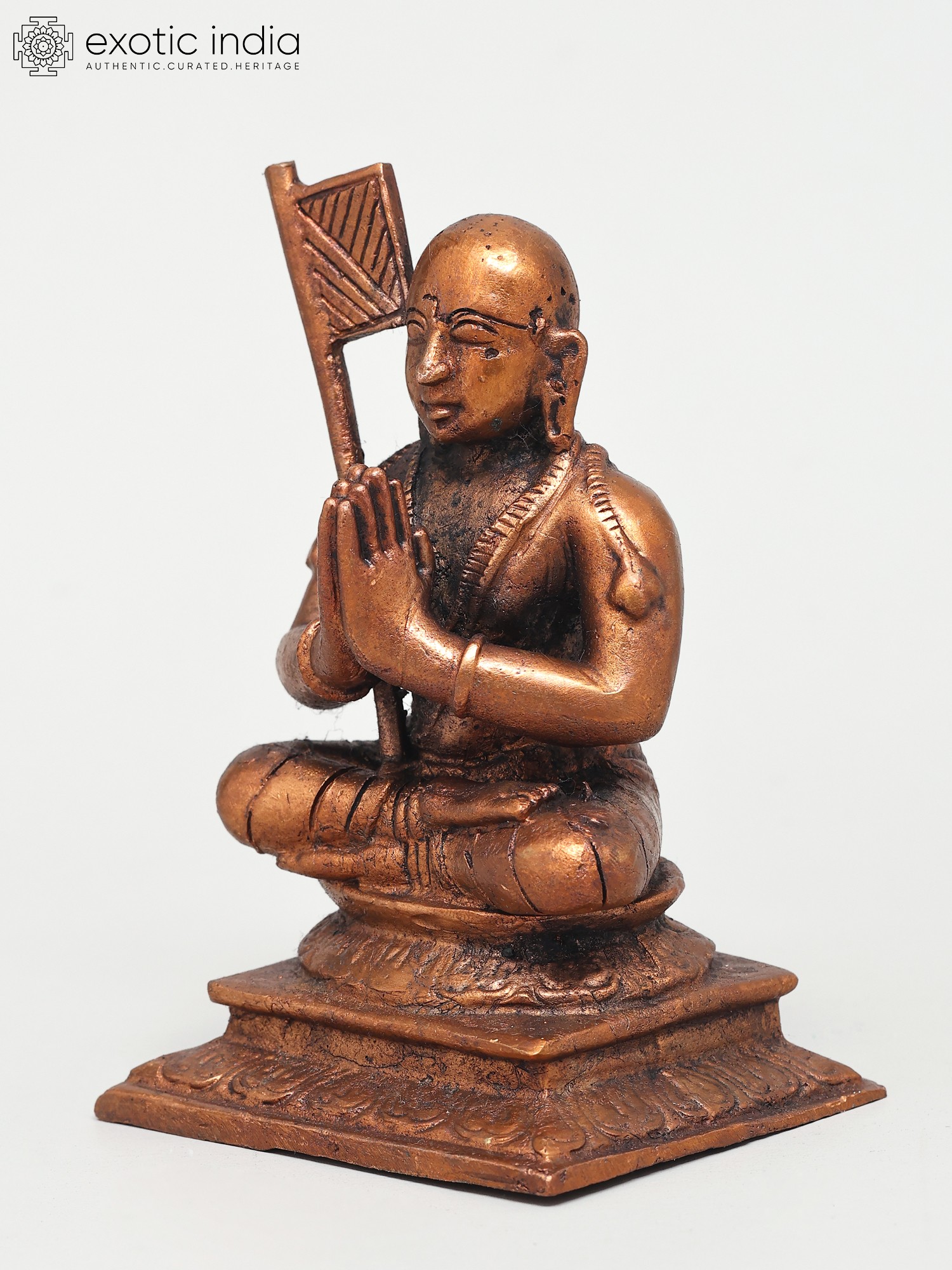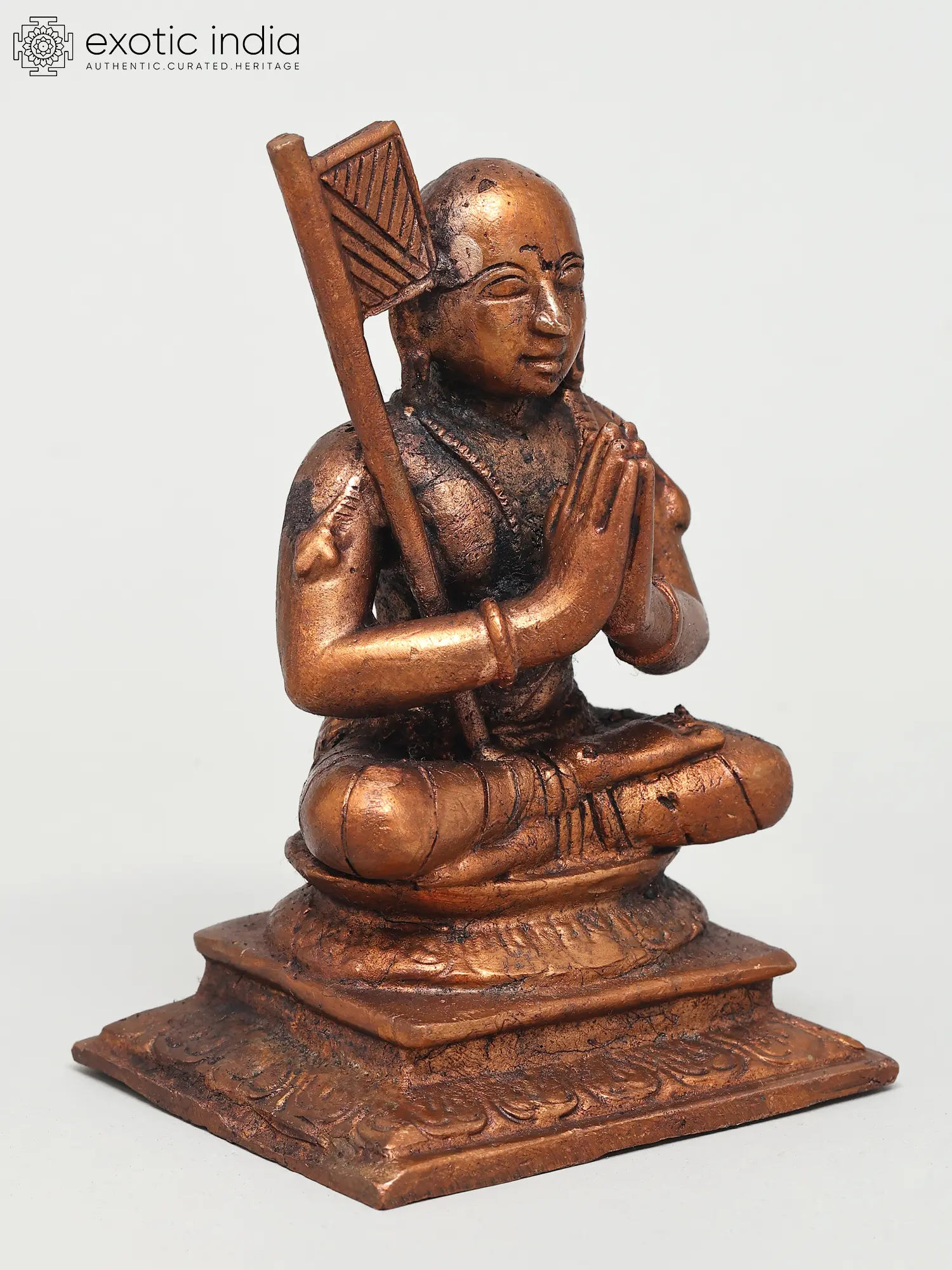 The posture of the statue, with the legs crossed and the body upright, signifies inner stability and control, essential for spiritual practice. The folded hands represent reverence and humility, core tenets of Bhakti yoga. The serene expression on Ramanujacharya's face invites contemplation and introspection, encouraging the viewer to connect with their own spiritual journey. This piece is more than just a decorative object; it is a tangible representation of profound philosophical thought and a testament to the rich artistic traditions of India, where religious icons are crafted with deep spiritual intention. The warm, earthy tones of the copper enhance the meditative aura of the sculpture, making it a captivating addition to any sacred space or personal altar.