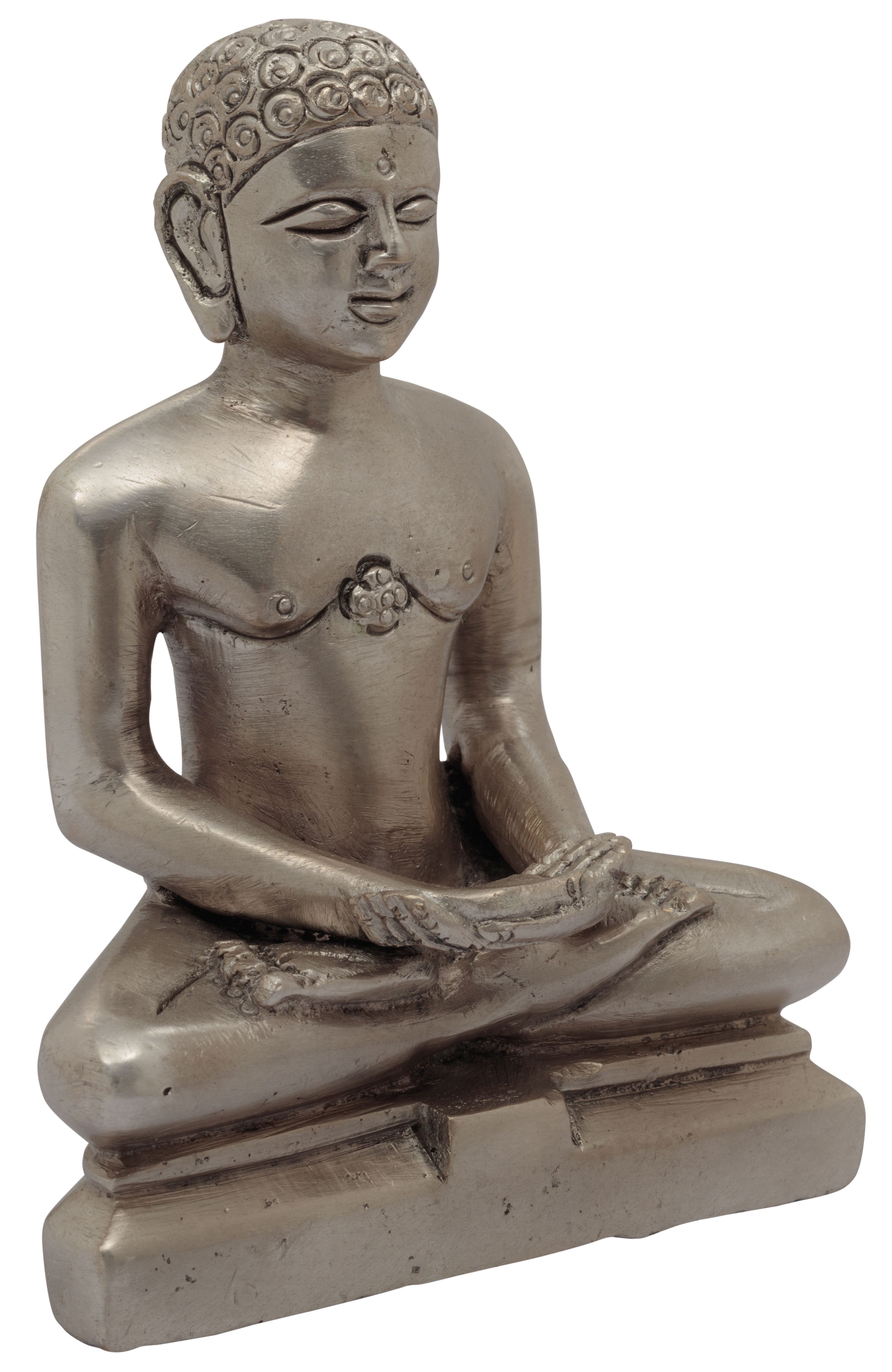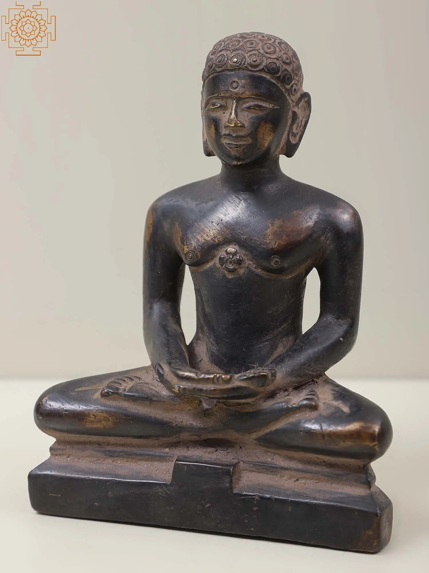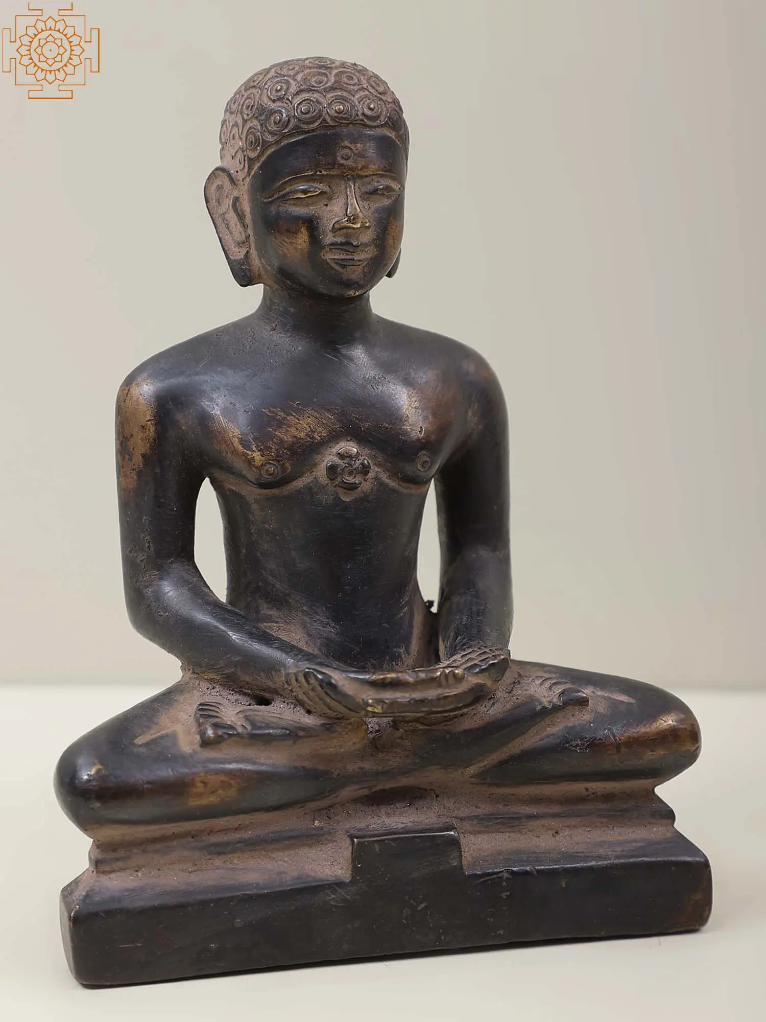 "The soul knows no birth or death." This minutely detailed brass sculpture embodies the enlightened spirit of a Jain Tirthankara, a liberated soul who guides others toward liberation. With serene eyes gazing inward, the Tirthankara's deep meditation resonates. The hand gestures symbolize fearlessness, detachment, and spiritual enlightenment. Adorned in simple attire, the Tirthankara emphasizes detachment from materialism. The beautiful sculpture here invites one to seek the timeless wisdom within, transcending the cycles of birth and death.