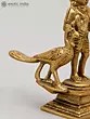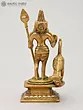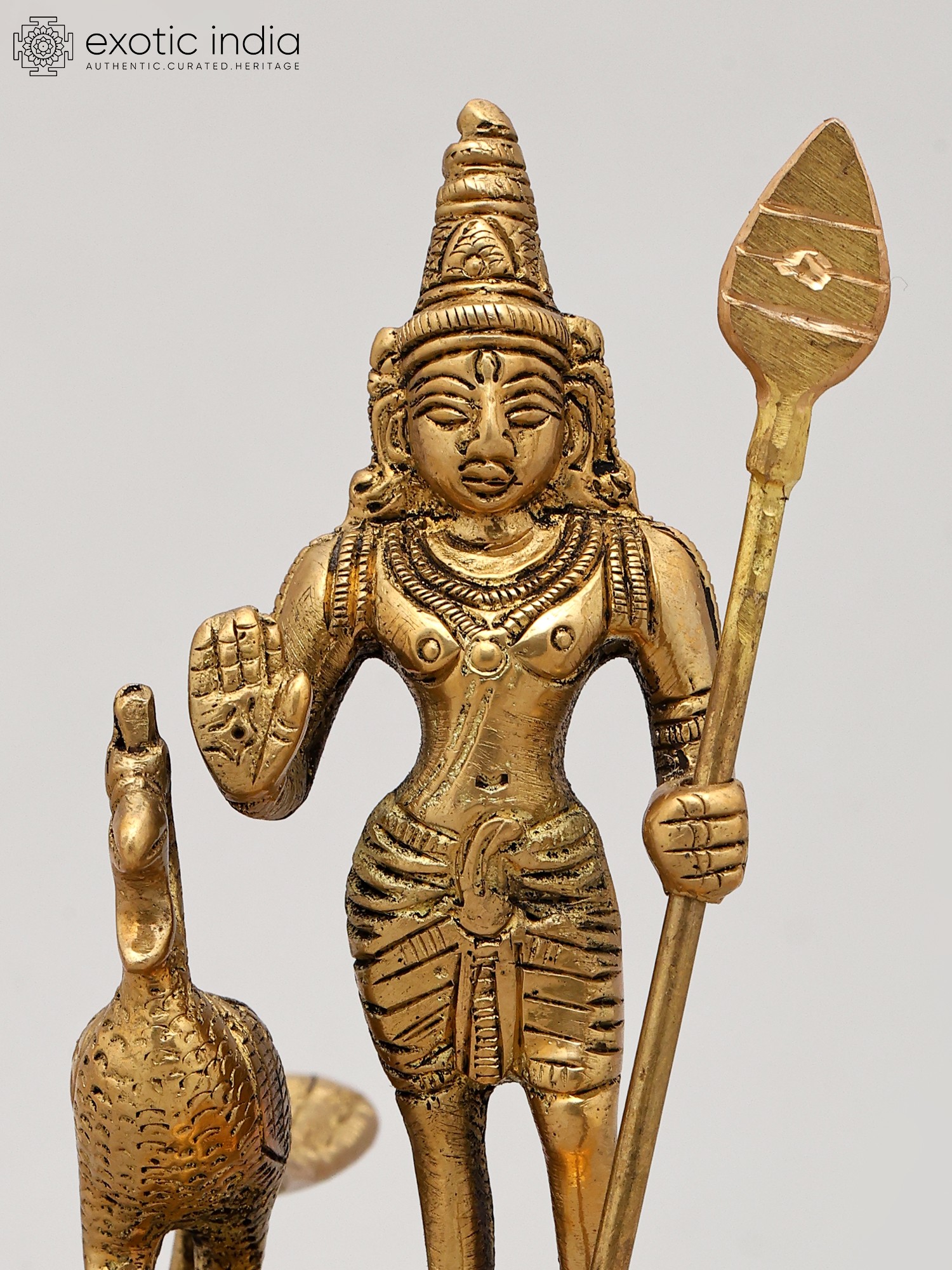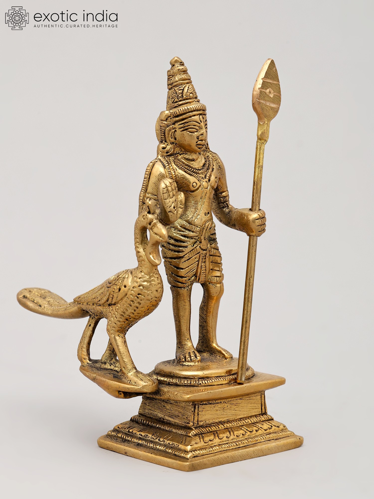 This brass murti shows him on a platform, with his famous spear in his left hand and his right hand making the gesture of fearlessness. His vahana and companion, Paravani rests close to his lord. Kumara is wearing a short dhoti and a conical mukut (crown). In a calm and composed manner, lord Kartikeya protects his devotees while imparting to them the true wisdom and knowledge of the Brahama, the Ultimate Truth.