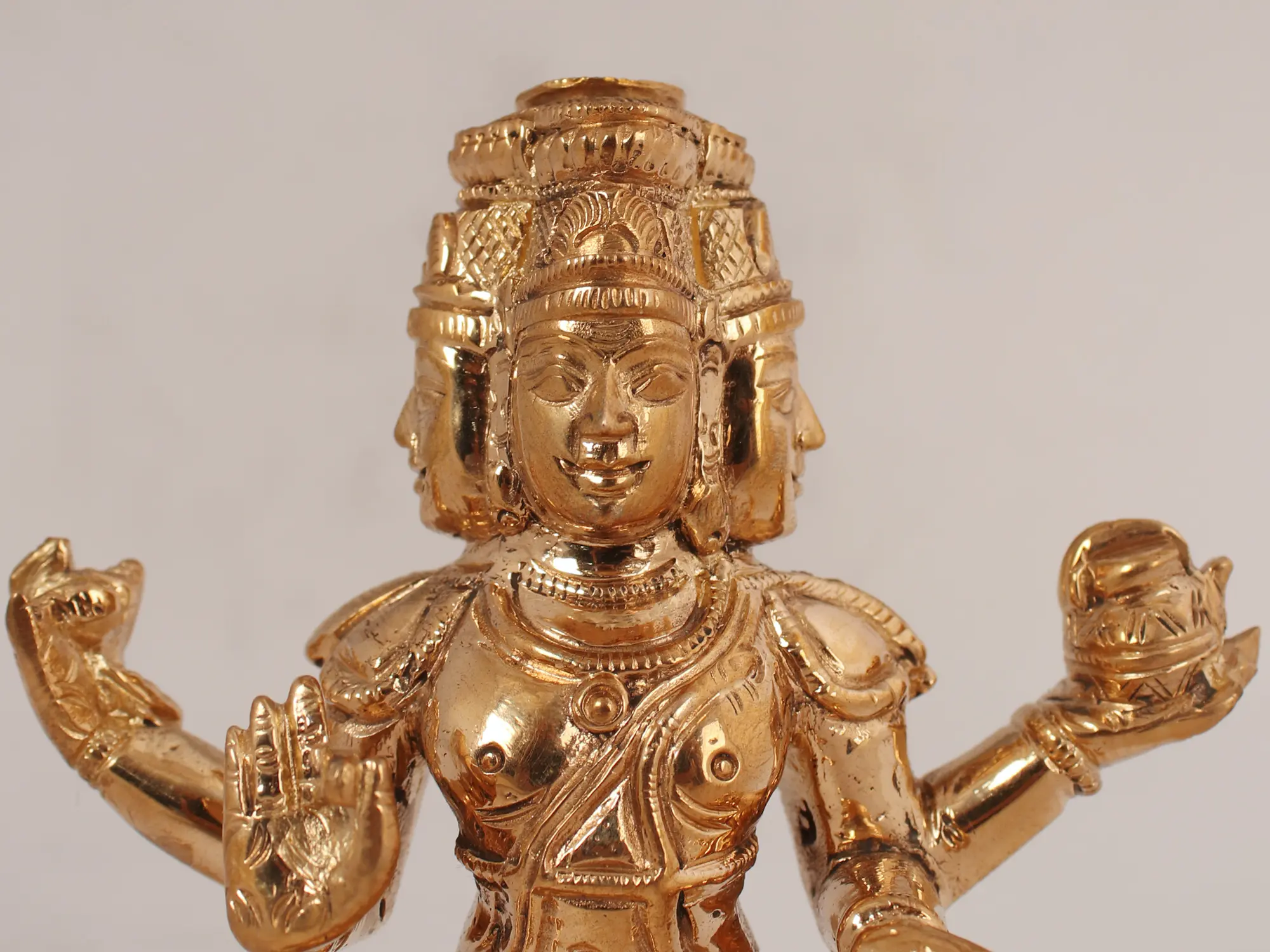 This exquisite bronze statue captures the essence of Lord Brahma, the revered creator god in Hinduism, seated majestically upon a blooming lotus. With its intricate details and radiant golden finish, this artwork is a testament to the skill of the artisan and a divine addition to any sacred space or collection. Lord Brahma is traditionally depicted with four heads, each facing a cardinal direction, symbolizing his omnipresence and the four Vedas, the ancient scriptures of knowledge. These heads represent his mastery over the four cosmic directions and his role in observing all aspects of creation. In this striking representation, Brahma’s serene countenance, adorned with divine jewelry and a regal headdress, exudes a sense of profound wisdom and cosmic order. His four arms are posed gracefully, each holding symbolic items crucial to his divine functions. One hand is raised in the Abhaya Mudra, bestowing blessings and protection. Another typically holds the Vedas, representing divine knowledge, while the other hands might carry a mala (rosary) for meditation or a Kamandalu (water pot) symbolizing the creative essence of the universe. The lotus upon which he is seated is a powerful symbol in Hinduism, representing purity, divine beauty, and spiritual awakening, as it grows from muddy waters to bloom unblemished. The story of Brahma's creation is deeply woven into Hindu cosmology. It is believed that he emerged from a lotus that blossomed from the navel of Lord Vishnu, the preserver, during the cosmic dissolution. From this primordial lotus, Brahma began the process of creation, bringing forth the universe, the celestial beings, and all life forms. The four faces are said to be his contemplation of the four Vedas, which form the foundation of Dharma and spiritual understanding. The serene expression on each face reflects his role as the ultimate architect, whose plans are perfect and all-encompassing.