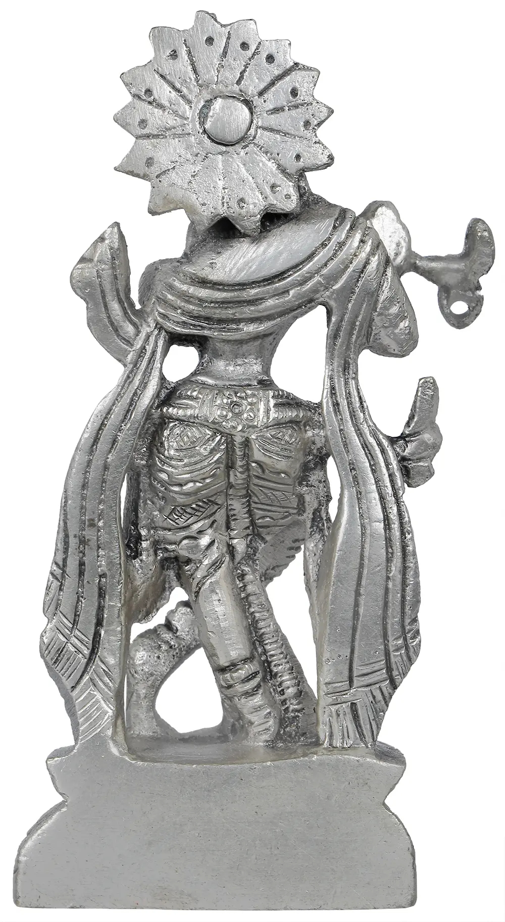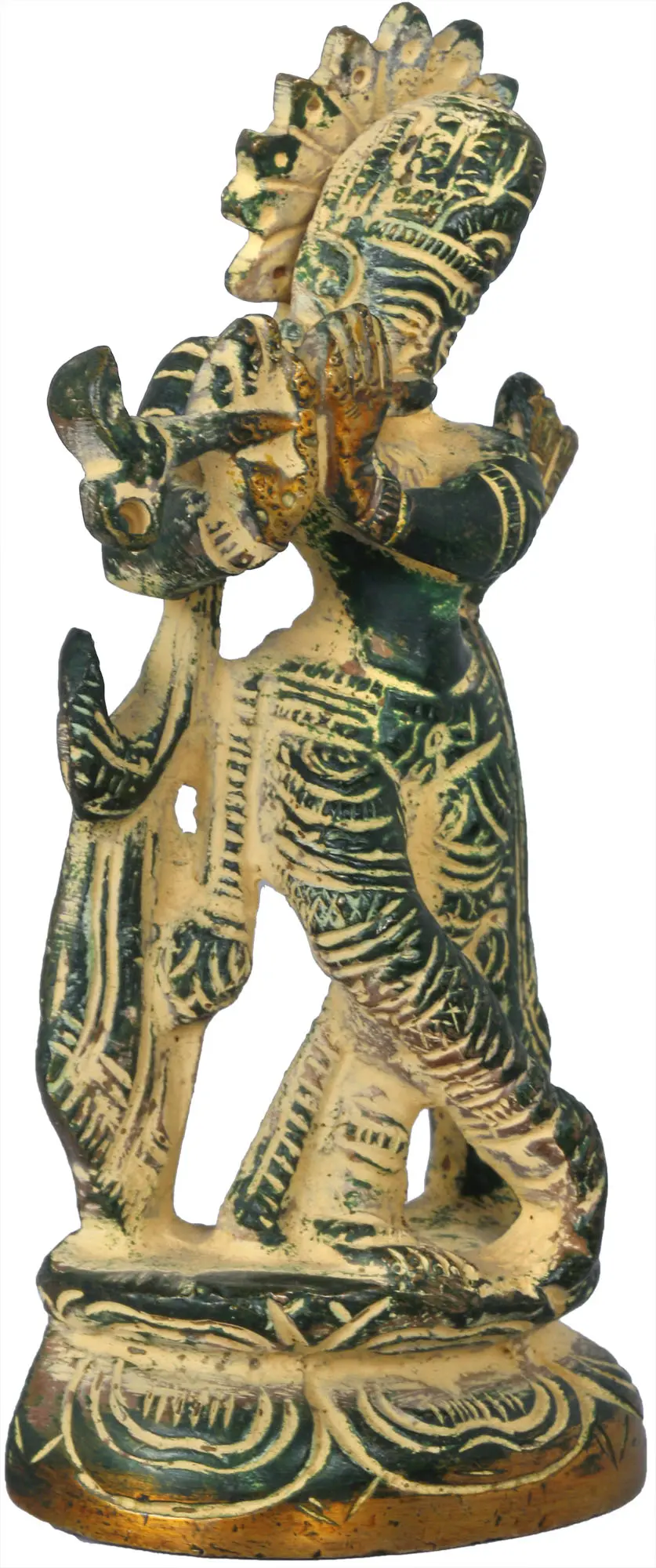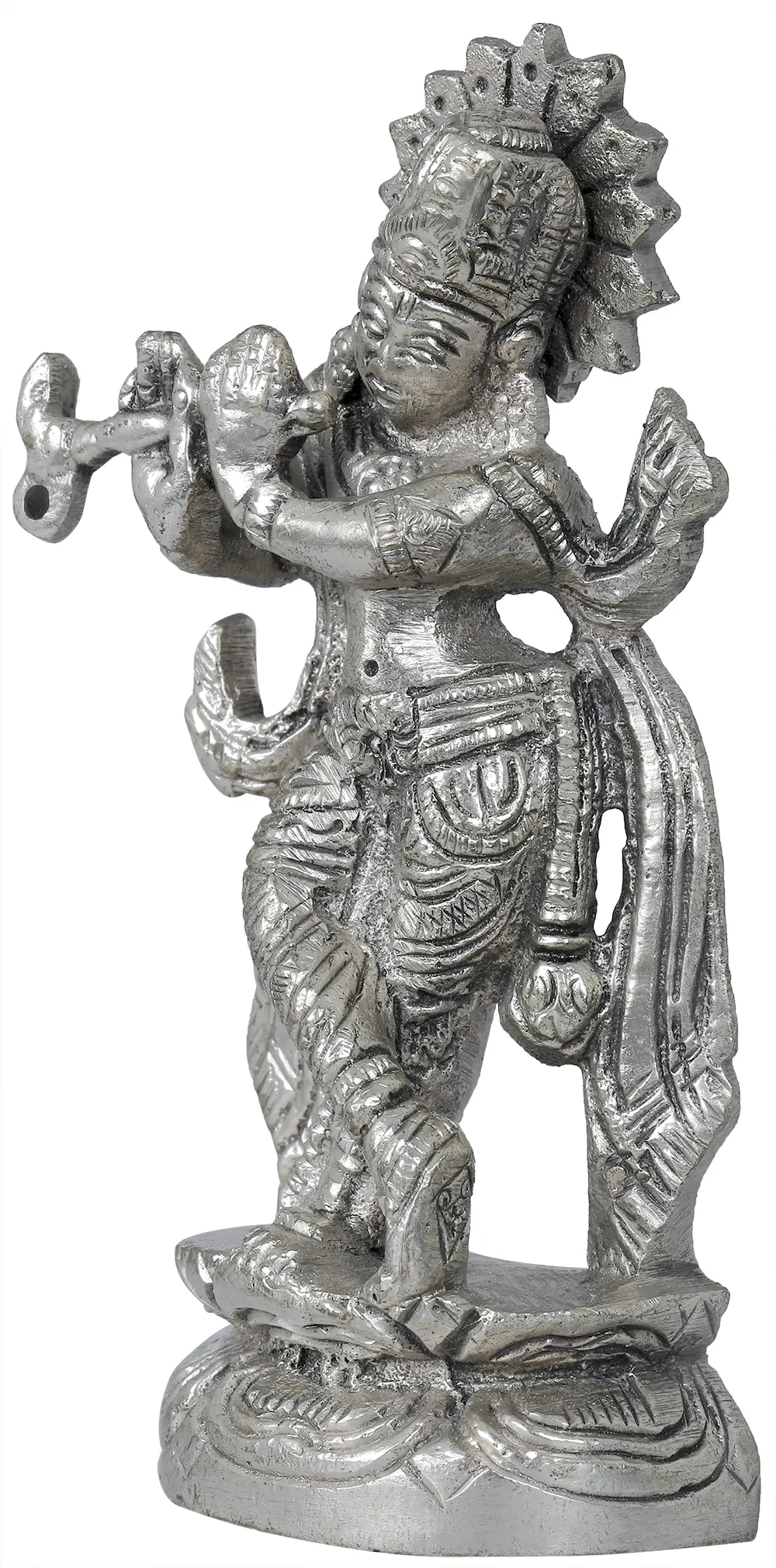 In Hindu scriptures, Lord Krishna is a revered deity. Known as the eighth avatar of Lord Vishnu, he is regarded as a divine incarnation and a symbol of love, compassion, and wisdom. Krishna’s enchanting persona captivates devotees with his playful nature, melodious flute, evoking a sense of Love and devotion. Crafted with intricate artistry, every contour and curve of the deity’s form exudes ethereal beauty. This magnificent work of art reveals the transcendental realm, where ecstasy and devotion happily coexist, inspiring an enduring resonance in the very core of your soul. With its all-encompassing aura of tranquilly and spirituality, this stunning work of art is the perfect addition to your home or altar.