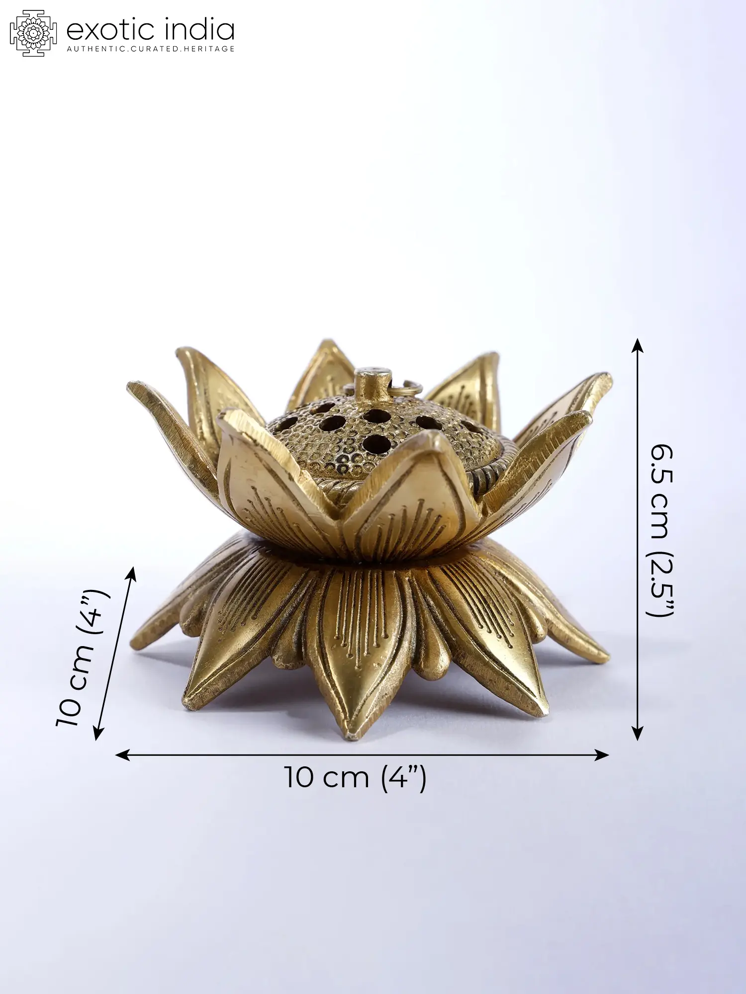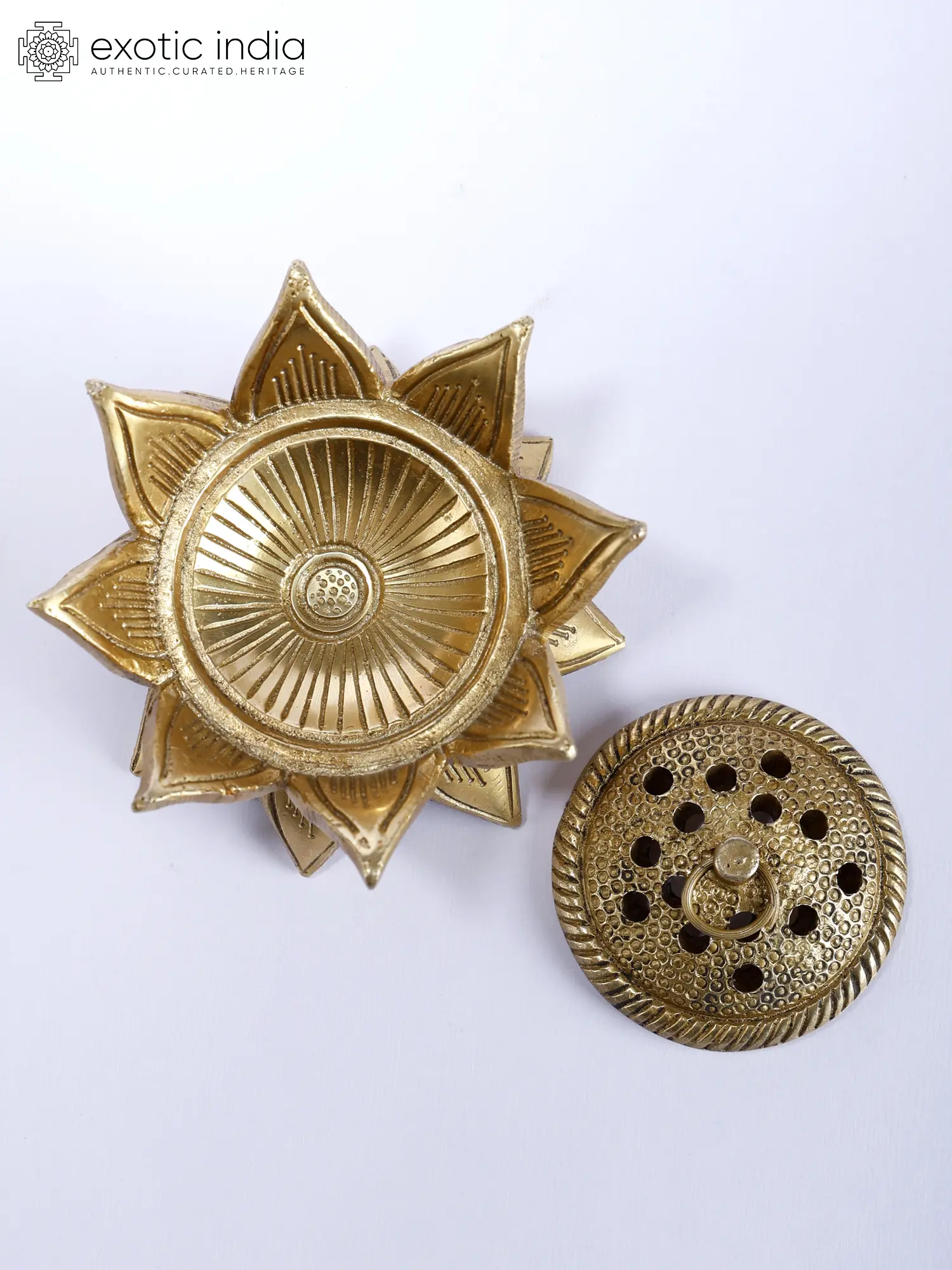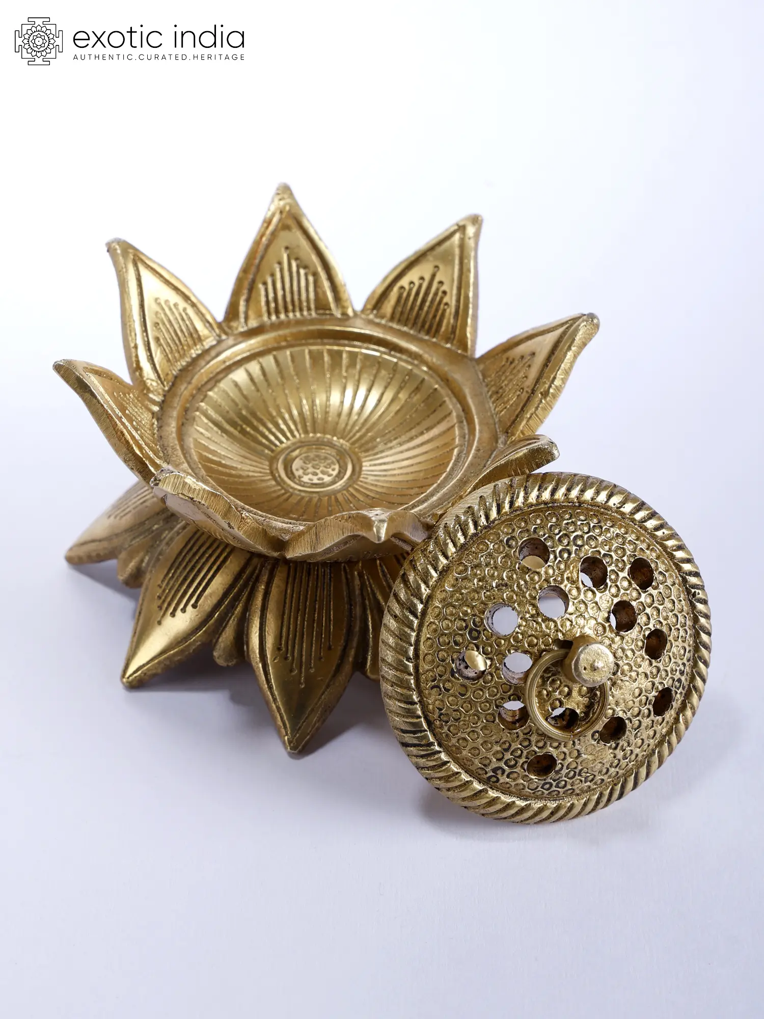 This Lotus Design Dhoop Dani in Brass is a masterpiece of craftsmanship, showcasing exquisite detail. The inside of the Dhoop Dani is etched precisely like a real lotus flower, capturing the intricacies of its petals. The lid resembles a lotus seedpod, adding to its authenticity.