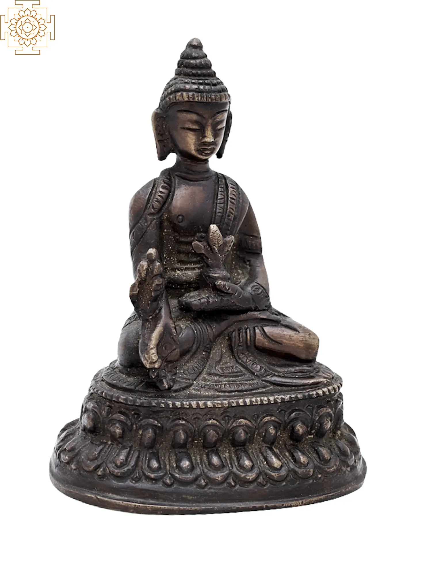 This heavenly brass sculpture showcases the Medicine Buddha, a revered figure in Tibetan Buddhism. With the right hand in the gesture of granting protection and the left hand holding a bowl of healing nectar, he embodies compassionate healing energy. His deep blue complexion symbolizes the boundless sky, signifying vastness and wisdom. Resting gracefully on a lotus pedestal, the Medicine Buddha brings physical and spiritual healing to all sentient beings. As we connect with this compassionate deity, we are encouraged to cultivate inner peace and extend healing energy to ourselves and others on the journey of well-being and enlightenment.