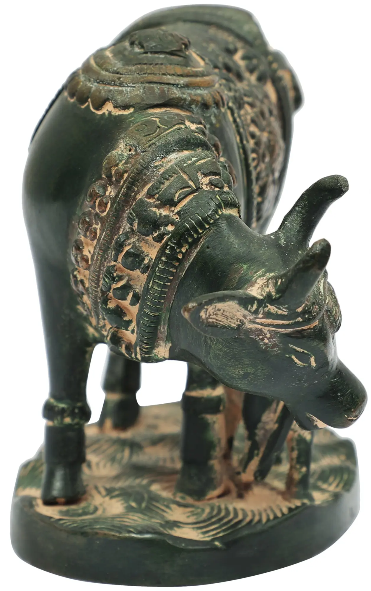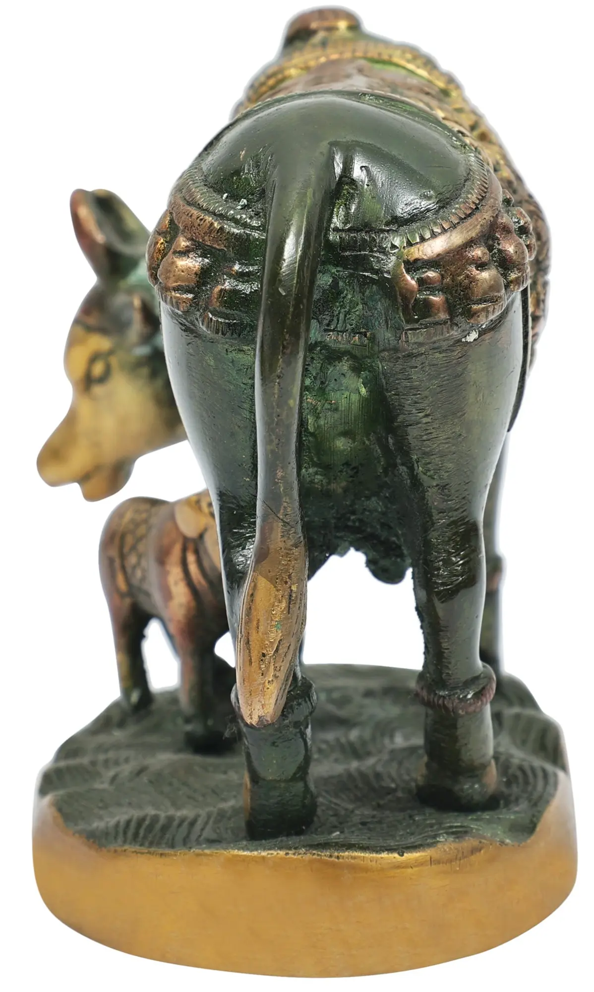 In this heartwarming sculpture, a mother cow lovingly suckles her calf, symbolizing the epitome of maternal care and nurturing. The bond between mother and calf is beautifully captured as they share this mesmerizing moment of nourishment and affection. The calf finds security and sustenance in its mother’s presence. Adorned with a beautiful robe and bells, the mother cow embodies grace and dignity, symbolizing the sacredness of the cow in various societies. This brass creation serves as a beautiful reminder of the sanctity of life, emphasizing the need to cherish and protect all living beings with the same tenderness and love exhibited by the Mother Cow.