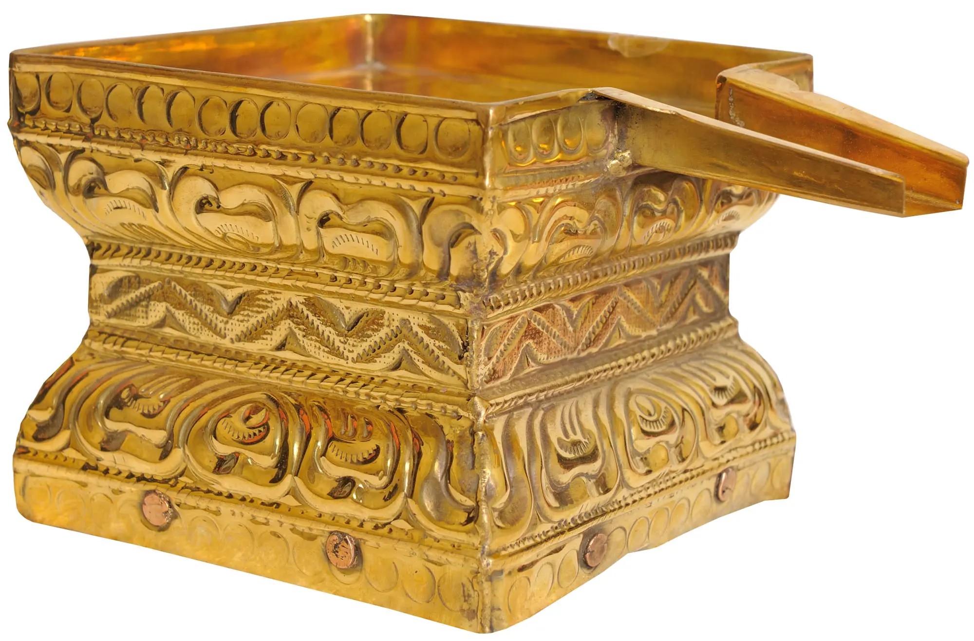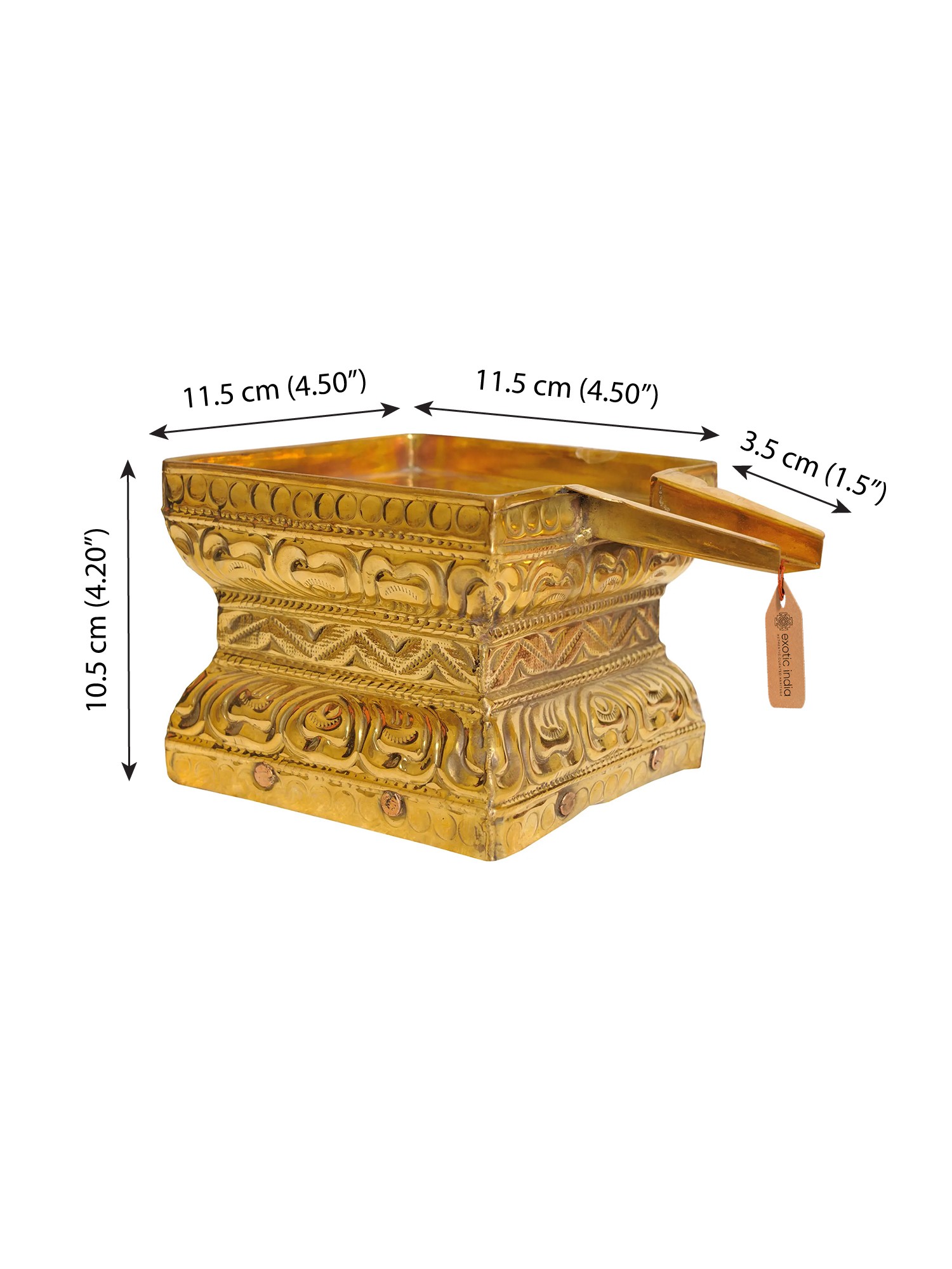 It is made of brass from South India, the land of rich culture, art and tradition, and comes with ornamental designs on its body. The tray of the Patra is rectangular in shape and is suitable for placing one or two deities at the same time. The deities are given holy bath and all the liquid offerings are allowed to pass through an outlet and collected in a separate vessel.