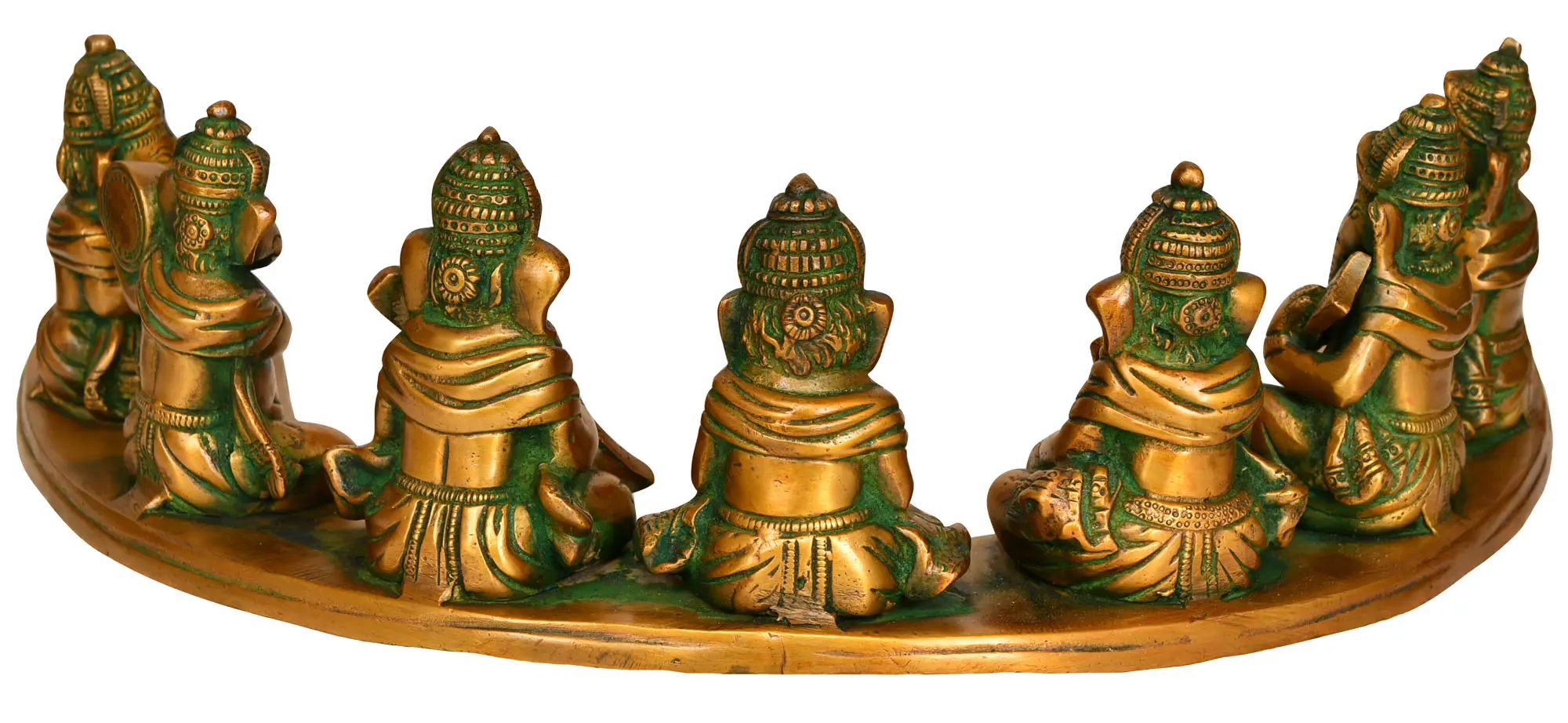 Here Ganesha has manifested himself in seven forms. So, each form is individually engaged in playing a particular musical instrument and all the seven forms are sitting together in a semi-circular row.