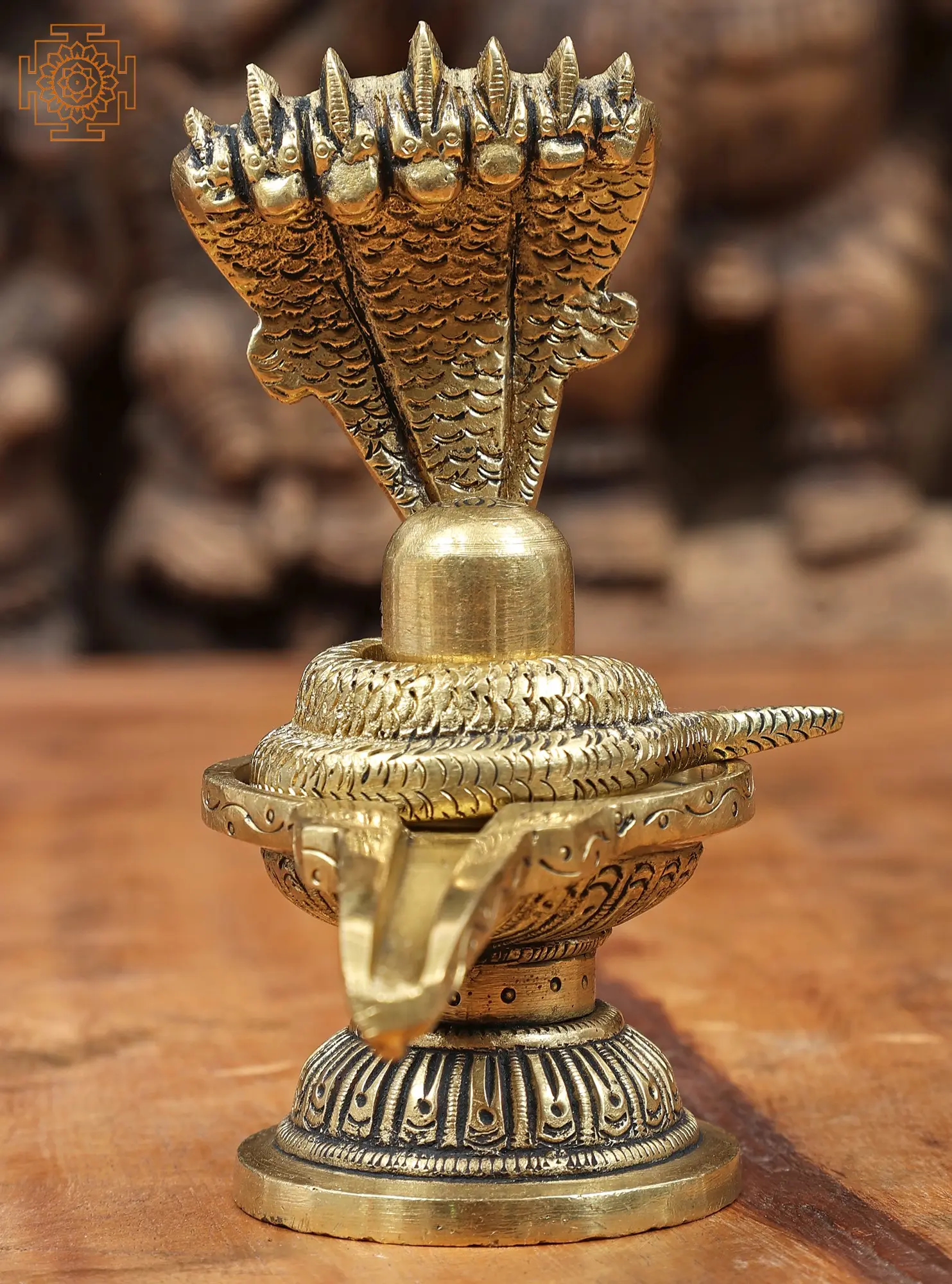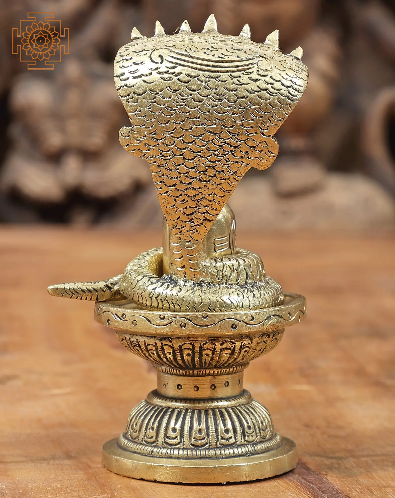 Shiva Linga, a representation of “Lord Shiva”, symbolises “Creation”, “Preservation”, and “Destruction”. In this brass rendition, “Shiva Linga” rests beneath the sheltering embrace of a seven-hooded serpent. The serpent, representing divine energy, signifies protection and power. The serpent’s guardianship over the Linga signifies “the balance of cosmic forces” and the “eternal dance of existence”. Together, the imagery embodies the “Cyclical Nature of Life and the Universe”. This mesmerising artwork fosters a profound connection with the divine, promoting inner peace, clarity, and emotional balance.