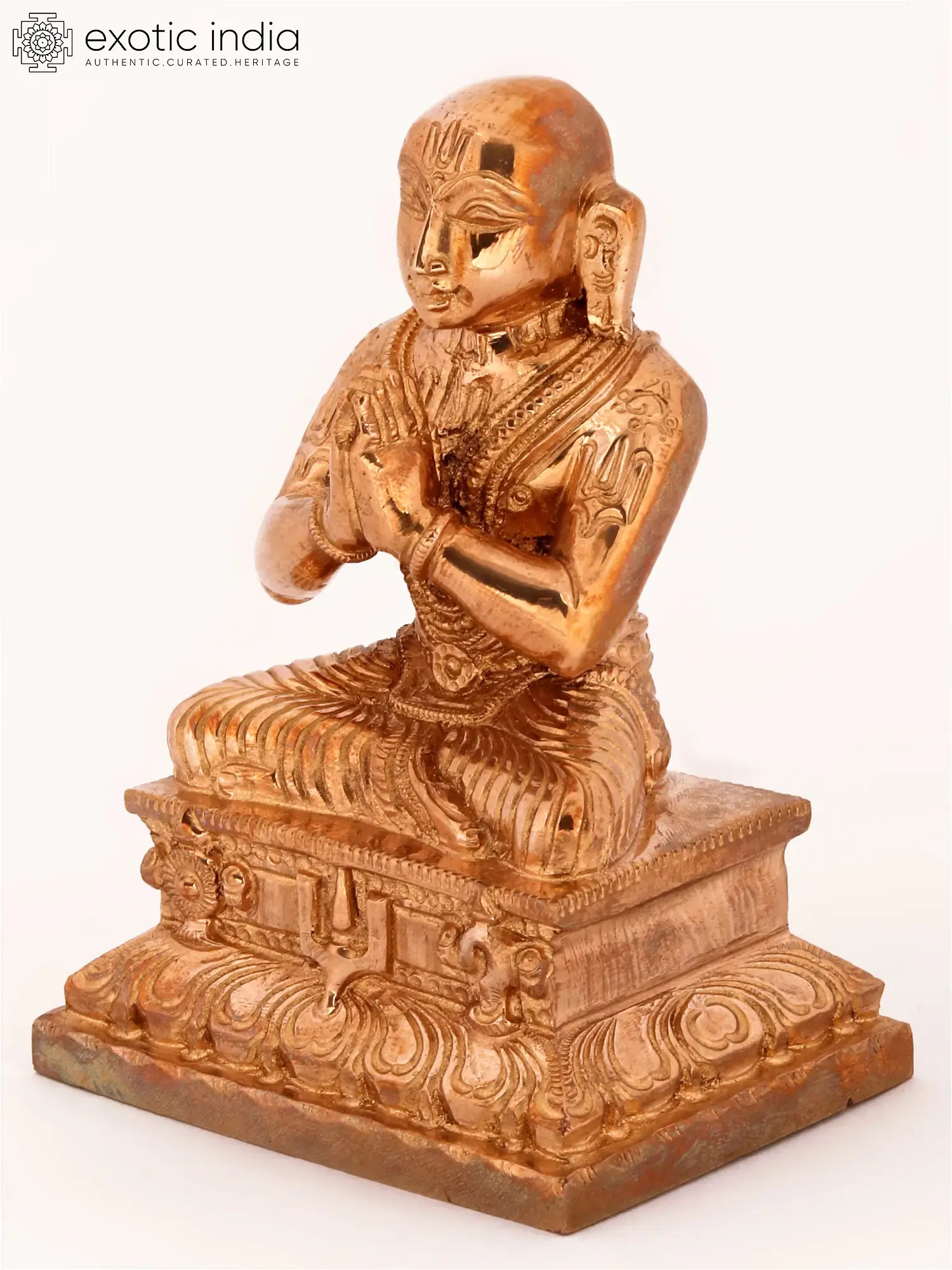 A major exponent of the Shri Vaishnav tradition - Ramajanucharya came to be known for his devotion, reforms, and philosophical contributions. His major works include the Sanskrit texts of Shri Bhashya, Vedarthasangraha, and the Bhagavad Gita Bhashya. This bronze statue of Acharya Ramanuja represents his eyes closed in Bhakti Bhava, seated in a padmasana - his hands joined together, we see the Vaishnav Tilaks on his forehead and both arms. On the pedestal’s face - The Sudarshan Chakra, Vishnu Tilak, and Panchajanya inform our conscience to remember the Swami of the universe - Shri Vishnu, in duality and non-duality.