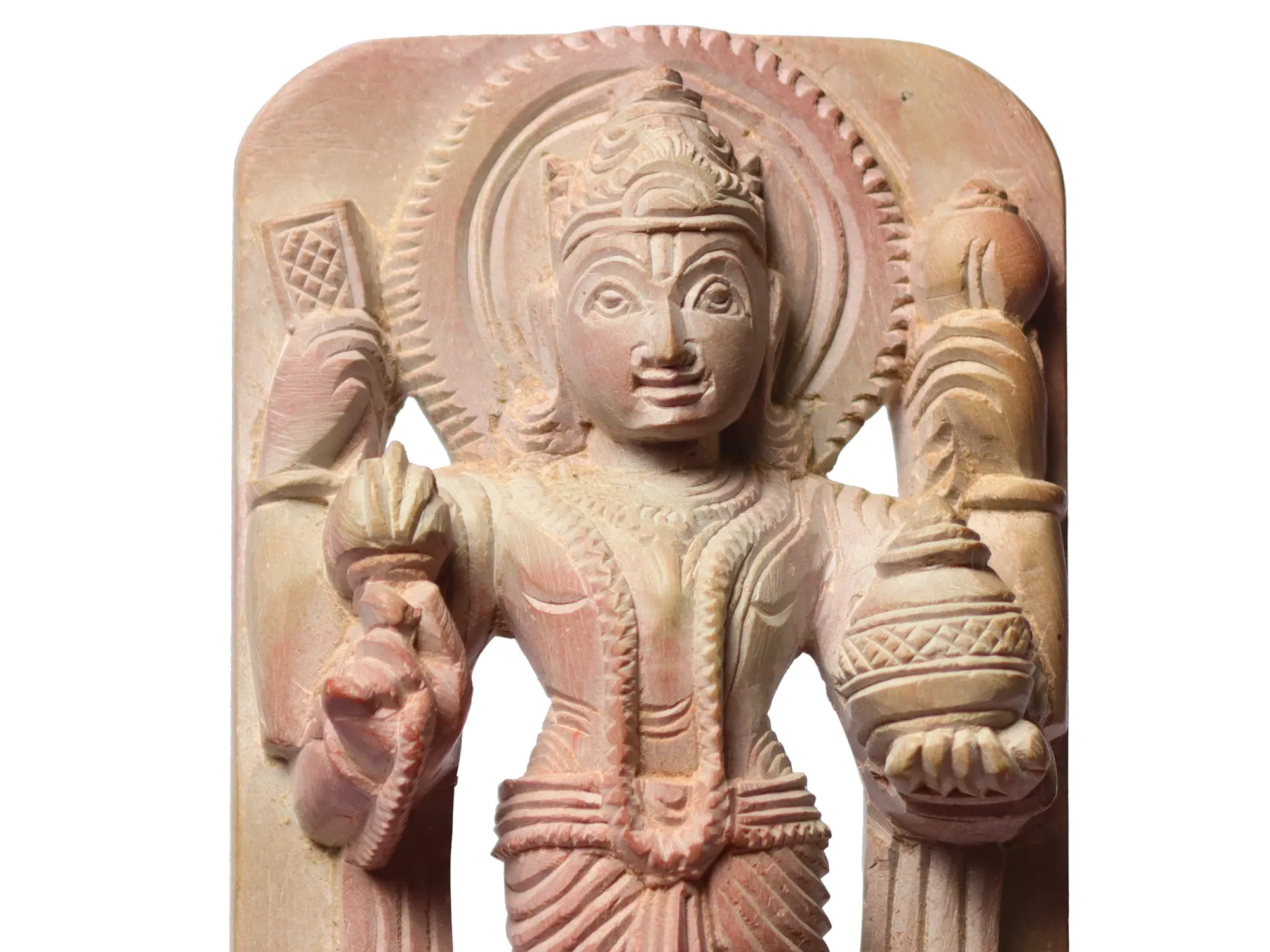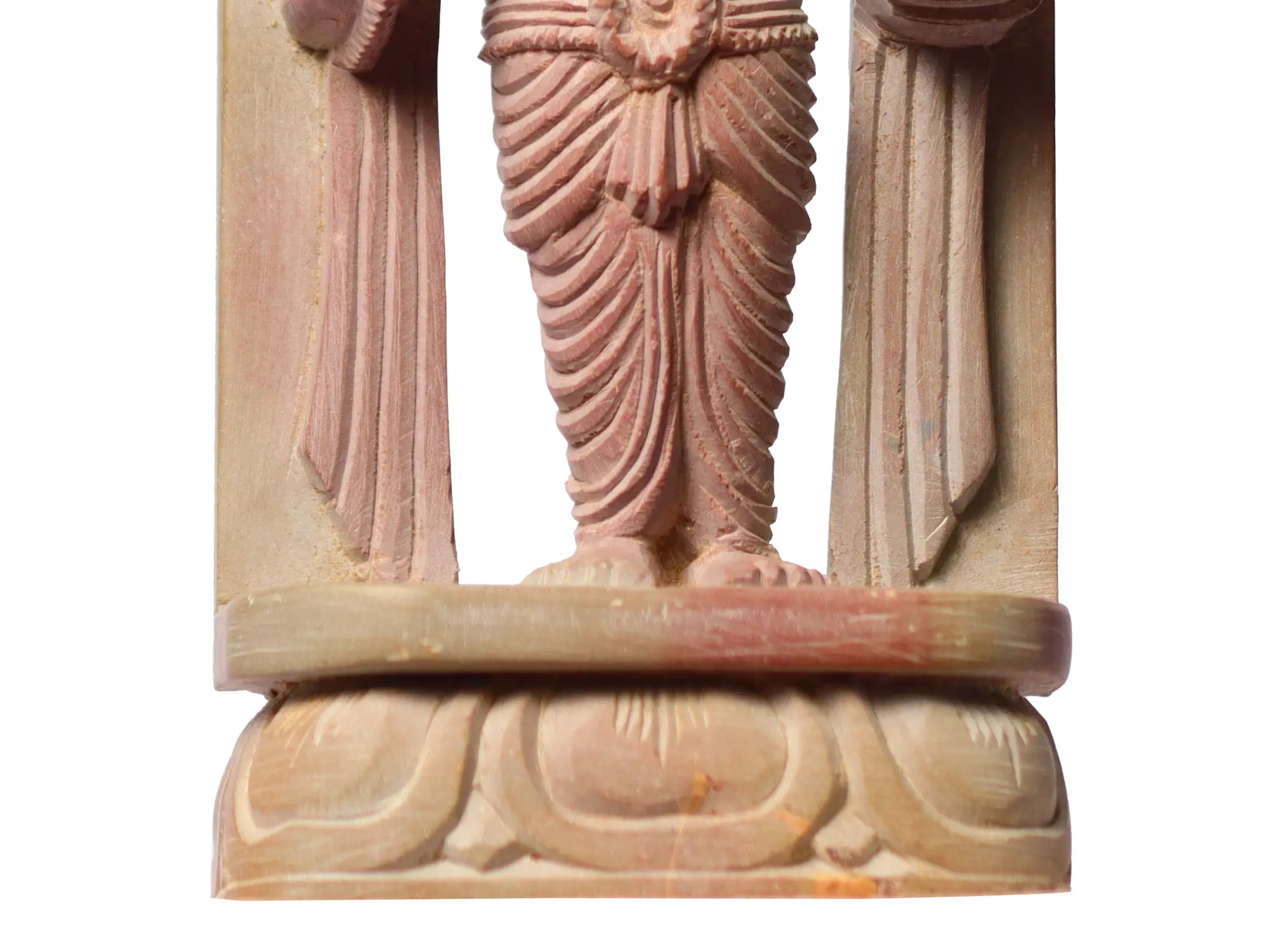 This exquisite statue captures the serene presence of Bhagawan Dhanvantari, the divine physician of the gods and the Hindu deity of Ayurveda. Carved from a beautiful piece of pink stone, this artwork is a testament to the rich artistic traditions of Odisha, India, a region renowned for its masterful stone carving for centuries. The delicate pink hue of the stone lends a gentle warmth and spiritual aura to the piece, making it a focal point of peace and auspiciousness in any setting. Bhagawan Dhanvantari is central to the practice of Ayurveda, the ancient Indian system of medicine and holistic well-being. Legend states that during the Samudra Manthan, the churning of the cosmic ocean, Dhanvantari emerged holding a pot of Amrita, the nectar of immortality. This act symbolizes his role as the bestower of health and longevity, the one who alleviates suffering and promotes vitality. In this finely detailed representation, Dhanvantari stands in a graceful posture, radiating calm and divine authority. He is depicted with serene features, a crown adorning his head, and traditional Indian attire. His hands are held in specific mudras, each signifying a different aspect of his blessings. Often, he is shown holding medicinal herbs or a pot of Amrita, as is the case here, reinforcing his identity as the divine healer. The intricate carving of his garments, the decorative elements, and the auspicious symbols surrounding him speak to the skill and devotion of the artisan. The base itself, often carved to resemble a lotus, a symbol of purity and spiritual awakening, elevates the divine figure. This statue is more than just a decorative item; it is an invocation of health, prosperity, and spiritual balance. Placing it in your home or meditation space is believed to attract positive energies, promote healing, and foster a sense of inner peace. It serves as a constant reminder of the principles of Ayurveda and the importance of caring for both body and mind. Whether as a personal devotional item or a cherished piece of cultural art, this Bhagawan Dhanvantari statue brings a touch of divine grace and ancient wisdom into your life.