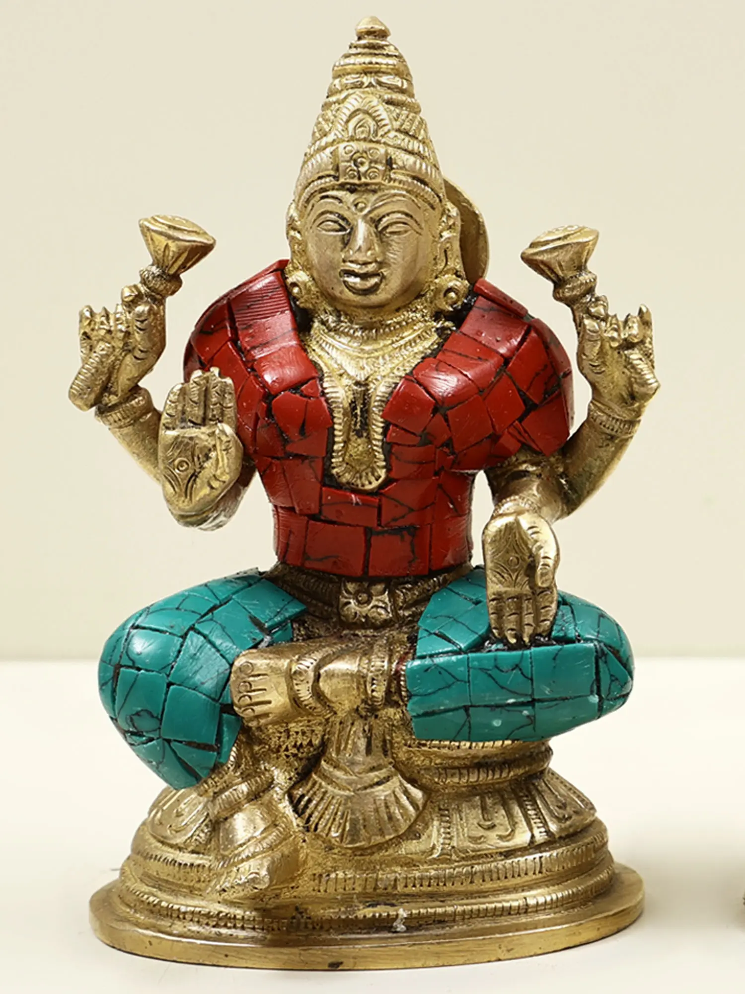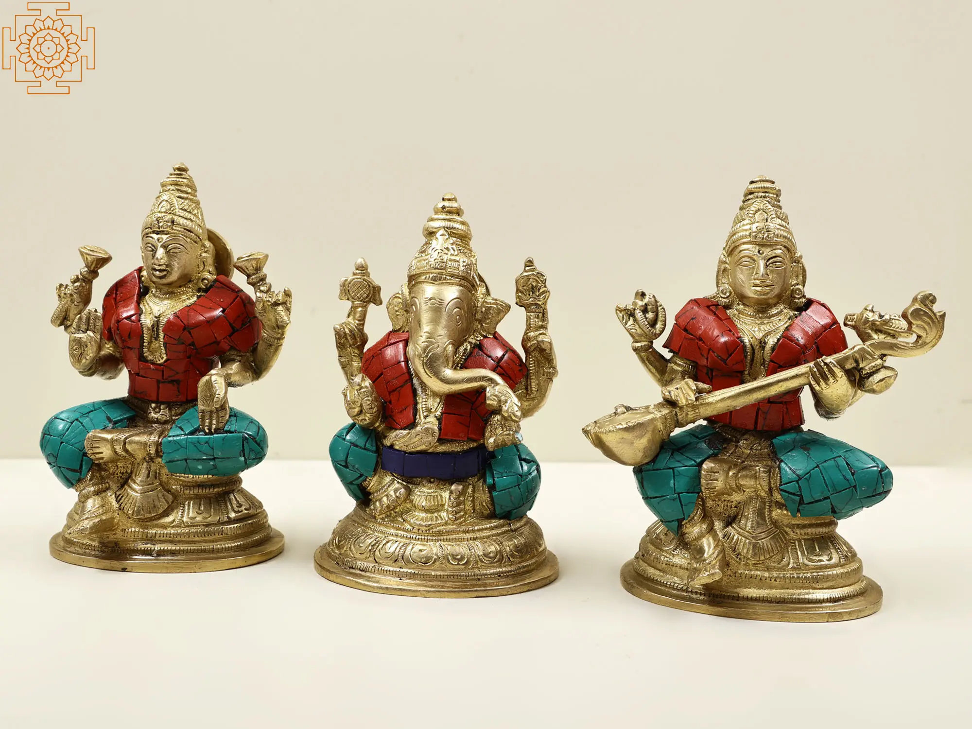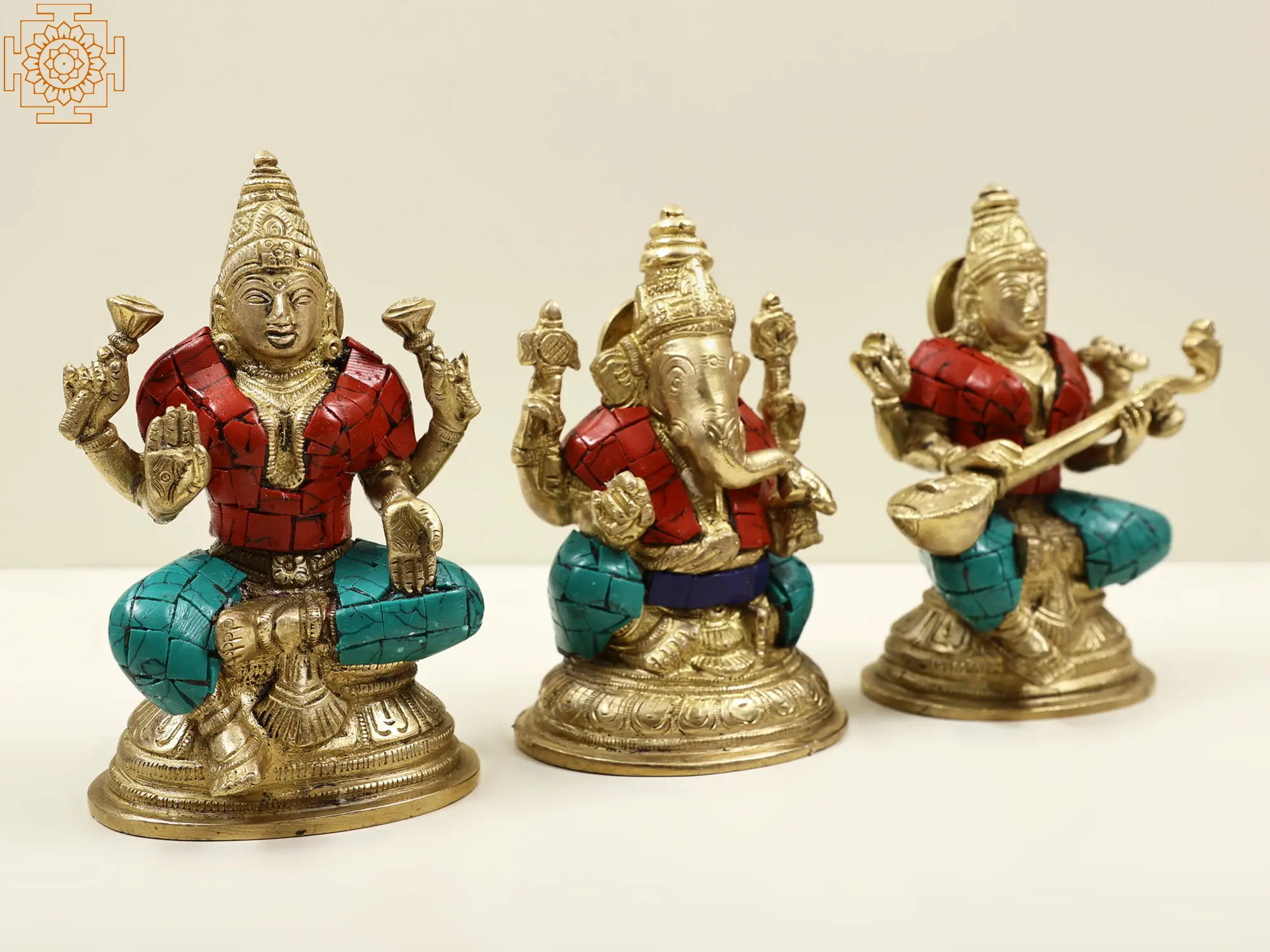 Lakshmi-Ganesha-Saraswati in Hindu culture are deities worshipped together for a wholly fulfilled life. These small brass statues present the trinity seated on their respective thrones, embellished with fine inlay pieces. Lakshmi, Ganesha, and Saraswati are represented by their attributes and iconography, making these idols supremely auspicious for your place of worship.