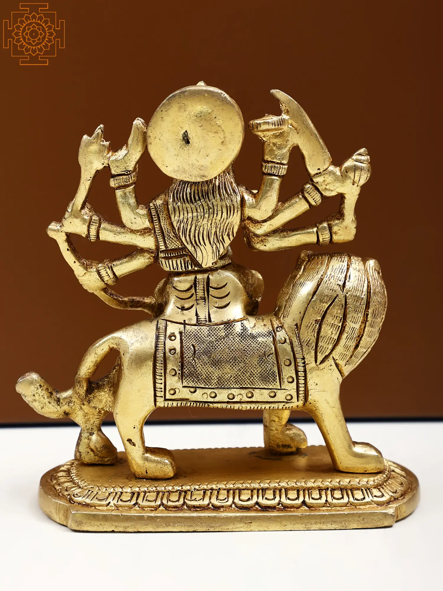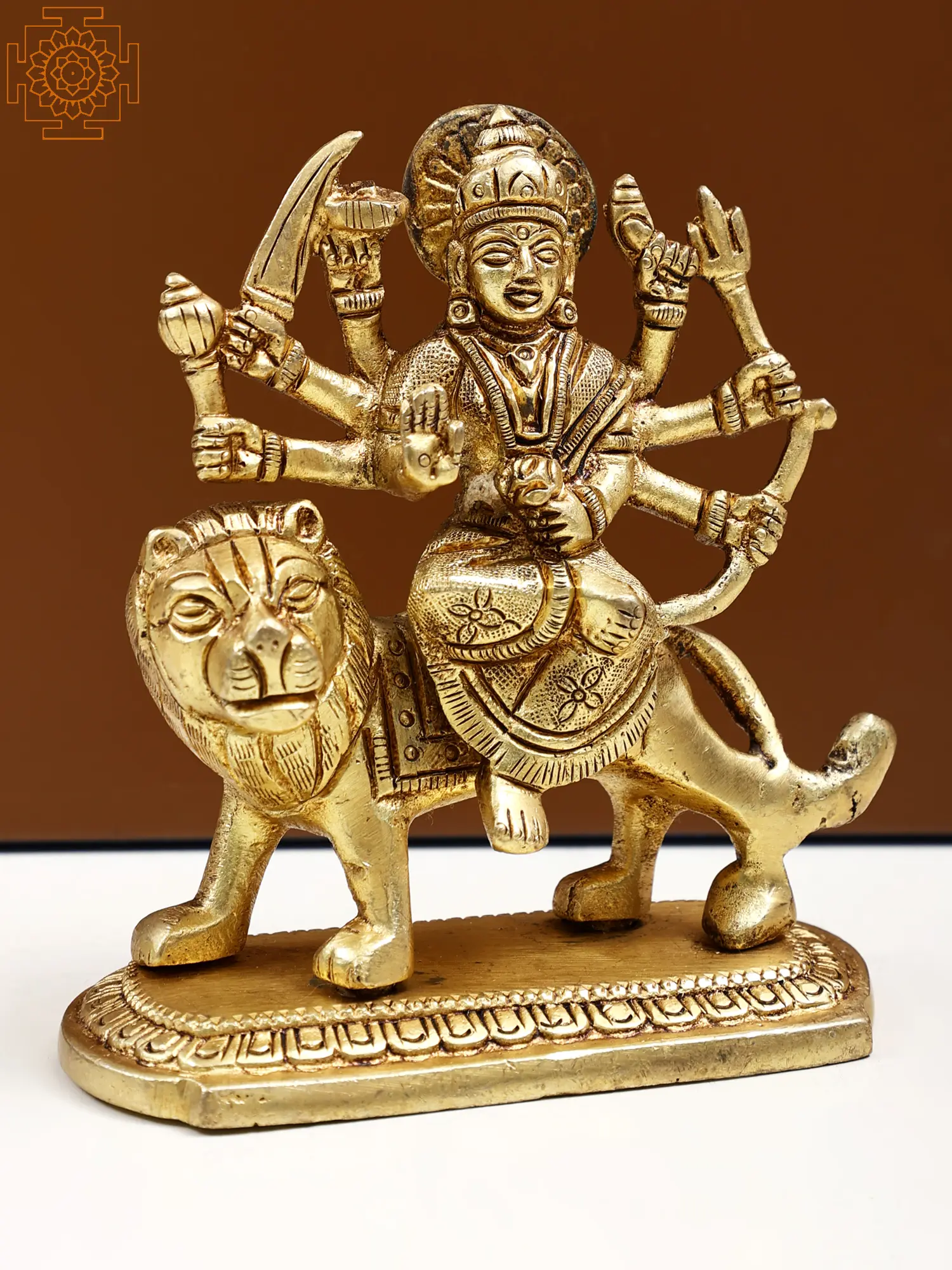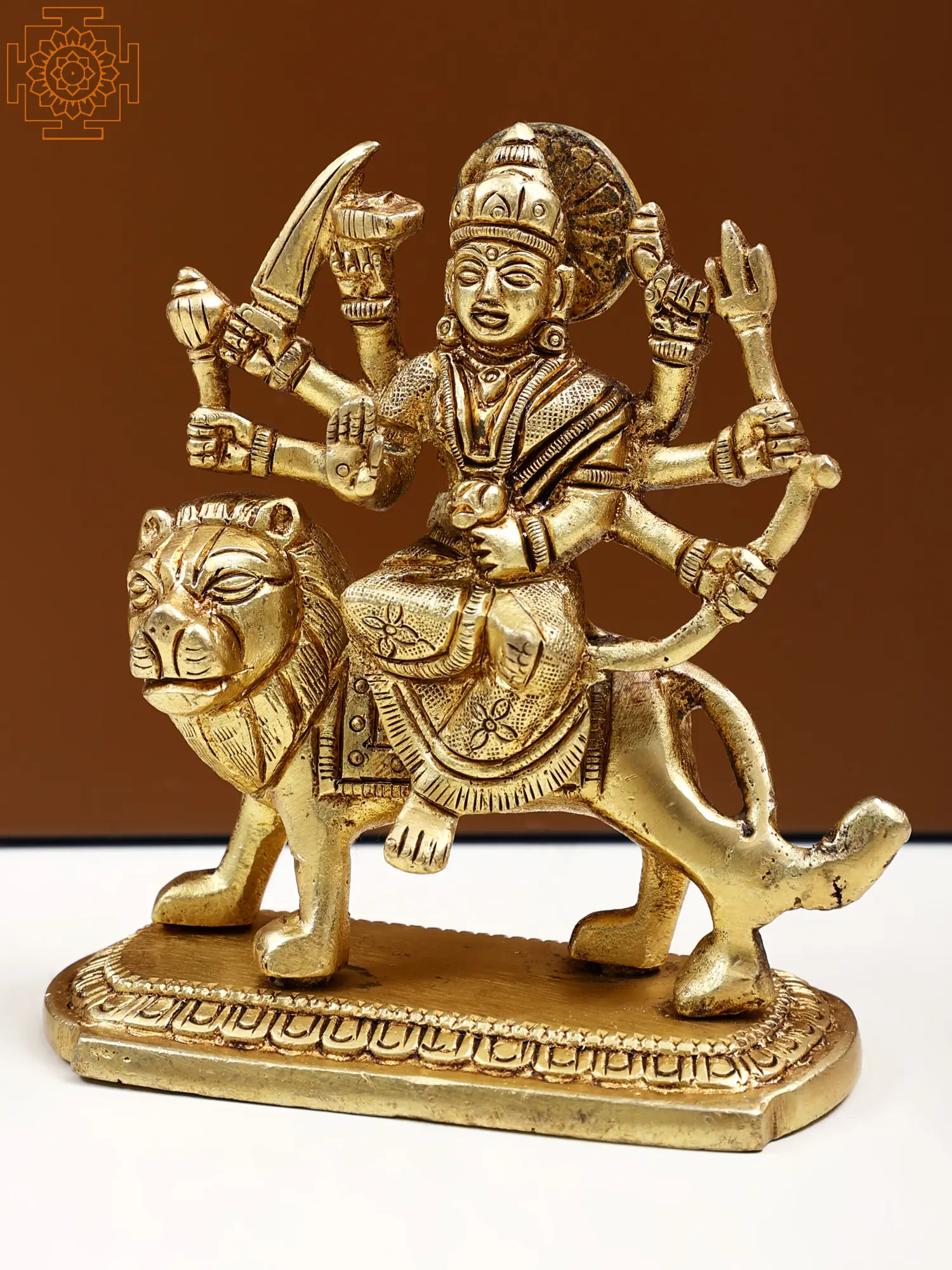 The meticulous small Brass Durga Maa sculpture embodies the fierce aspect of the divine feminine. Durga, the warrior goddess, holds weapons symbolizing her strength to combat negativity. Her ten arms signify her supreme abilities. Riding a lion, she represents courage and victory. Durga's serene face contrasts with her formidable stance, depicting her as both a loving mother and a fierce protector. This artwork captures her transformative energy, reminding us to harness her power within to overcome obstacles and inner struggles.