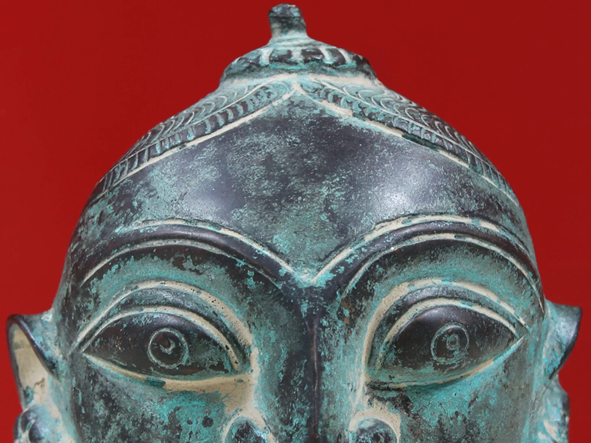 In the region of Maharashtra and Karnataka, the worship of Devi Parvati or Gauri’s head is a prevalent ritual practice. Gauri heads, like this small brass image, are revered by families for generations. The countenance of goddess Parvati is beautifully presented in this Gauri head, with elongated eyes, arched brows, fine nose, smiling lips, and neatly tied hair.