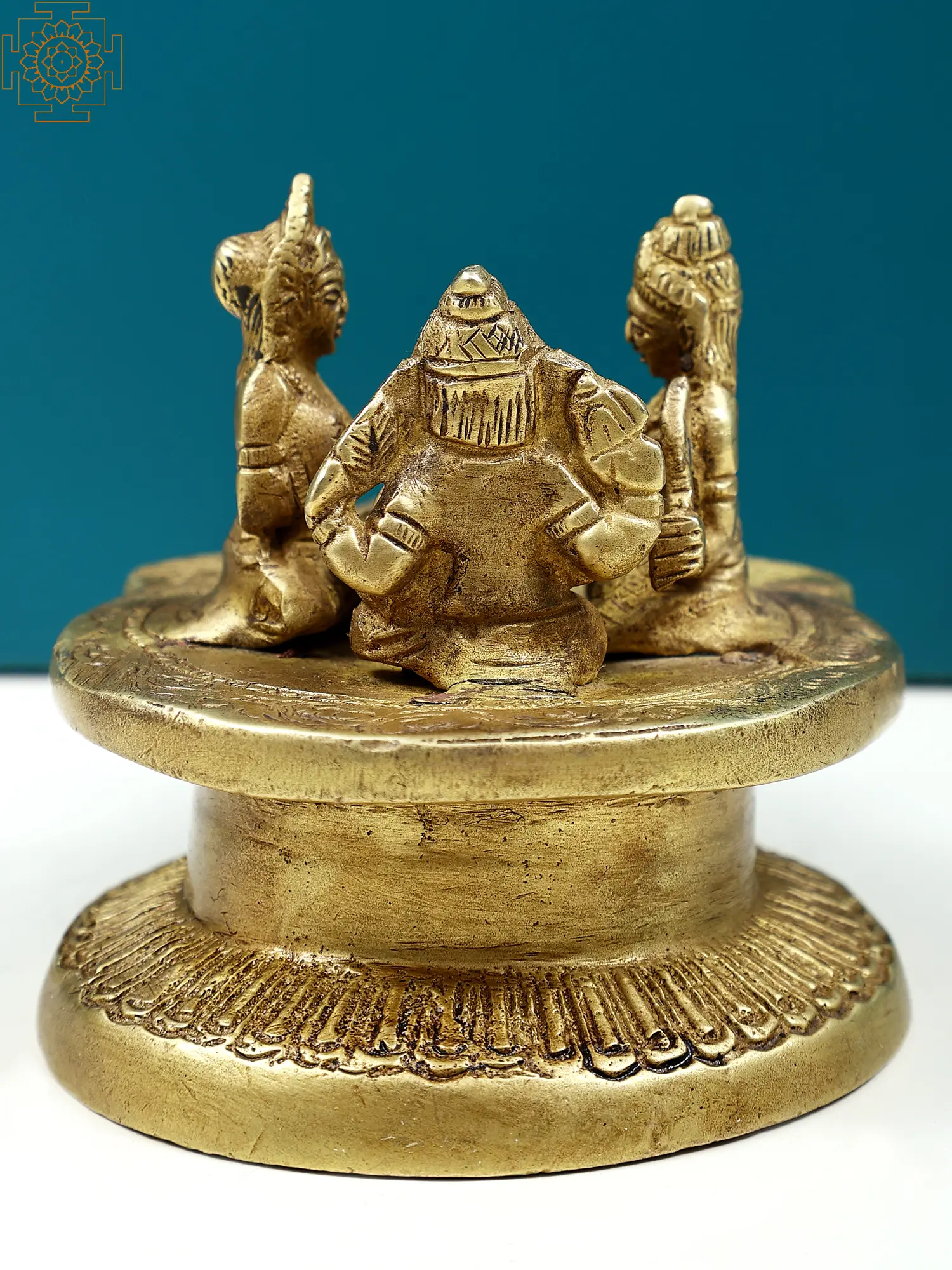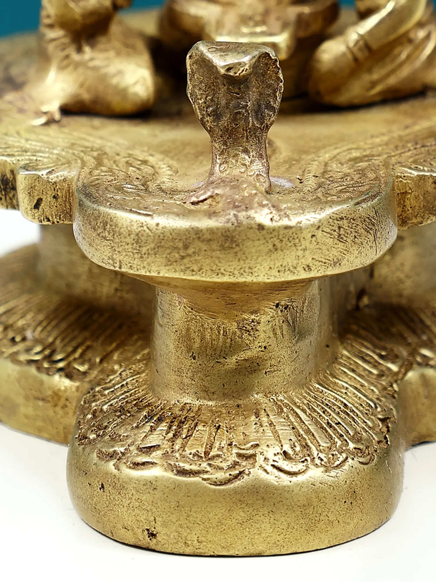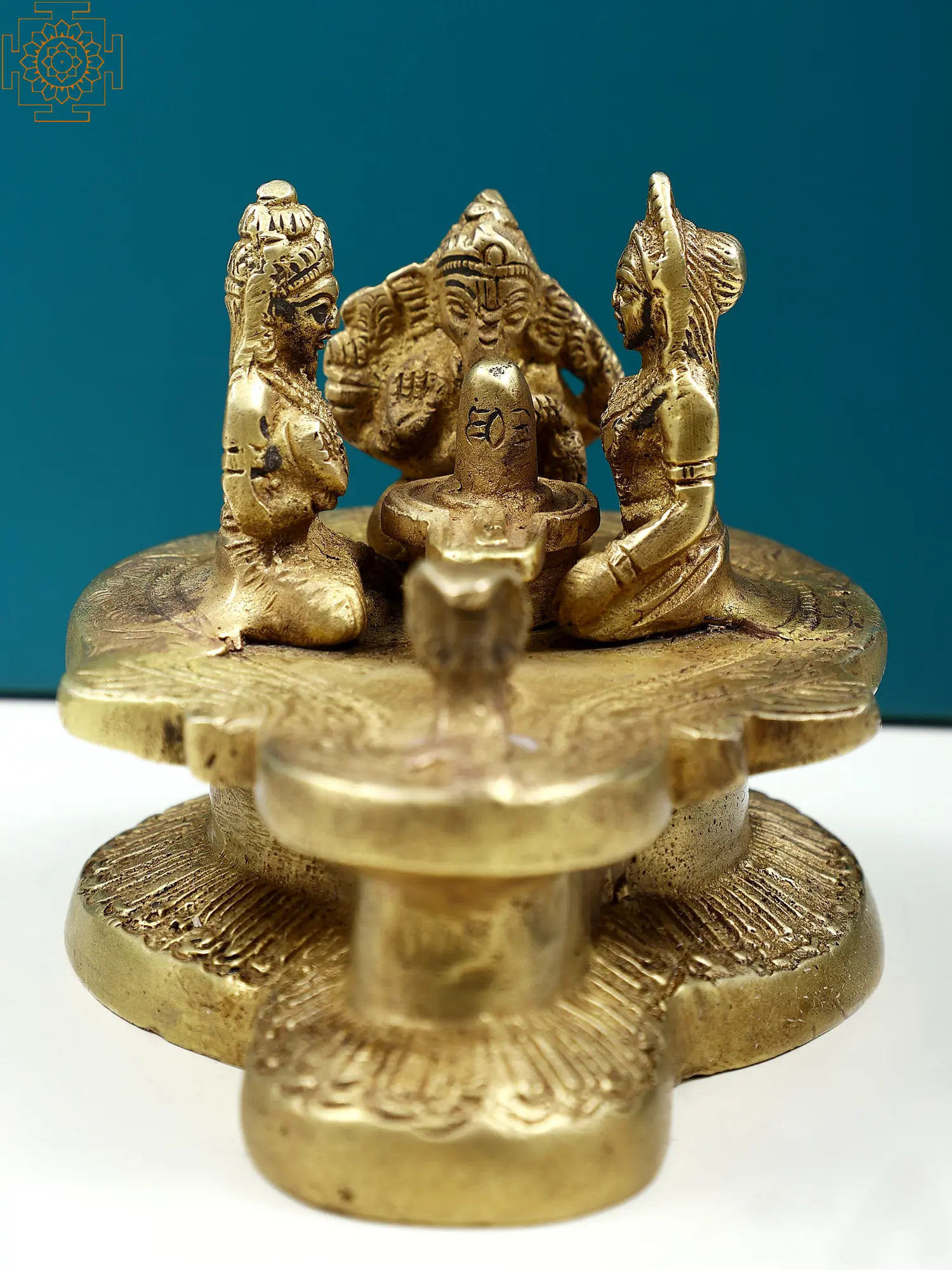 In the ritual of performing Abhishekam or consecration of Shiva, water is supposed to be offered on the Shivalingam and its three sides, as offerings to the Parivaar of Mahadeva who accompanies him eternally. In this small brass Shiva Lingam, the celestial family of Shiva is presented through small images, surrounding Shiva. Ganesha, Parvati, and Karttikeya form a semi-circle on the Vedi of the Lingam, which is adorned by the Naga (serpent) of Shiva and placed on a circular platform, to give you a spiritually rich experience of Shiva-Puja in your place of worship.