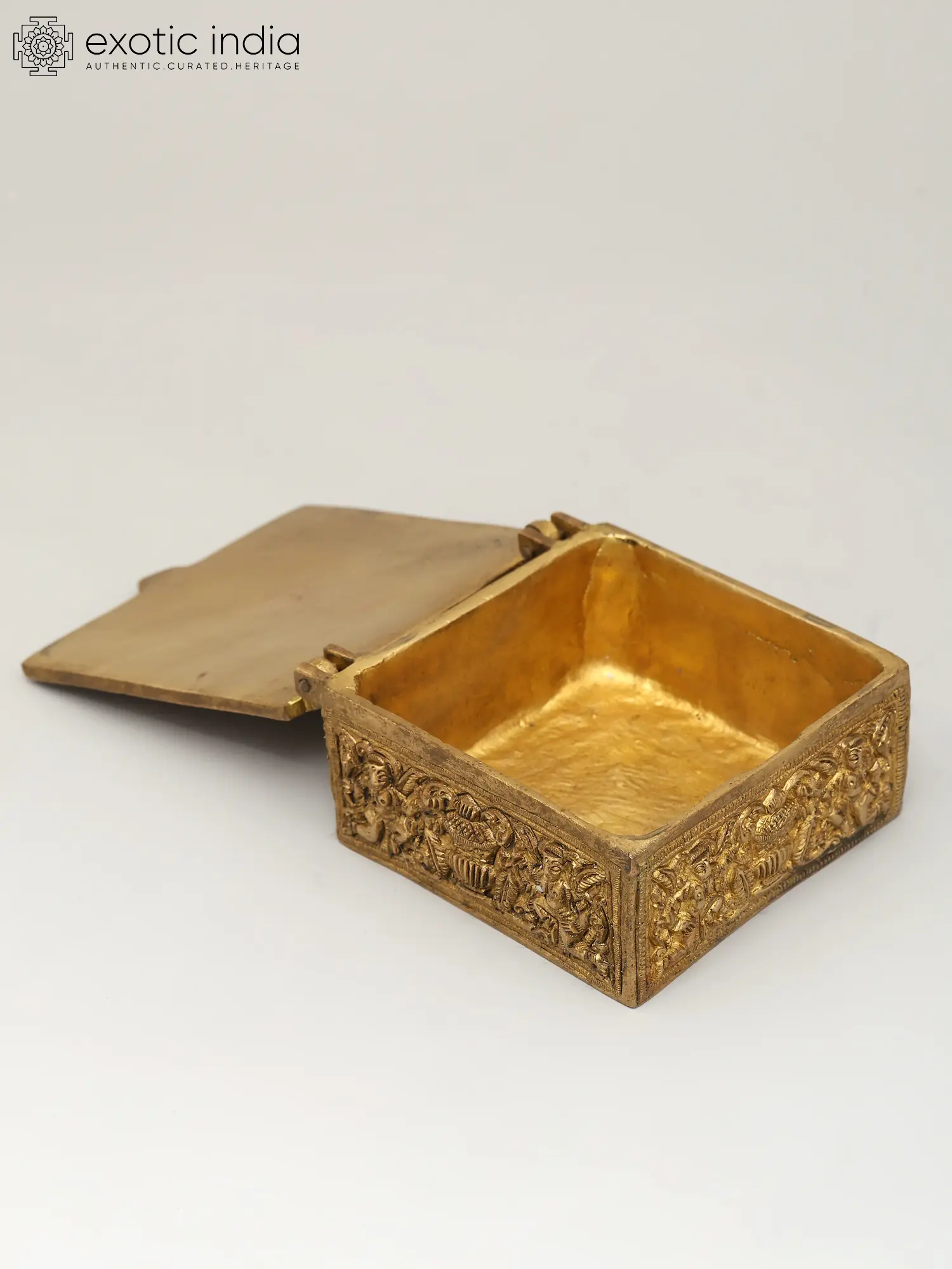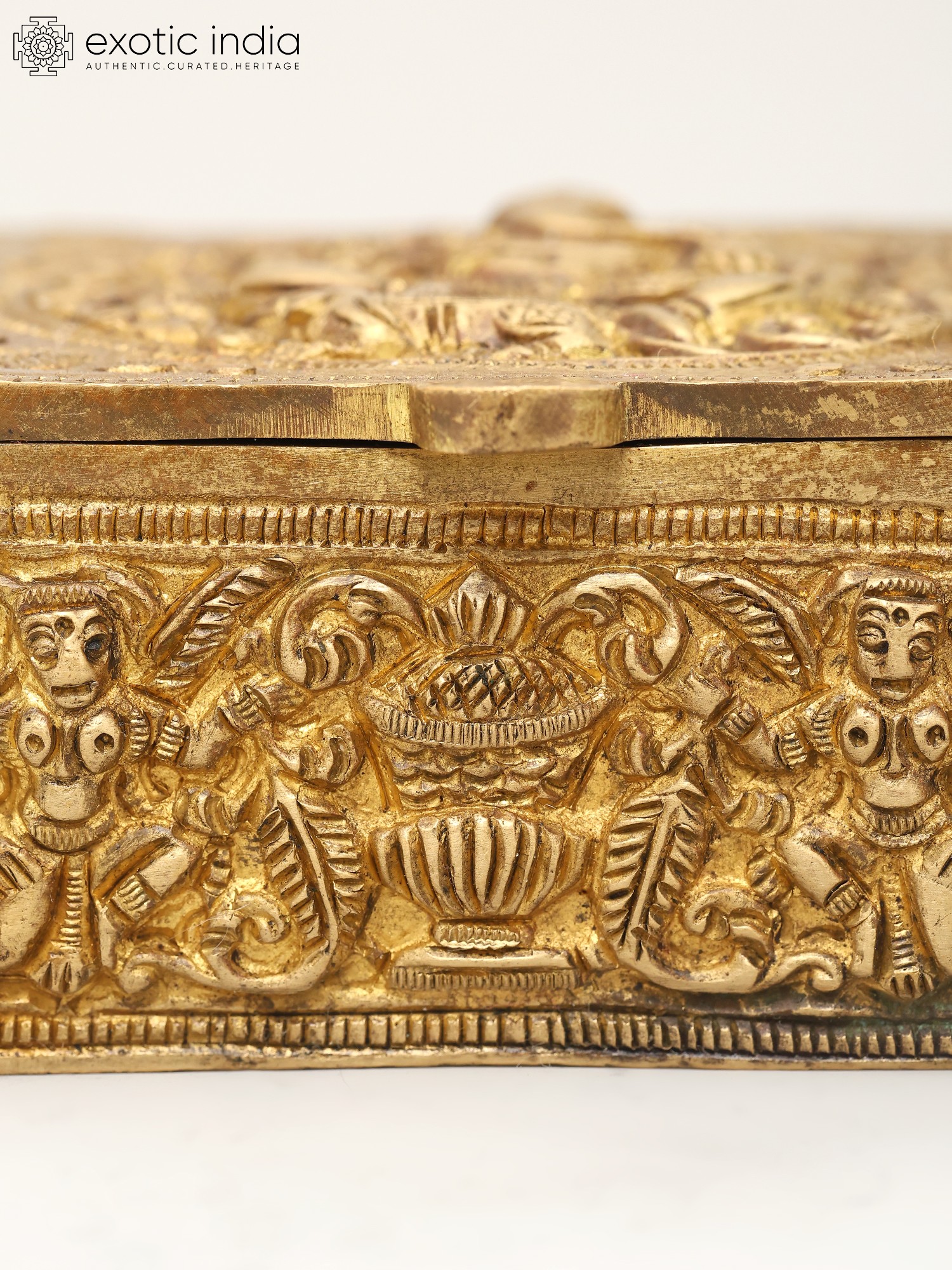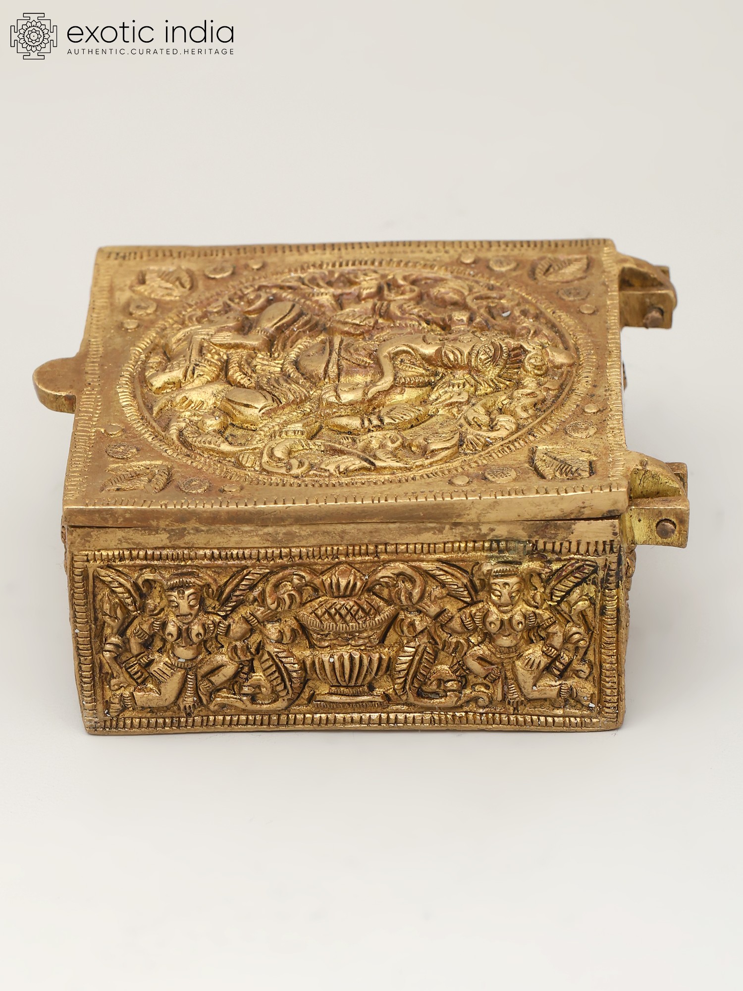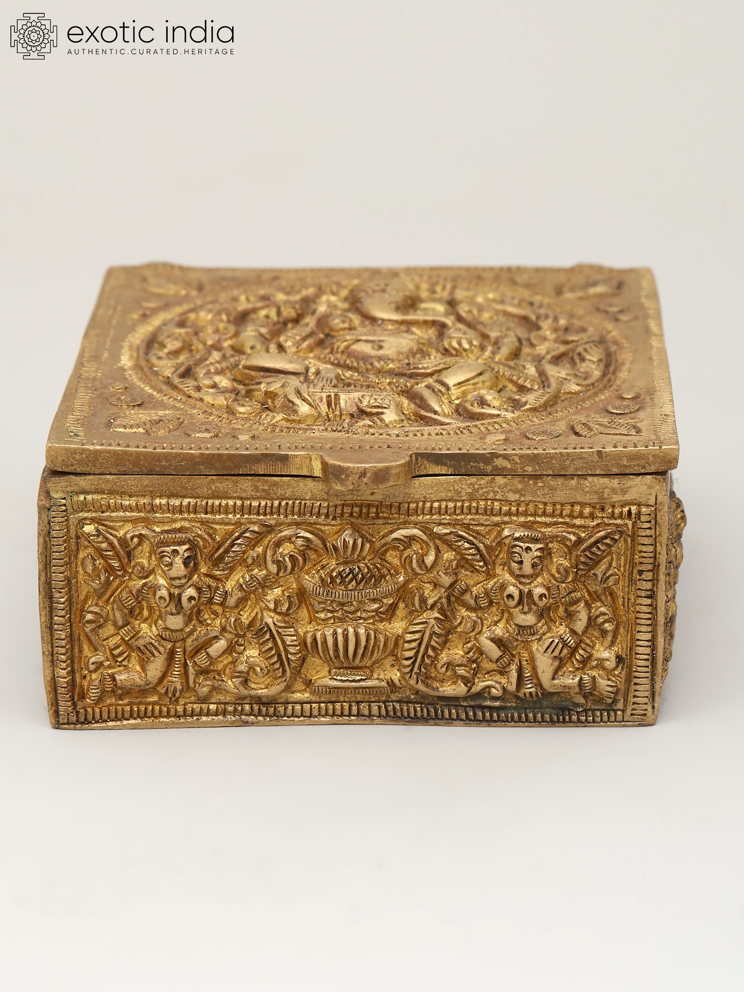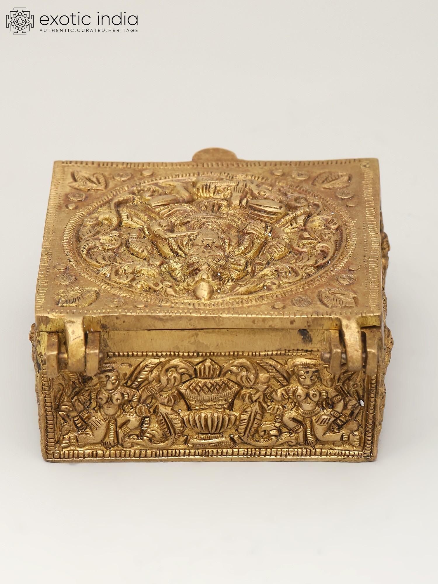 Crafted from gleaming brass, this petite storage box serves as a beautiful and functional object of devotion. Its intricate carvings depict a miniature world of spiritual significance, making it a cherished addition to any altar or sacred space. The warm, golden hue of the brass radiates a sense of timelessness and reverence. Its presence alone can transform a space, inviting contemplation and serenity. This box is ideal for holding precious mementos, sacred objects, or even small offerings, transforming everyday storage into an act of reverence.