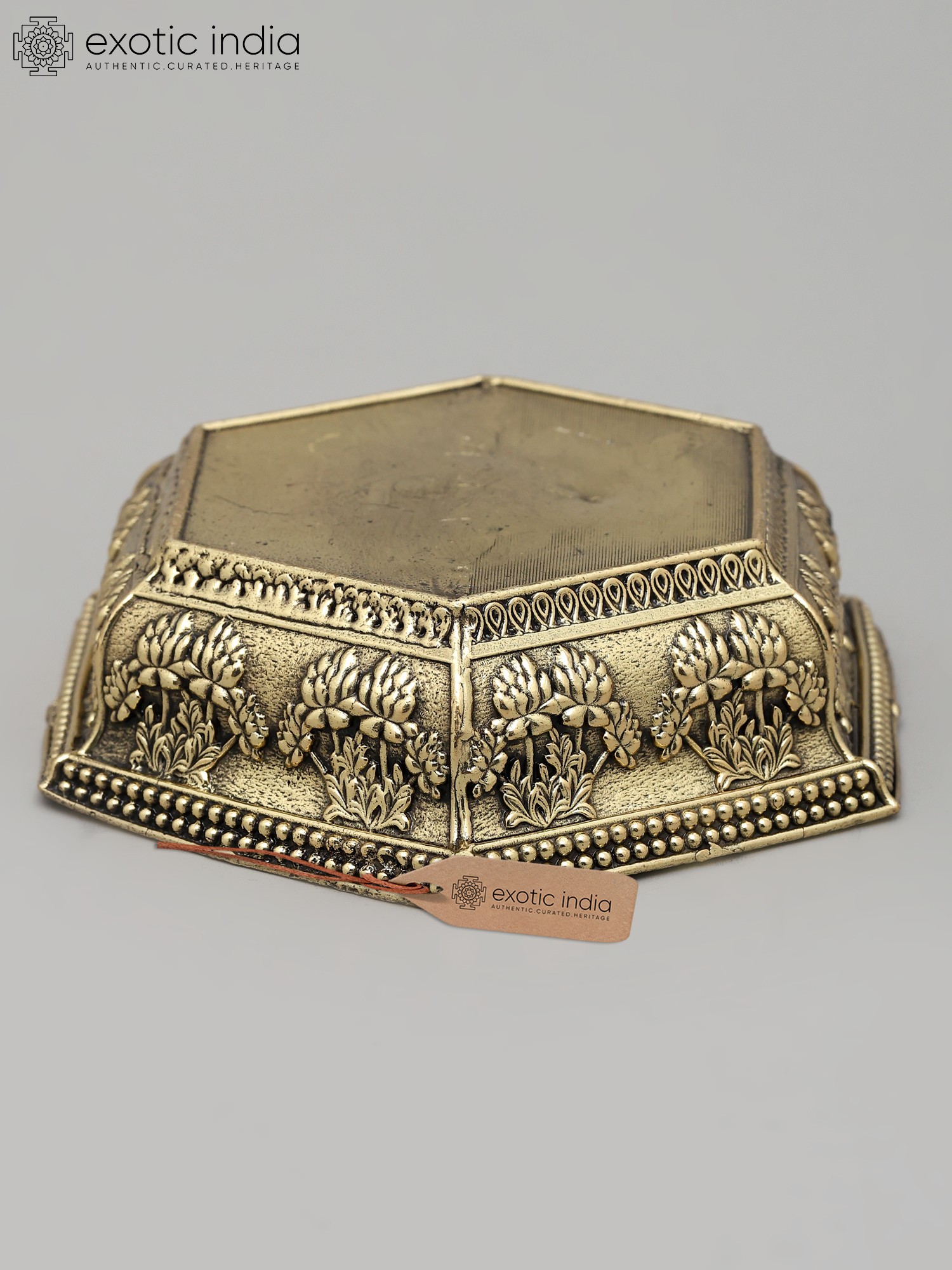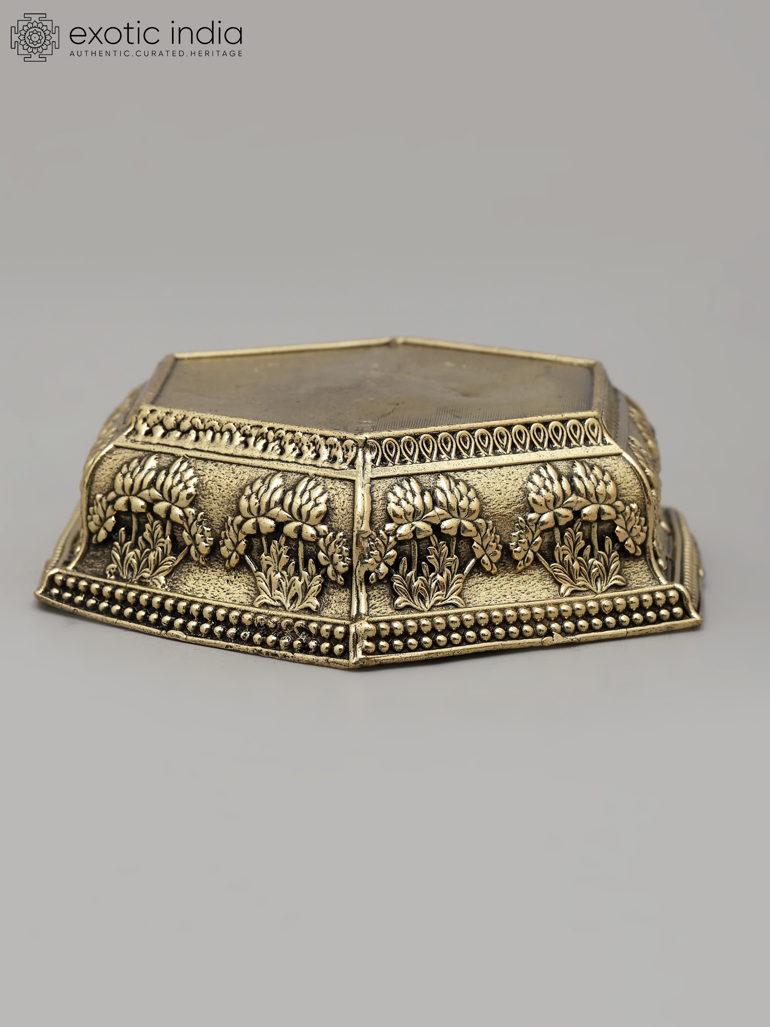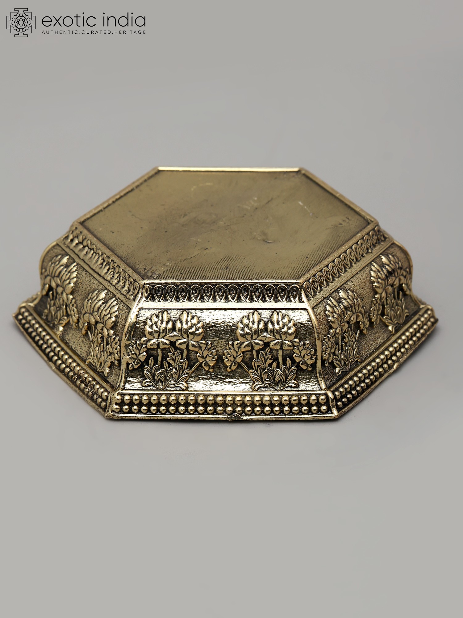 Created from high-quality brass, this pedestal possesses a warm, golden hue that radiates a sense of timelessness and sacredness. The craftsmanship is evident in the precise detailing of the lotus motifs and the smooth, polished surface. The sturdiness of the brass ensures that it can safely and securely support your statues, while the elegant design enhances their visual appeal. Whether you are a seasoned practitioner or just beginning your spiritual journey, this pedestal will be a cherished addition to your home or shrine. Every detail, from the overall shape to the individual lotus petals, is thoughtfully executed, reflecting a deep understanding of artistic tradition and spiritual significance. Bring home this beautiful and functional piece, and let it serve as a constant reminder of the divine presence in your life.