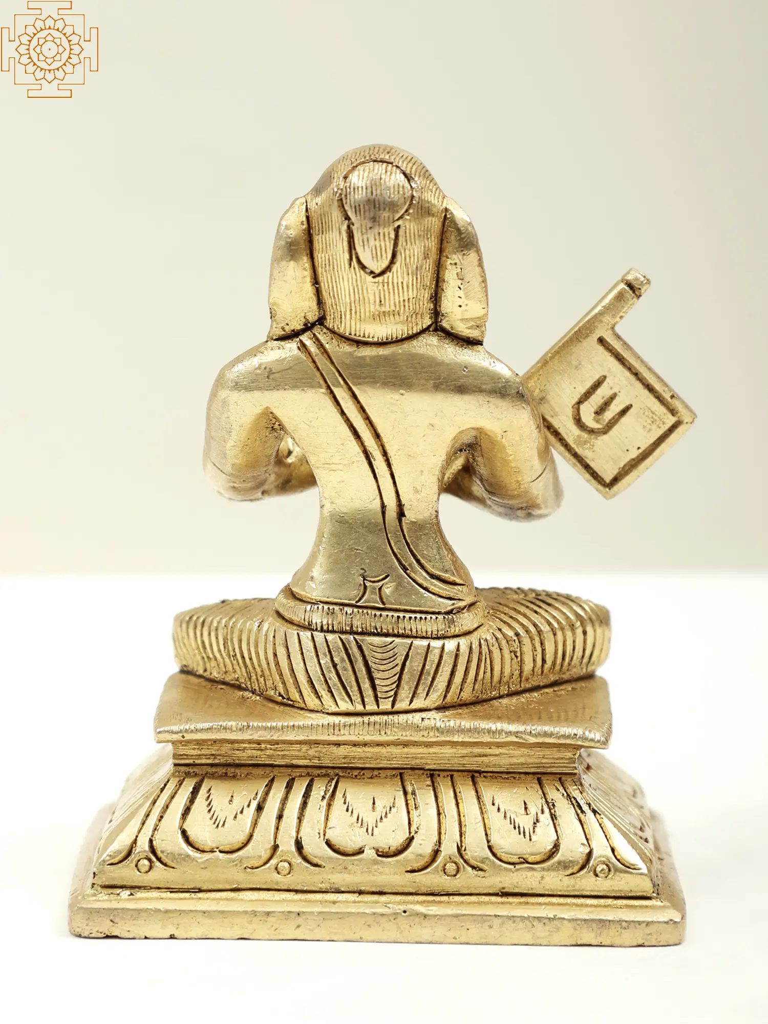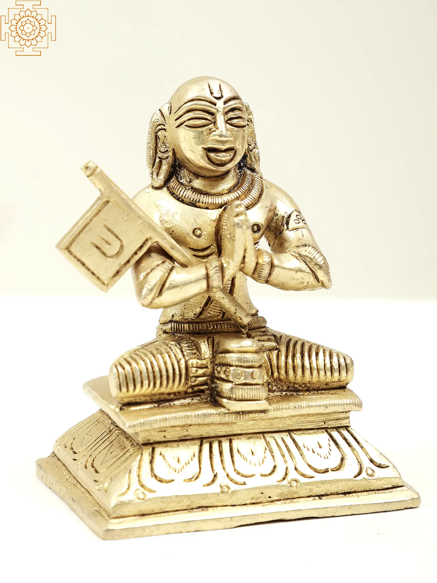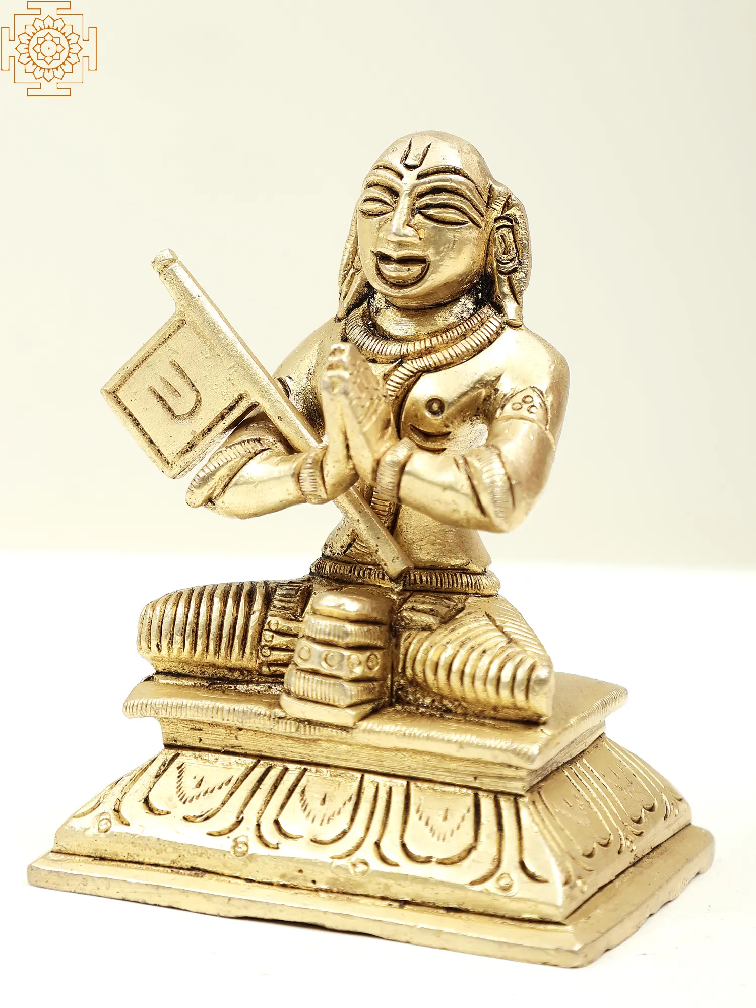 Ramanujan believed that the aatman and parmatman were like the human body and soul. Virtually there is no difference between the two, yet the soul serves the body. This is how the aatman was to serve the Supreme lord. Moksha according to him could be achieved through bhakti (a personal devotion). This brass small statue of Swami Ramanujan shows the great teacher seated with his hands folded in reverence of lord Vishnu, carrying a flag with a Vaishnava symbol drawn on it.