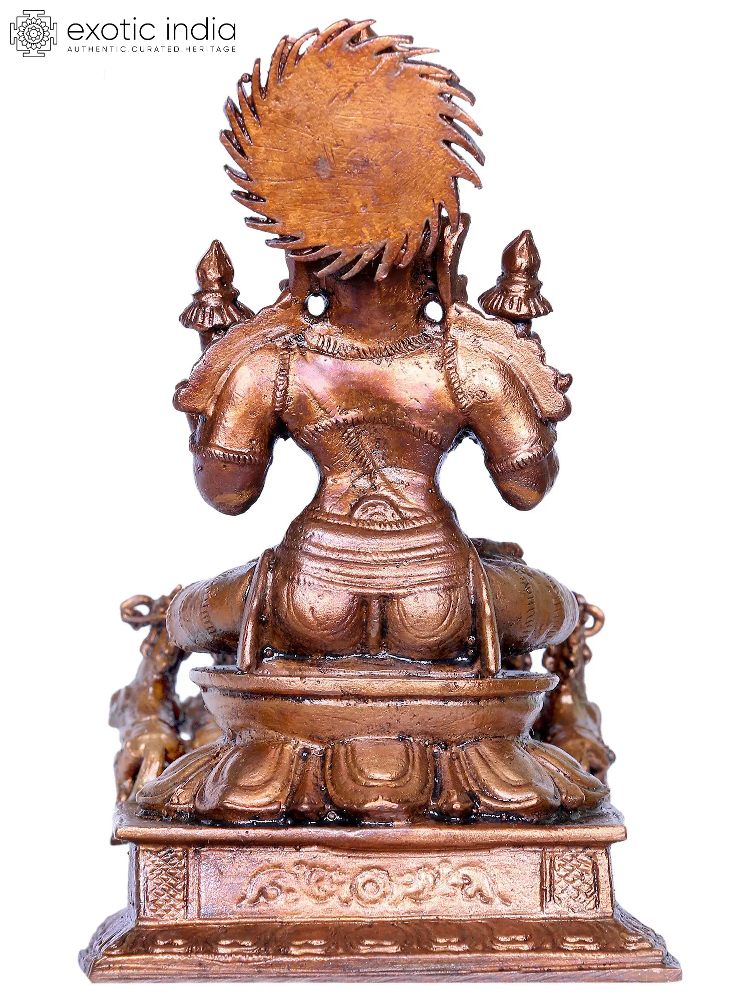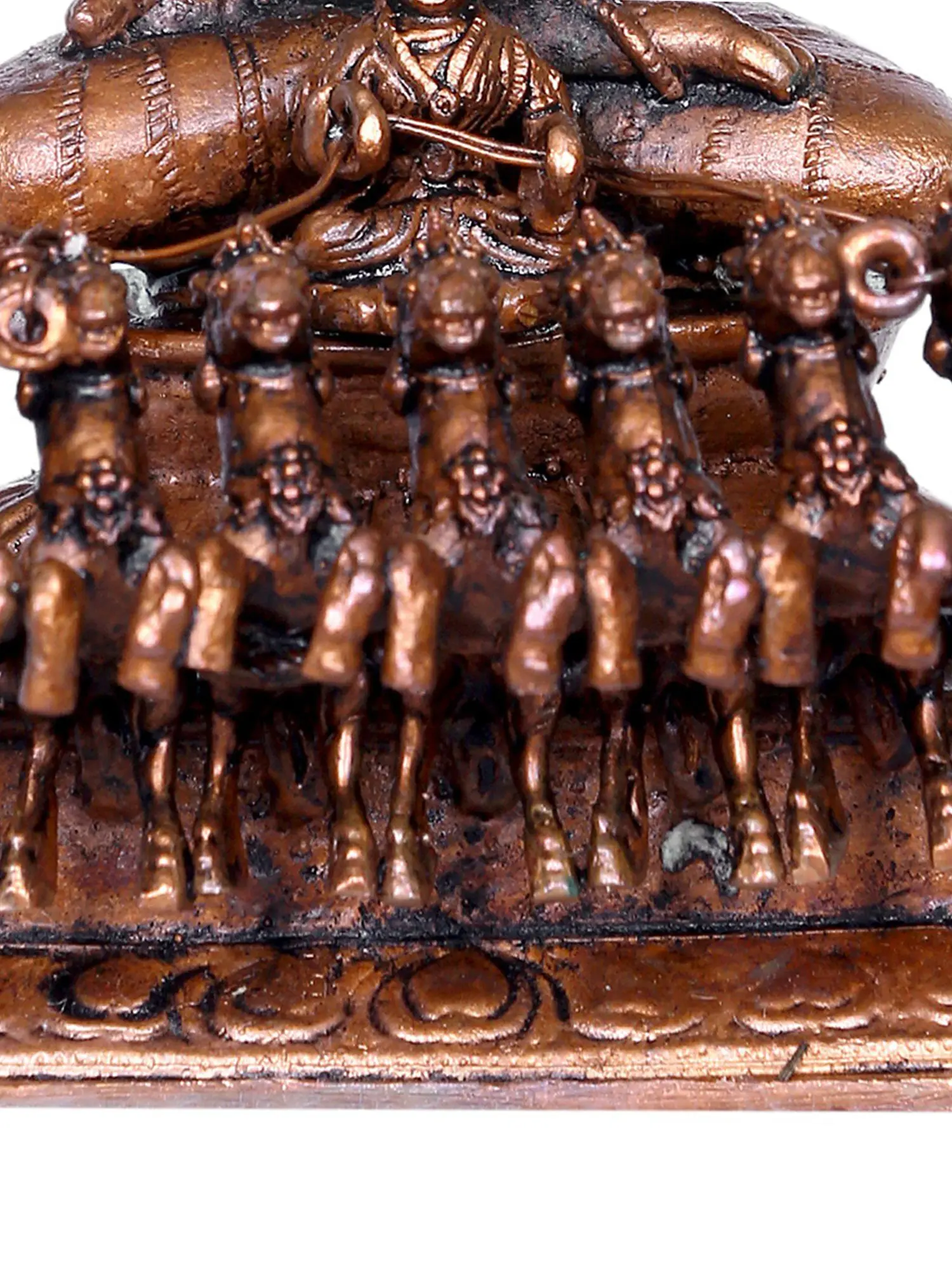 This exquisite bronze idol captures the majestic presence of Lord Surya, the Sun God, as he embarks on his celestial journey. Depicted in a seated posture of regal grace, Surya holds the reins of his magnificent chariot, which is drawn by seven powerful horses. Each horse, rendered with remarkable detail, symbolizes the seven colors of the rainbow and the seven days of the week, underscoring Surya's all-encompassing dominion over time and light. The intricate craftsmanship evident in this statue brings to life the divine energy and benevolent power associated with this revered deity.