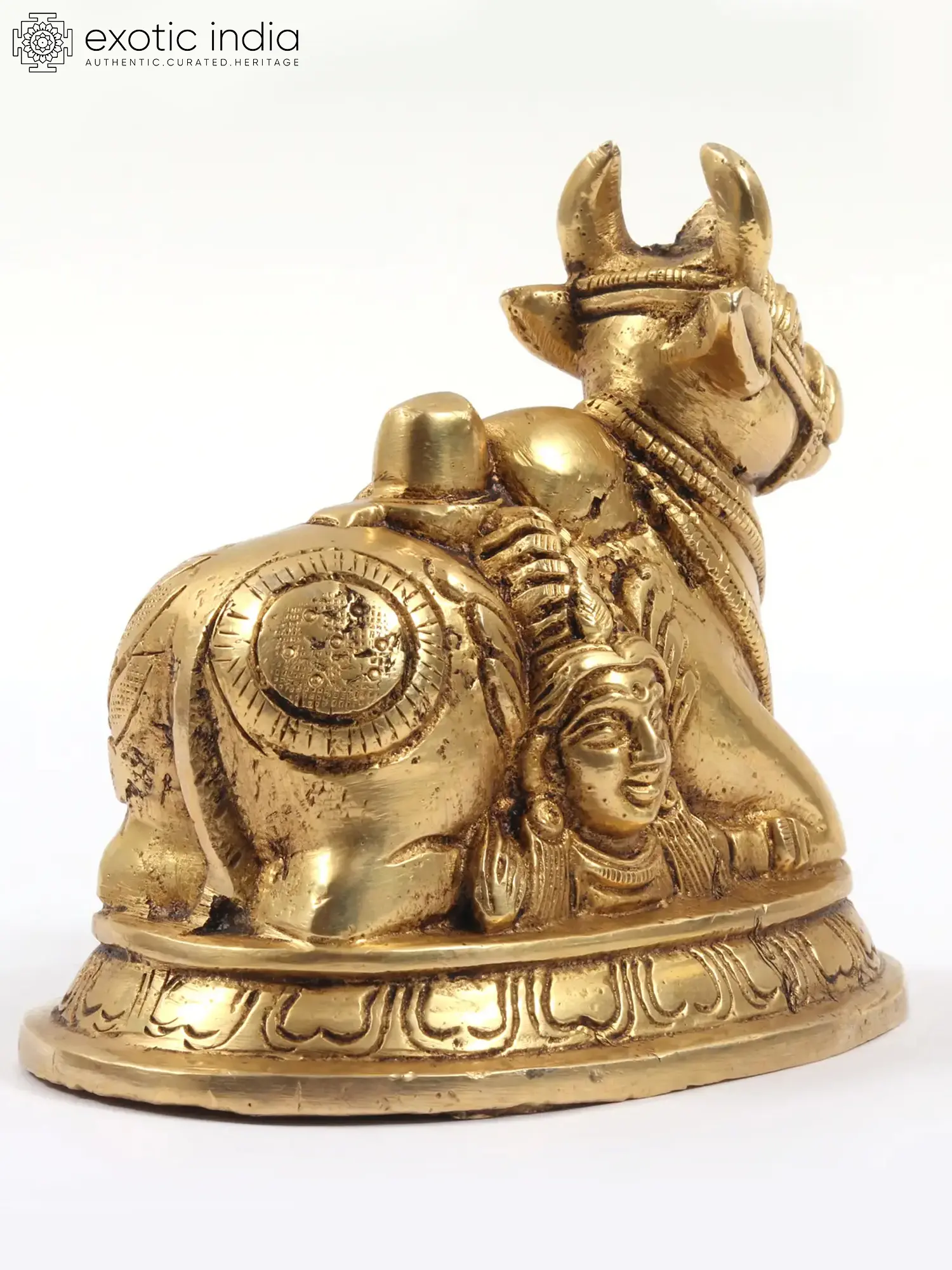 The names Nandi and Lord Shiva and Goddess Parvati are inextricably linked. Nandi, or Lord Nandikeshwara, Lord Shiva's holy mount, is known to be loved as a son by both Shiva and Parvati. According to legend, he adored Goddess Parvati's scolding’s and would always follow Lord Shiva. He is also the messenger who brings the devotees' wishes to them. Saying your wishes in his ears is a ritual. The representation of the deities faces on both sides of his back in this Small Carved Shiva Parvati on Nandi statue made of brass shows his attachment with the deities. It is apparent that everywhere Nadikeshwara goes, he carries the thoughts of his loving holy couple with him.