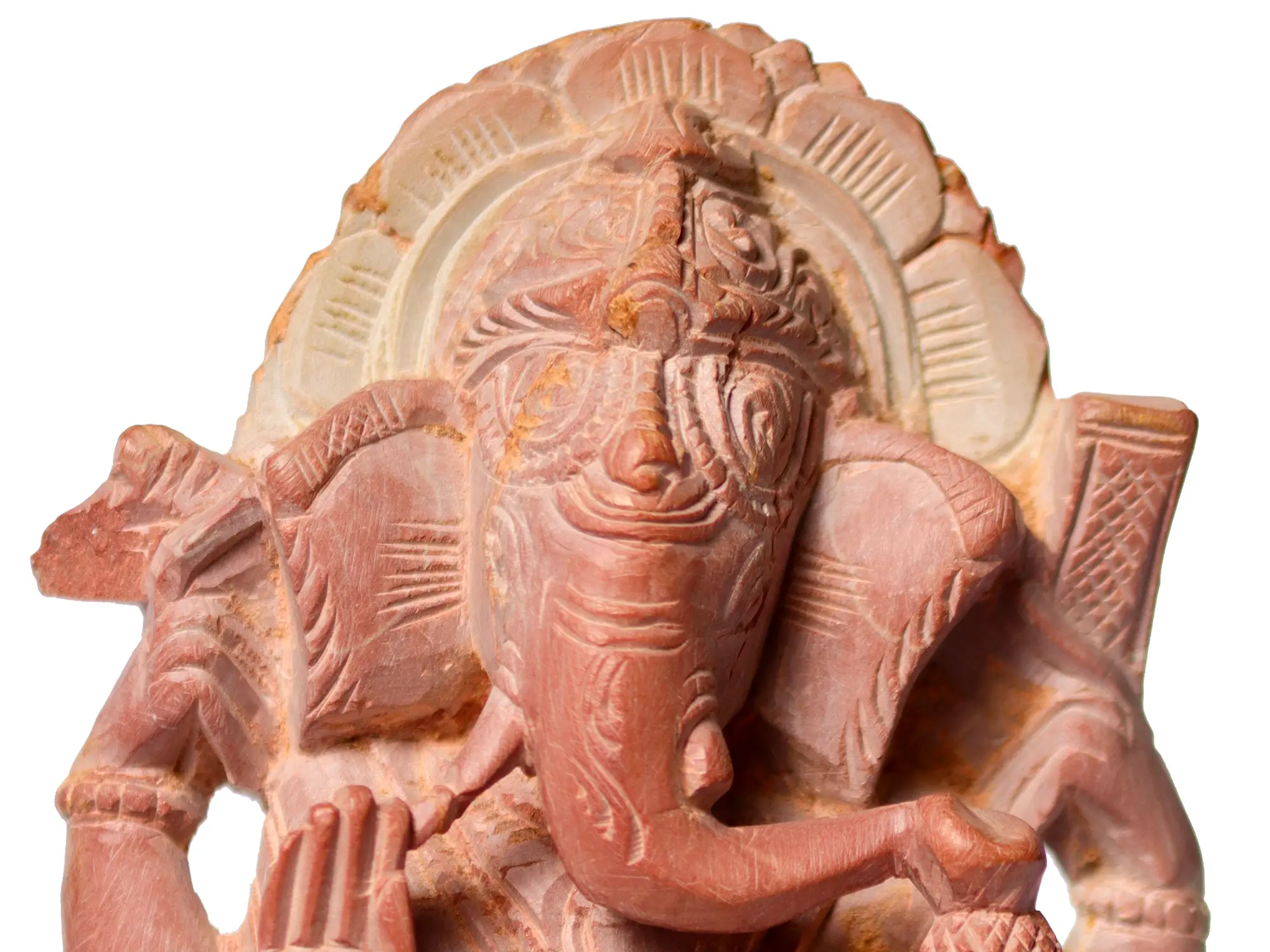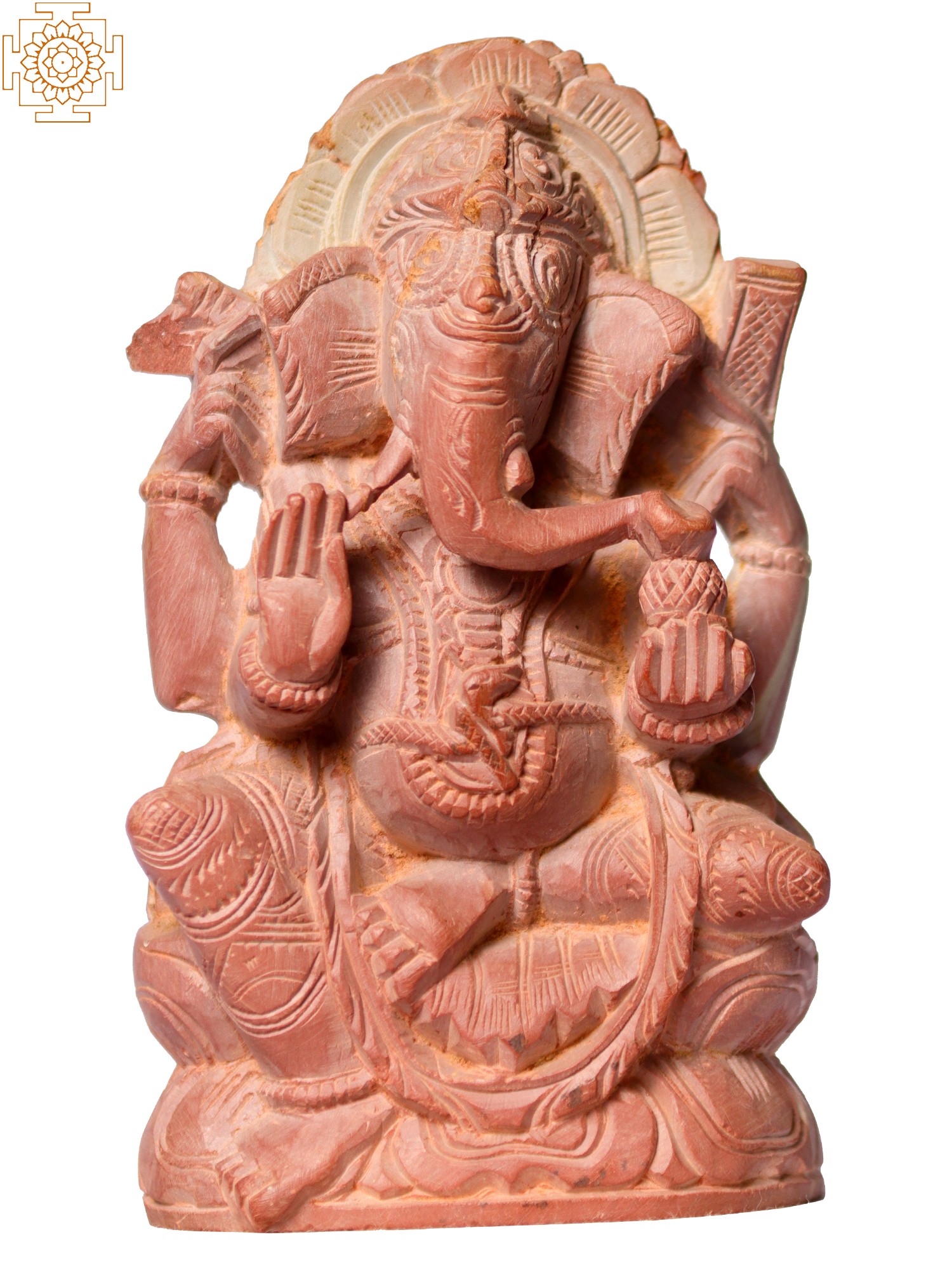 Invite the auspicious presence of Lord Ganesha into your home with this exquisitely carved Chaturbhuja Ganesha idol. Crafted from radiant pink stone, this divine representation captures the essence of wisdom, prosperity, and good fortune. The "Chaturbhuja" signifies the four arms of Ganesha, each carrying symbolic objects that represent his divine powers and purpose. In one hand, he often holds a goad, symbolizing control over the mind and the path to enlightenment. Another hand might offer a noose, representing the means to capture obstacles and negative influences. A third hand, often raised in a gesture of blessing (Abhaya Mudra), dispels fear and offers protection. The fourth hand, frequently seen holding a modak (a sweet delicacy), signifies the sweetness of spiritual realization and the rewards of devotion.