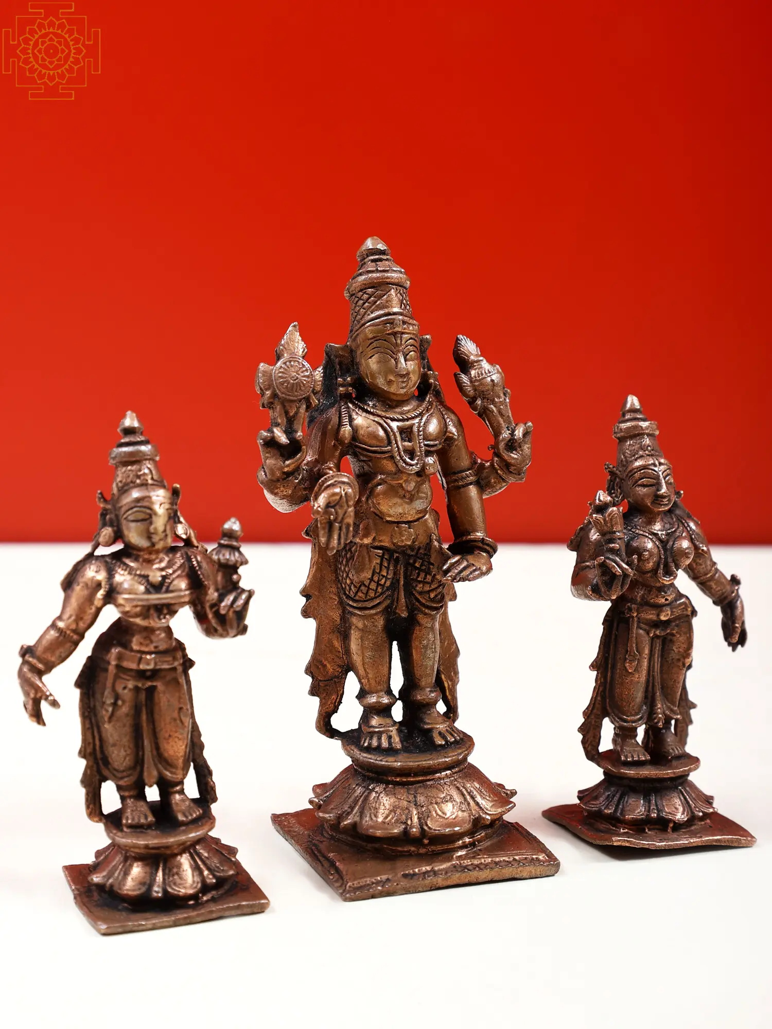 3" Small Hindu Deity Vishnu with Sridevi and Bhudevi | Copper Statue