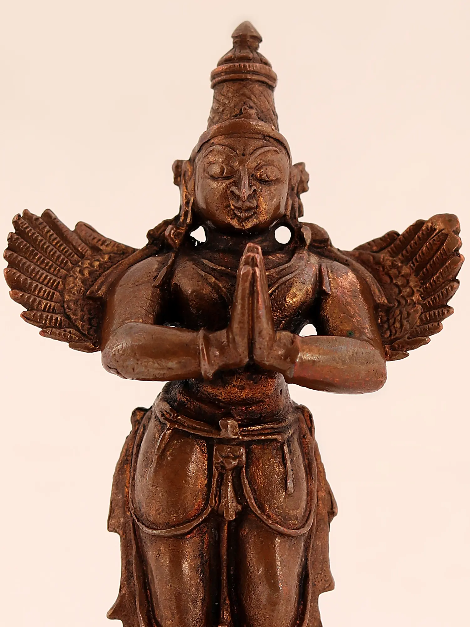 Garuda, the king of birds and the sacred bird mount of Sri Vishnu is depicted in this copper statue with his hands folded in a sign of devotion. A Vaishnava Kiritamukuta crown, a dhoti with its tassels defined beautifully, and delicate ornaments adorn the figure of the celestial vahana of the mighty protector lord. Revered in the Vaishnava Bhakti tradition as the foremost Bhaktas of Vishnu, who is eternally focused on the lotus feet of Narayana, this iconography of Garuda is inspired by his icons from the sanctum sanctorum, where the heavenly bird stands eternally in the court of Narayana.