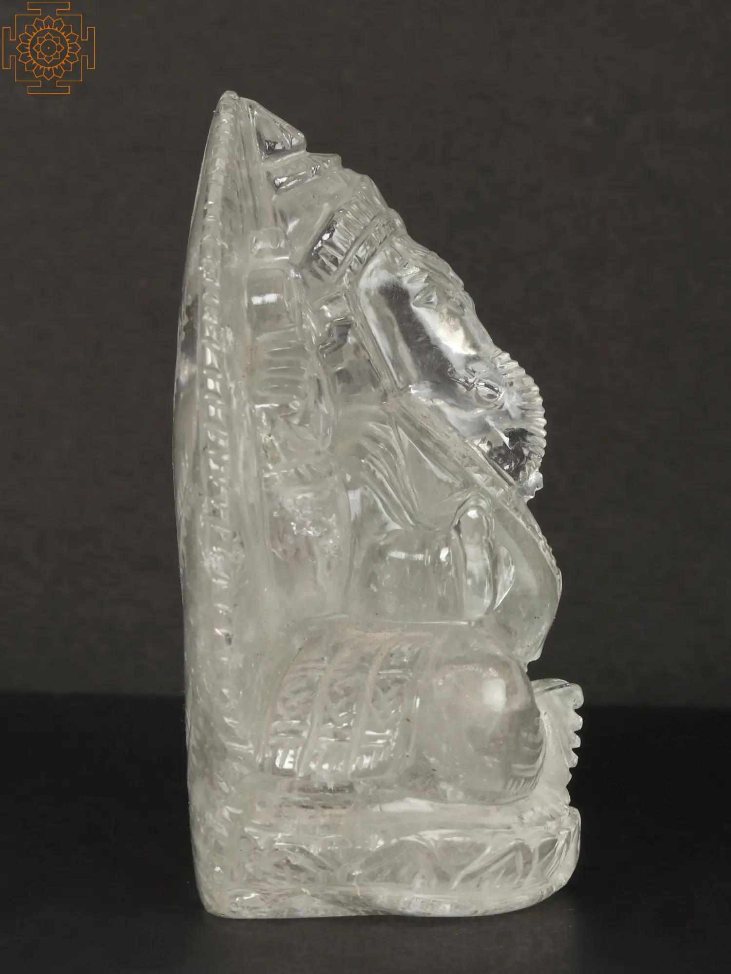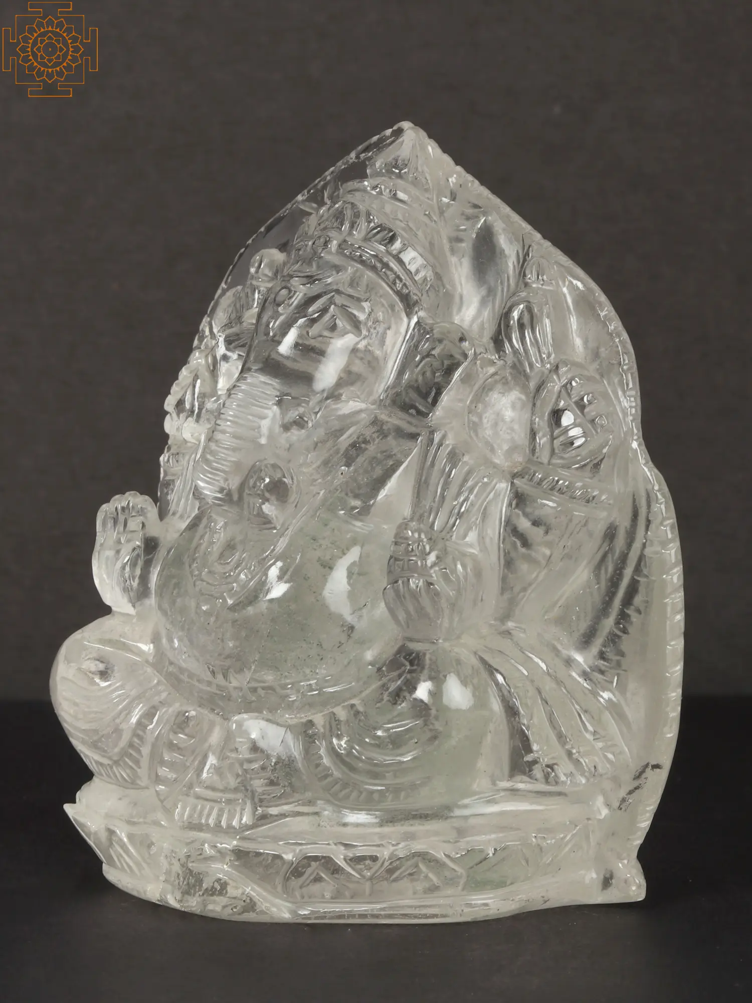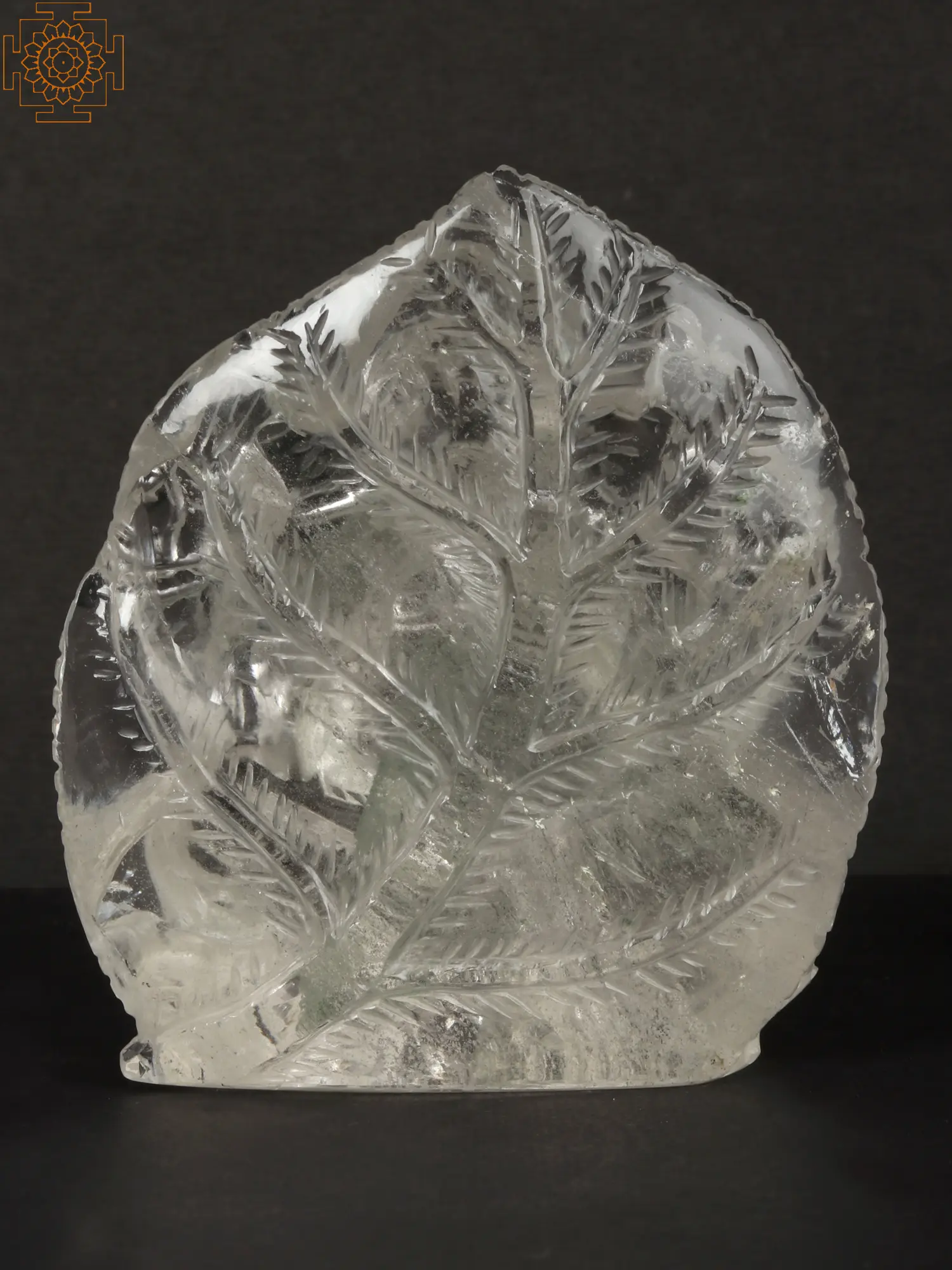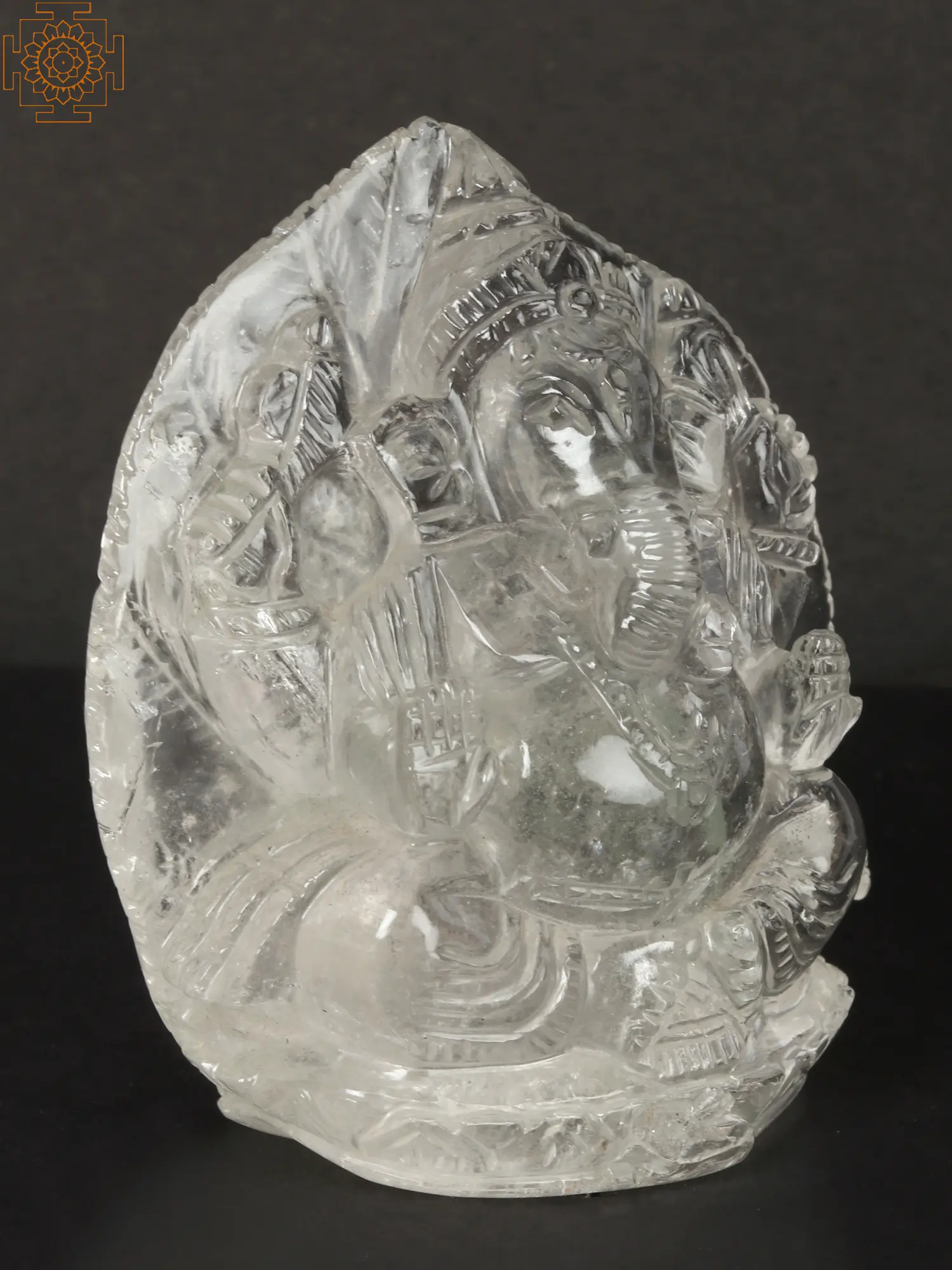 The plump form of Ganesha is as if nestled in a gigantic leaf. This aspect of the work sets it apart from your run-of-the-mill crystal Ganesha sculptures. Even the venation has been delicately sculpted into the crystal medium.